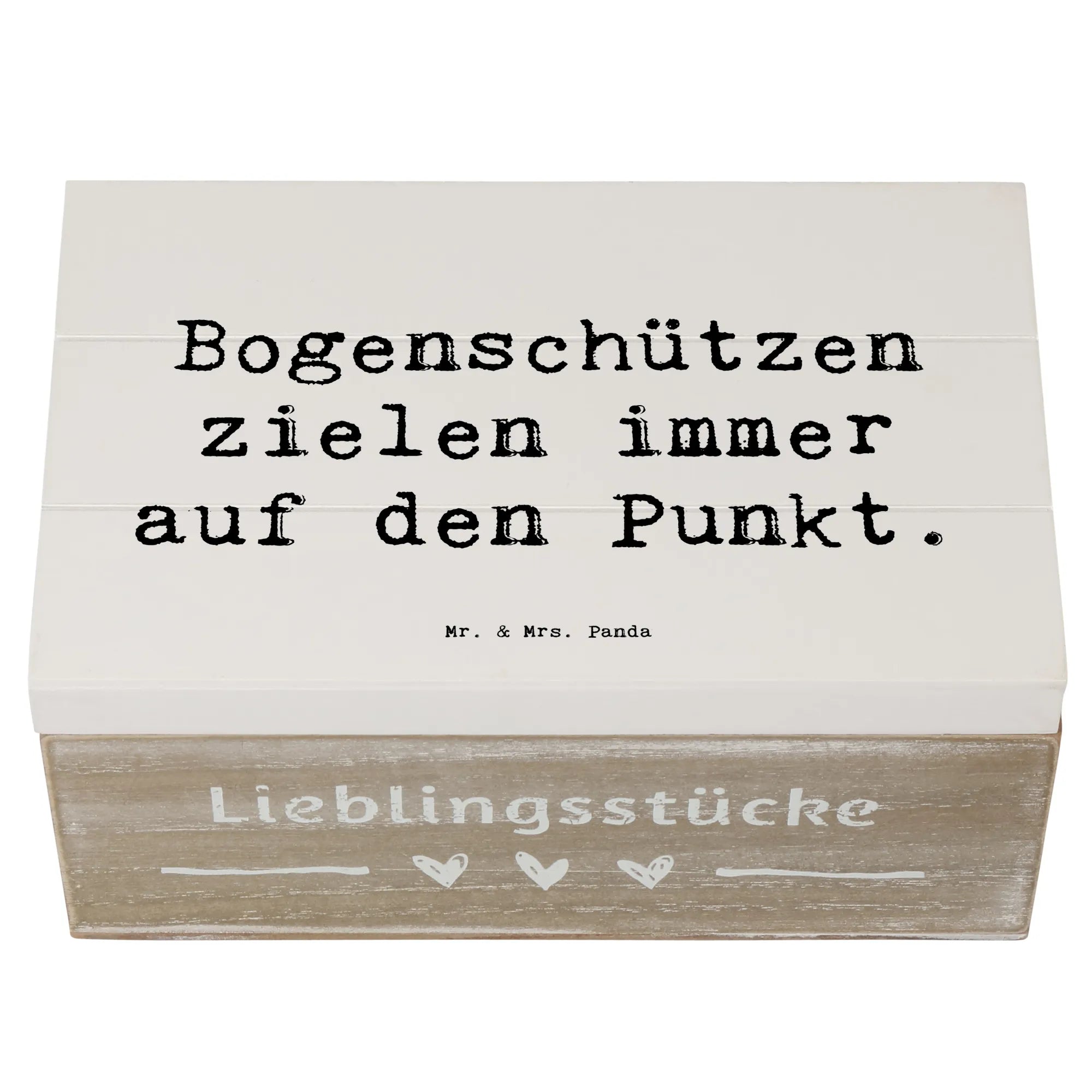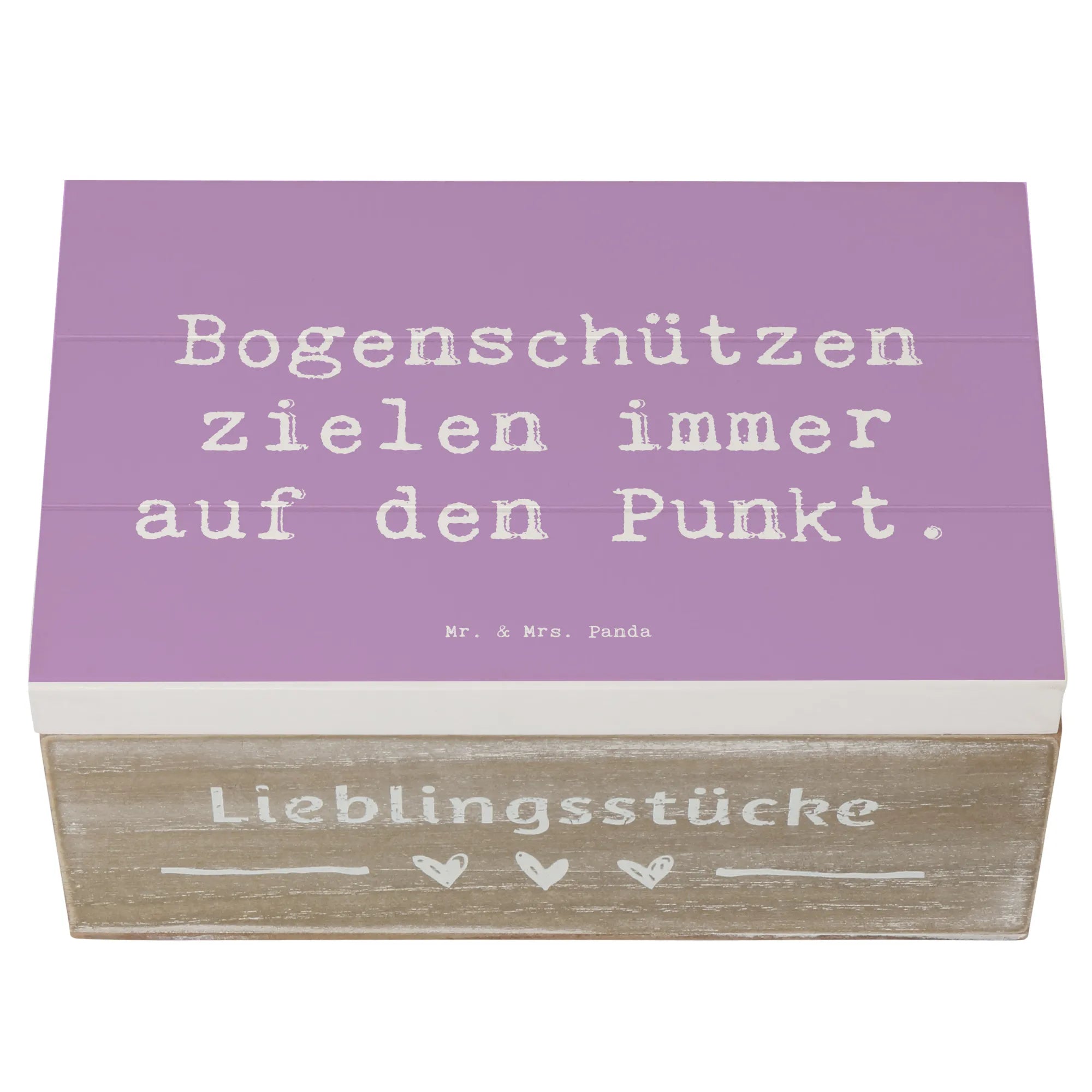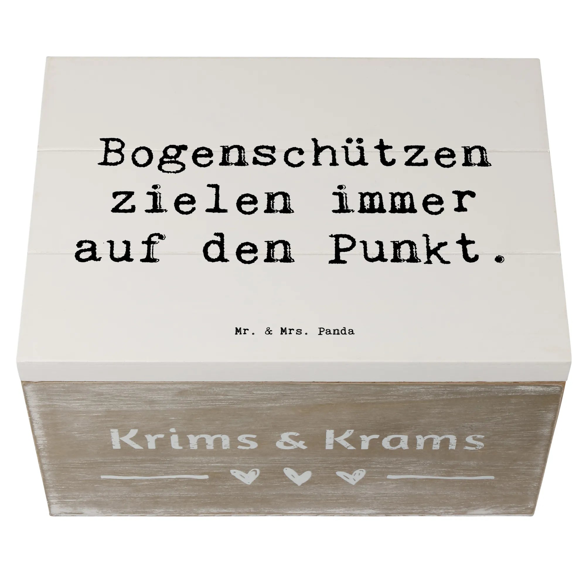 "Bogenschützen zielen immer auf den Punkt" – dieser Spruch ziert die Kiste und macht sie zu einem liebenswerten und charaktervollen Geschenk für jeden Bogensport-Enthusiasten.
