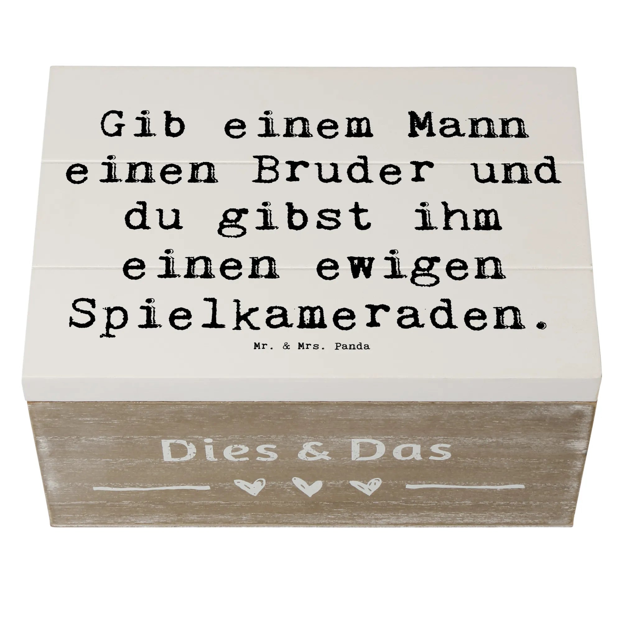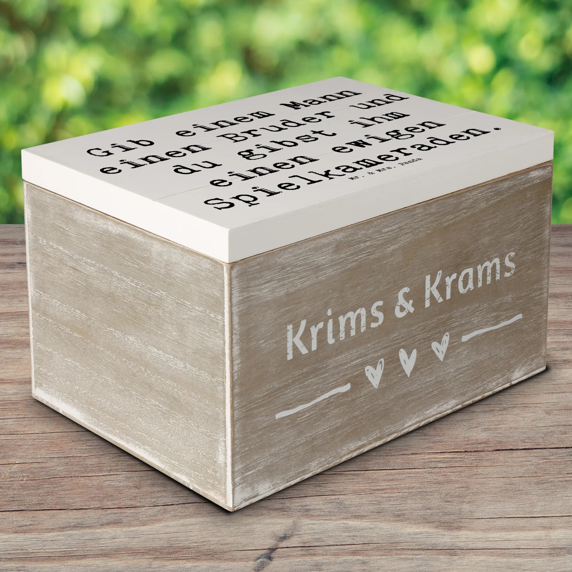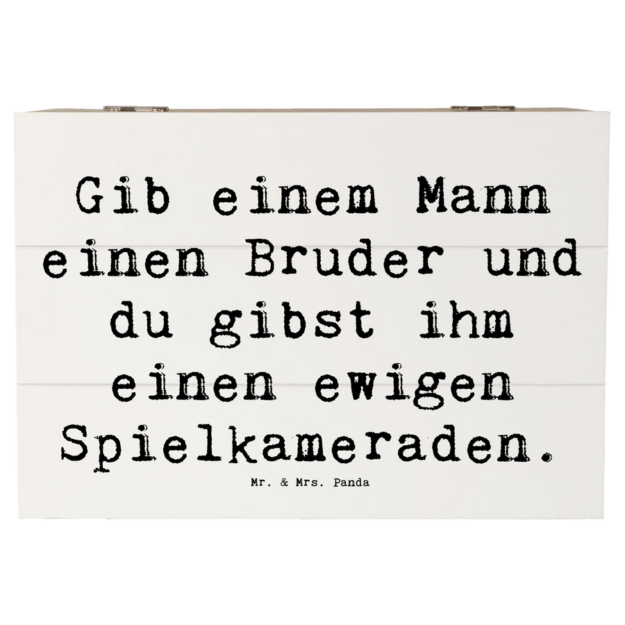 Das besondere an dieser Kiste ist das liebevoll gestaltete Design, das das Thema Bruder aufgreift. Egal, ob Du ein Geschenk für den großen Bruder, den kleinen Bruder oder einfach für einen besonderen Freund suchst – diese Kiste wird Herzen berühren. Mit dem Spruch "Gib einem Mann einen Bruder und du gibst ihm einen ewigen Spielkameraden" drückt sie die ewige Verbindung und die brüderliche Liebe perfekt aus. Deine Geschwisterbeziehung wird durch solch ein persönliches Geschenk noch mehr wertgeschätzt!