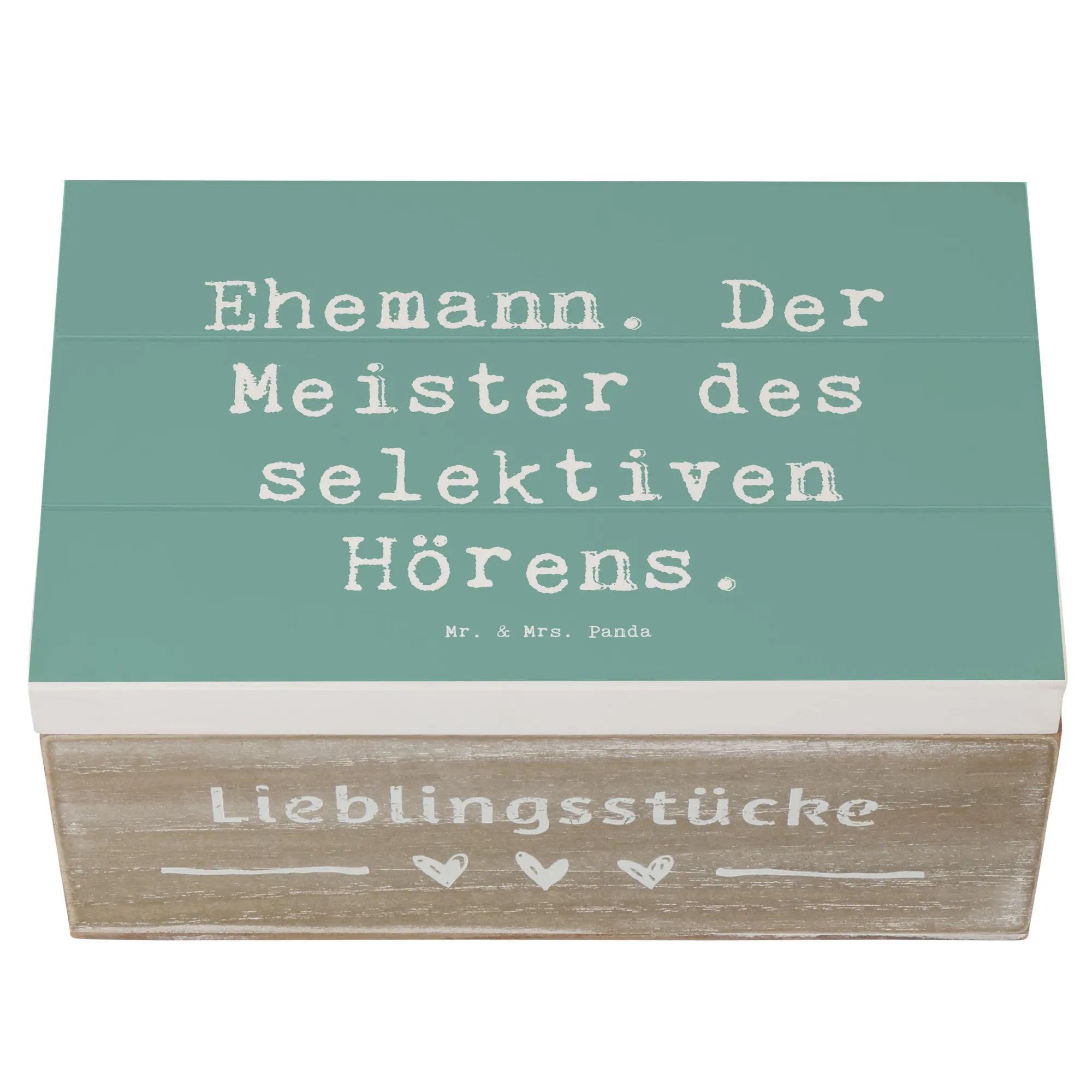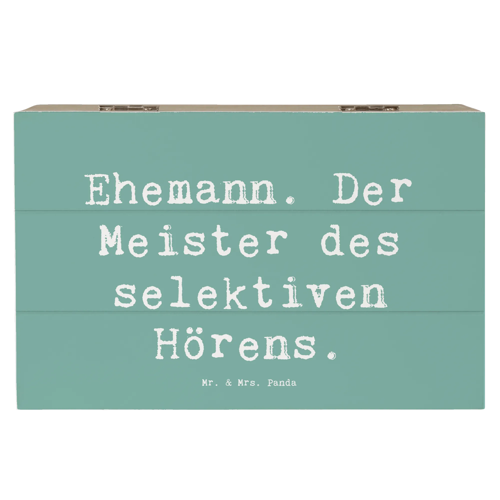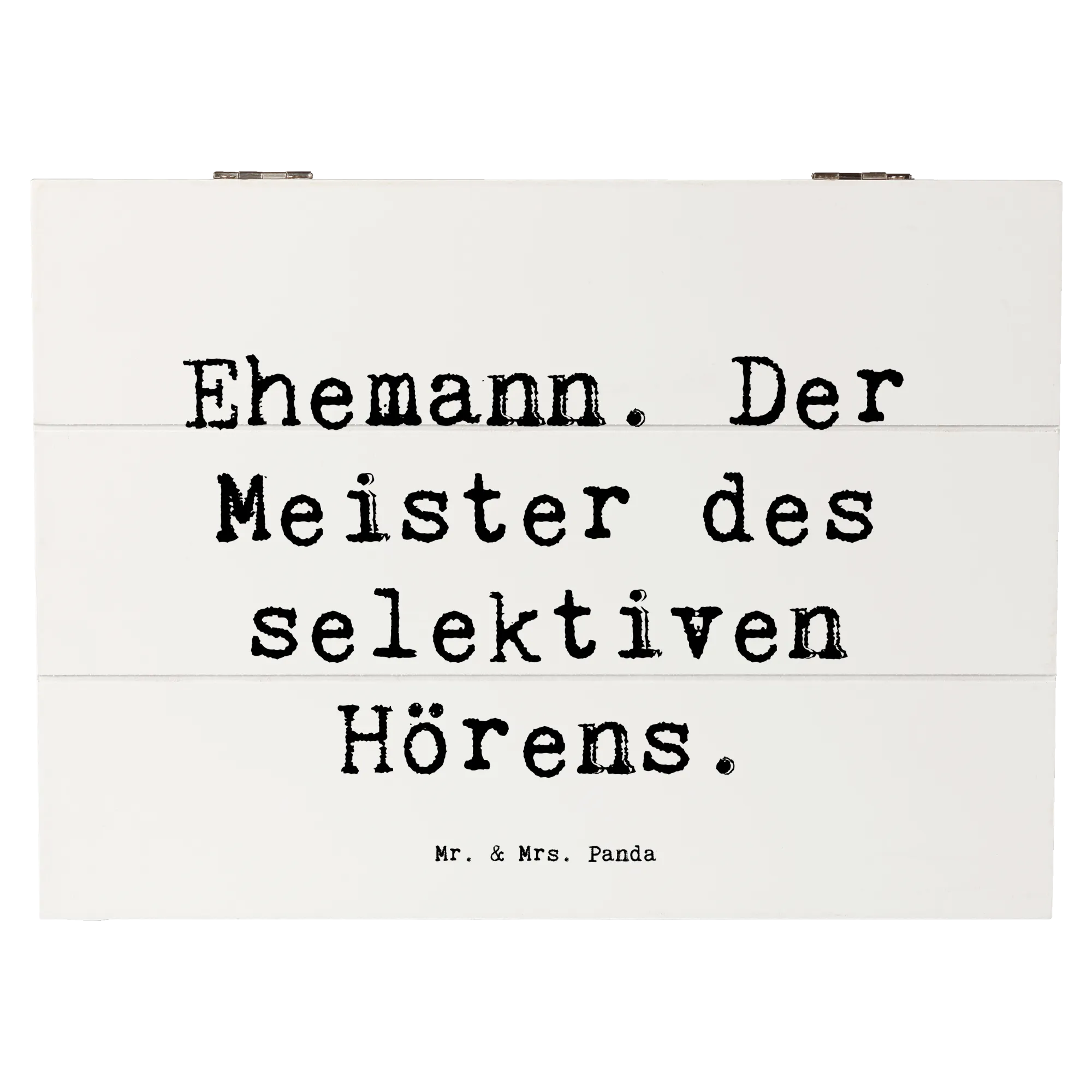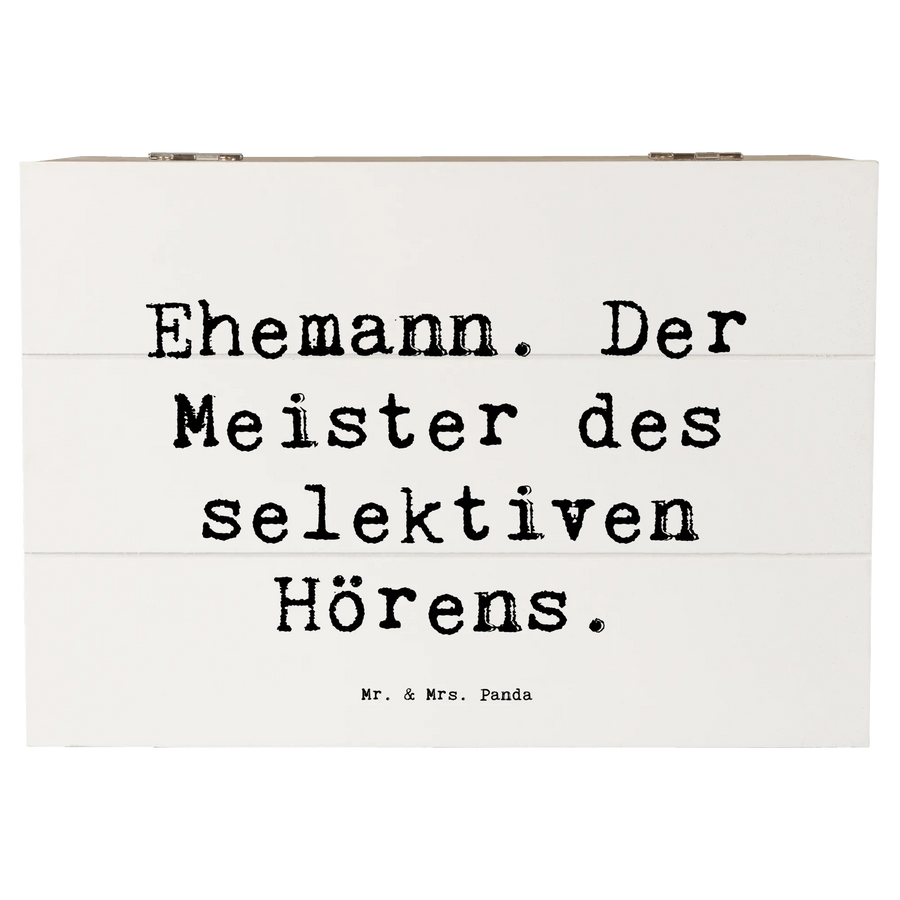 Die wunderschöne Holzkiste von Mr. & Mrs. Panda ist das perfekte Geschenk für Deinen Ehemann! Diese Erinnerungskiste kommt mit dem charmanten Spruch 'Ehemann. Der Meister des selektiven Hörens.' und ist eine liebevolle Hommage an den Fels in der Brandung der Familie.