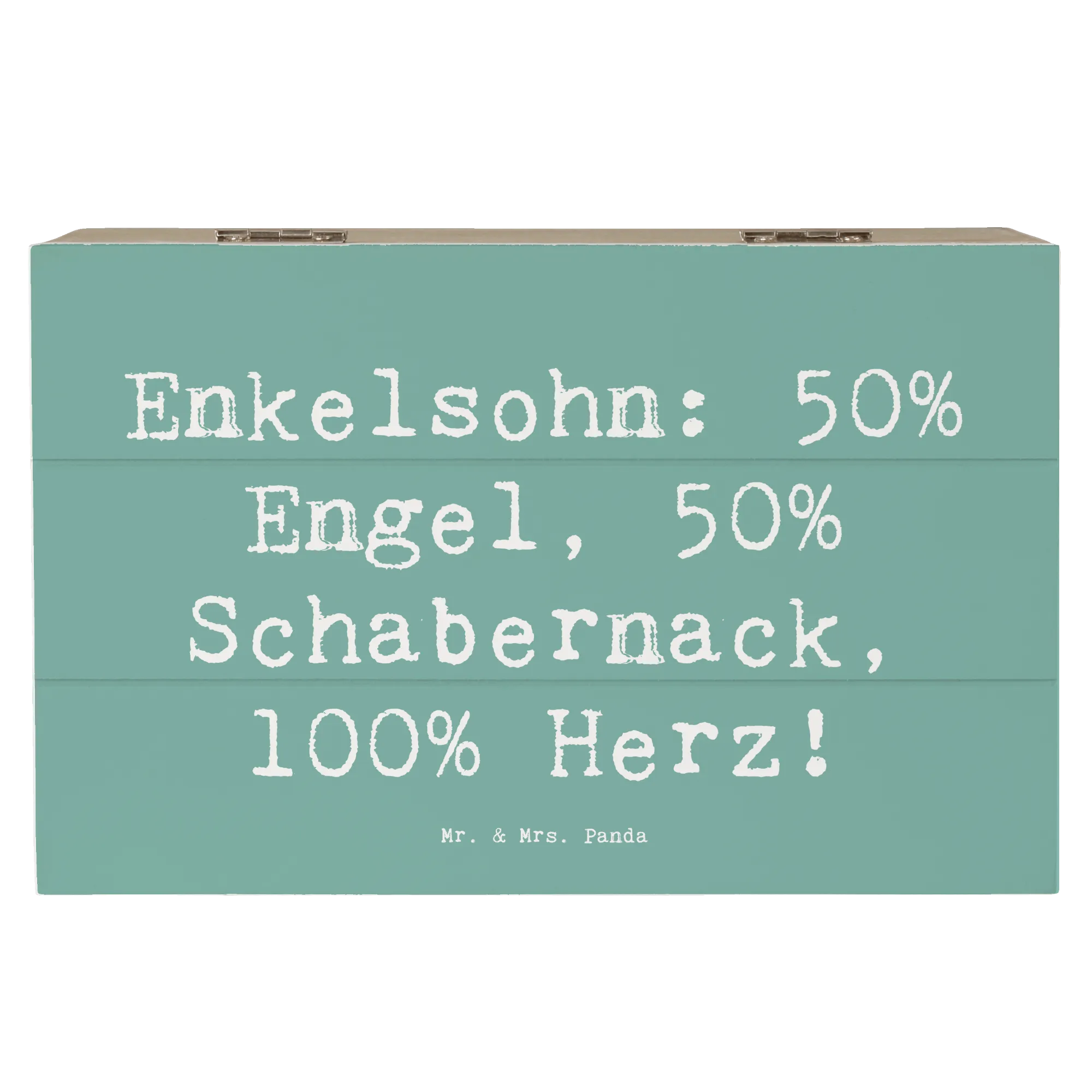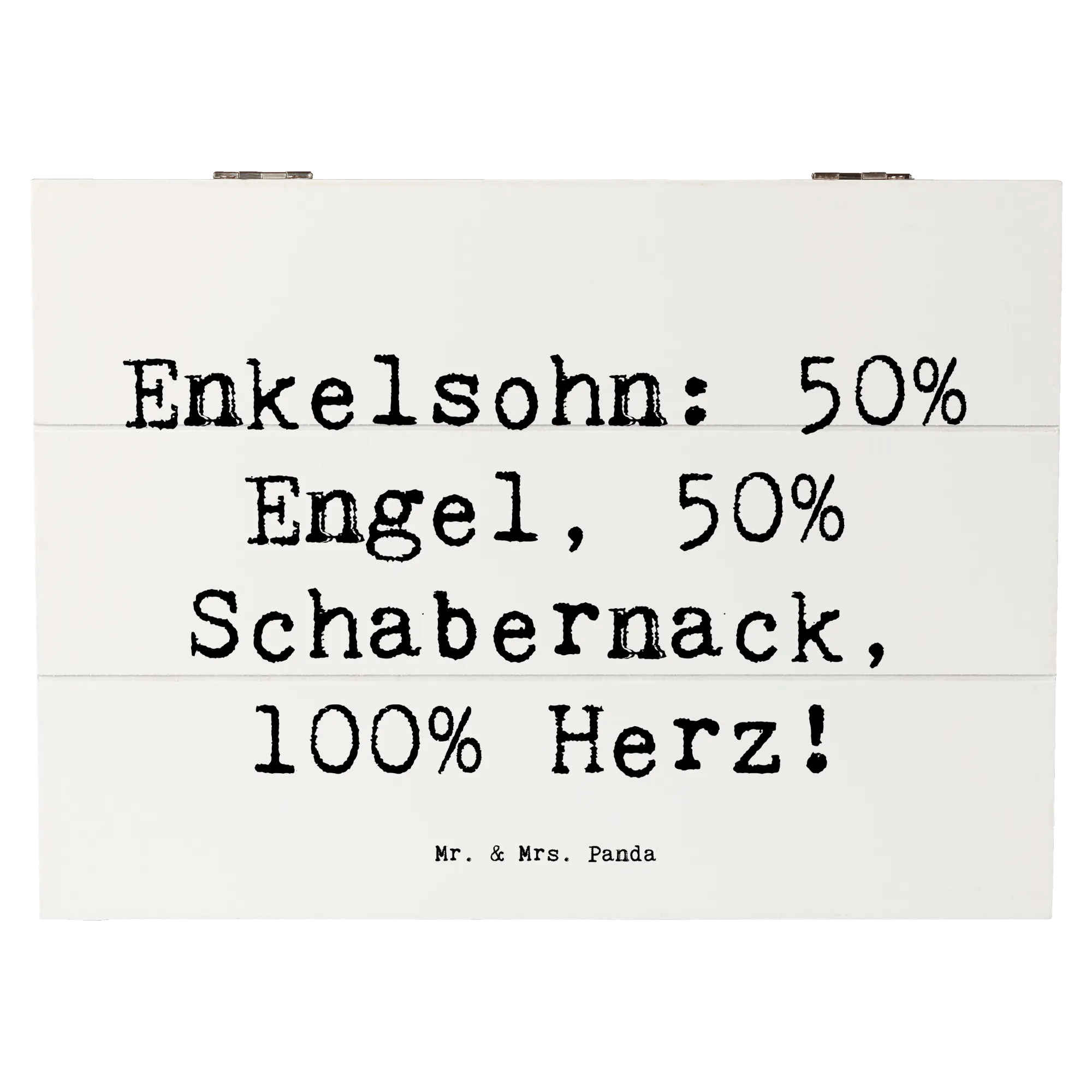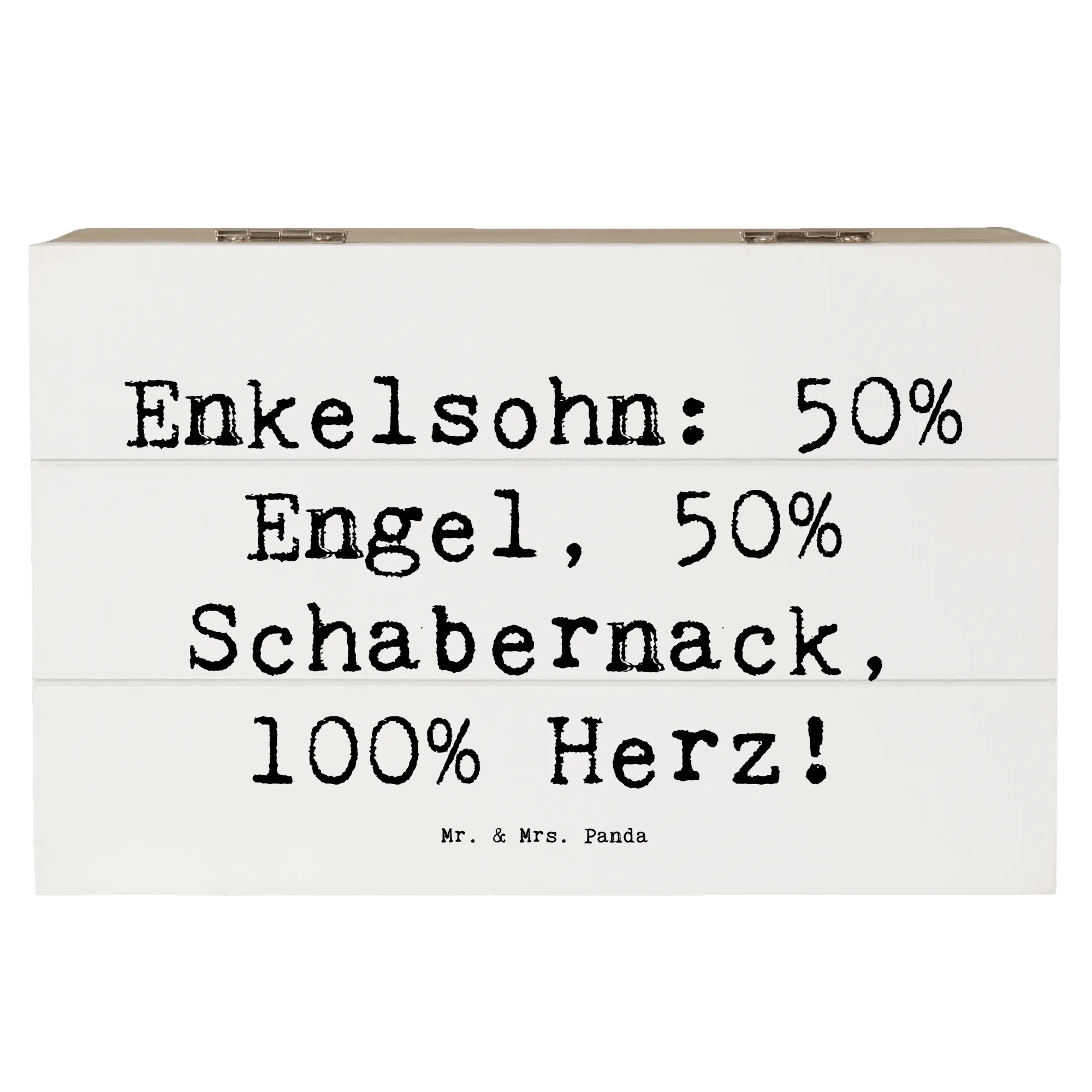 Entdecke die wundervolle Holzkiste von Mr. & Mrs. Panda, die mit einem liebevollen Motiv für Deinen Enkelsohn bedruckt ist. Diese Kiste ist nicht nur ein praktischer Aufbewahrungsort für all die kleinen Schätze, die das Leben bereitstellt, sondern auch ein wunderbares Geschenk für Großeltern, die ihre besonderen Erinnerungen bewahren möchten. Mit dem liebevollen Spruch "Enkelsohn: 50% Engel, 50% Schabernack, 100% Herz!" bringt sie Wärme und Freude in jedes Zuhause.