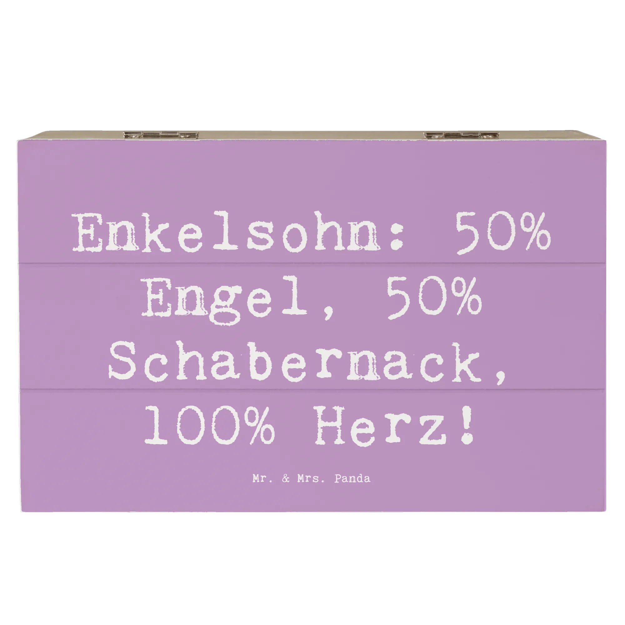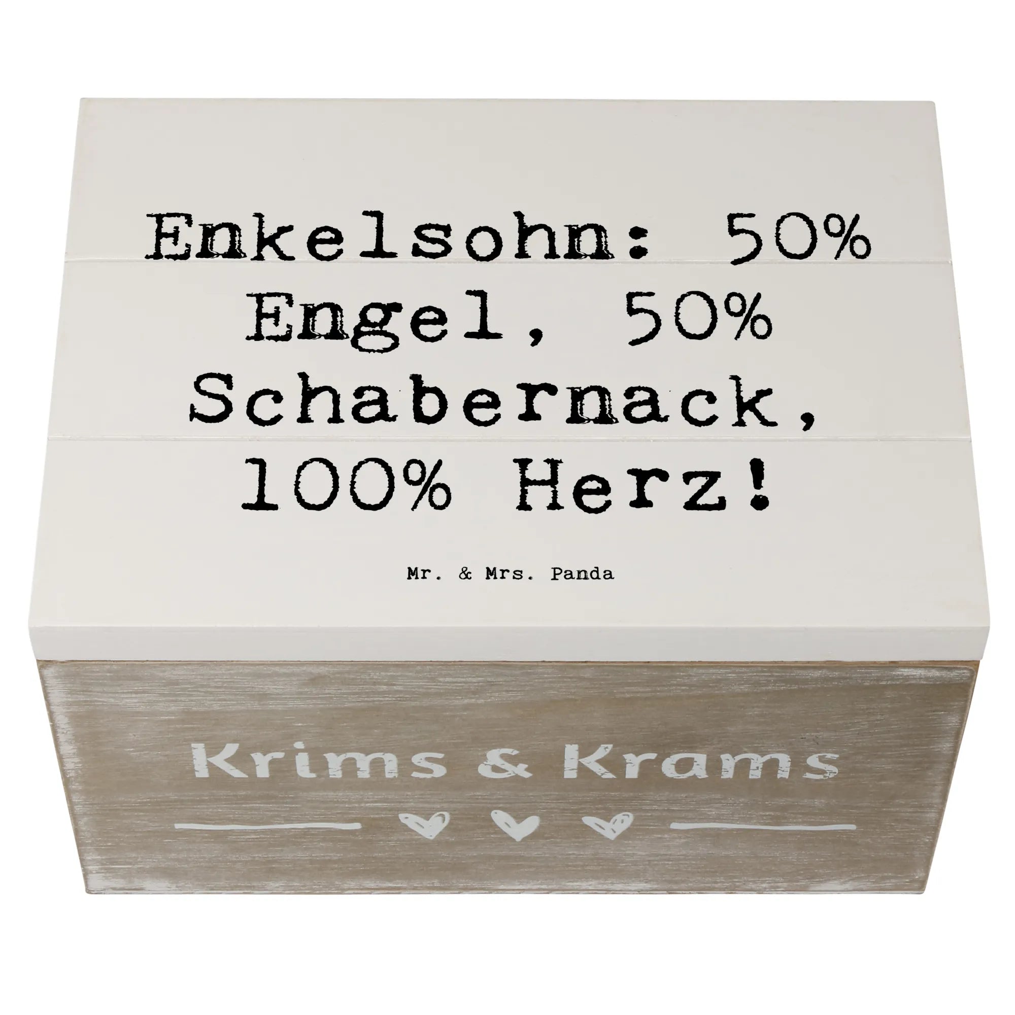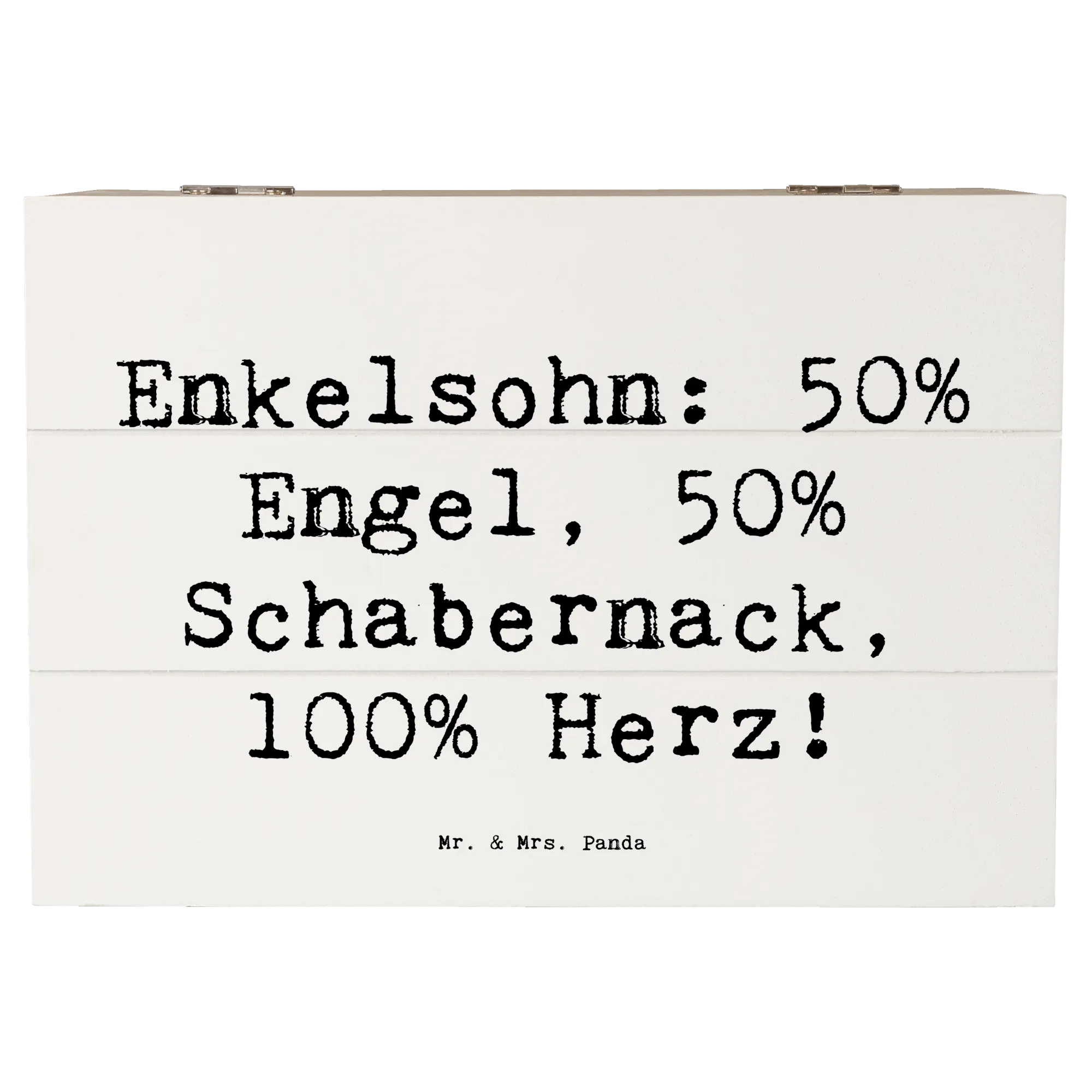 Entdecke die wundervolle Holzkiste von Mr. & Mrs. Panda, die mit einem liebevollen Motiv für Deinen Enkelsohn bedruckt ist. Diese Kiste ist nicht nur ein praktischer Aufbewahrungsort für all die kleinen Schätze, die das Leben bereitstellt, sondern auch ein wunderbares Geschenk für Großeltern, die ihre besonderen Erinnerungen bewahren möchten. Mit dem liebevollen Spruch "Enkelsohn: 50% Engel, 50% Schabernack, 100% Herz!" bringt sie Wärme und Freude in jedes Zuhause.