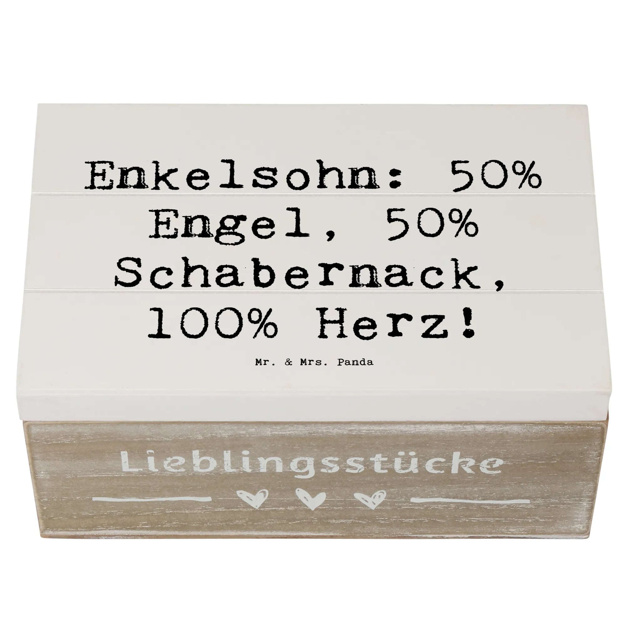 Die wunderschöne Holzkiste von Mr. & Mrs. Panda ist ein ganz besonderes Geschenk, das nicht nur praktisch, sondern auch emotional ist! Diese Erinnerungskiste ist ideal für alle Großeltern, die ihrem Enkelsohn zeigen möchten, wie viel er ihnen bedeutet. Mit dem liebevollen Spruch "Enkelsohn: 50% Engel, 50% Schabernack, 100% Herz!" zaubert sie jedem ein Lächeln ins Gesicht und bringt Erinnerungen zurück.
