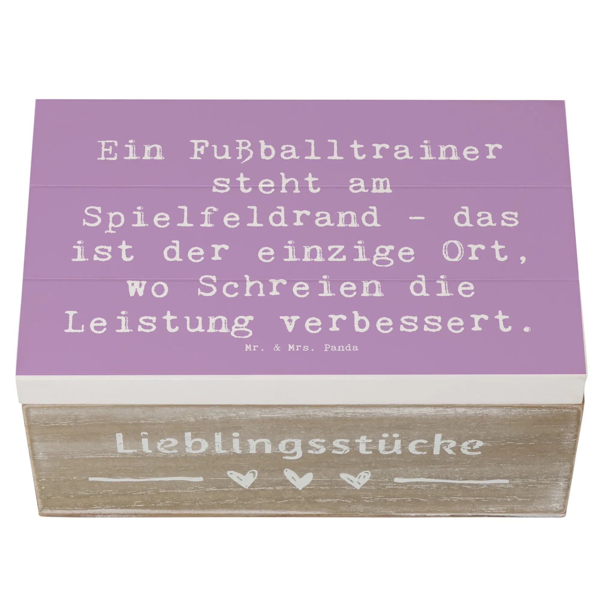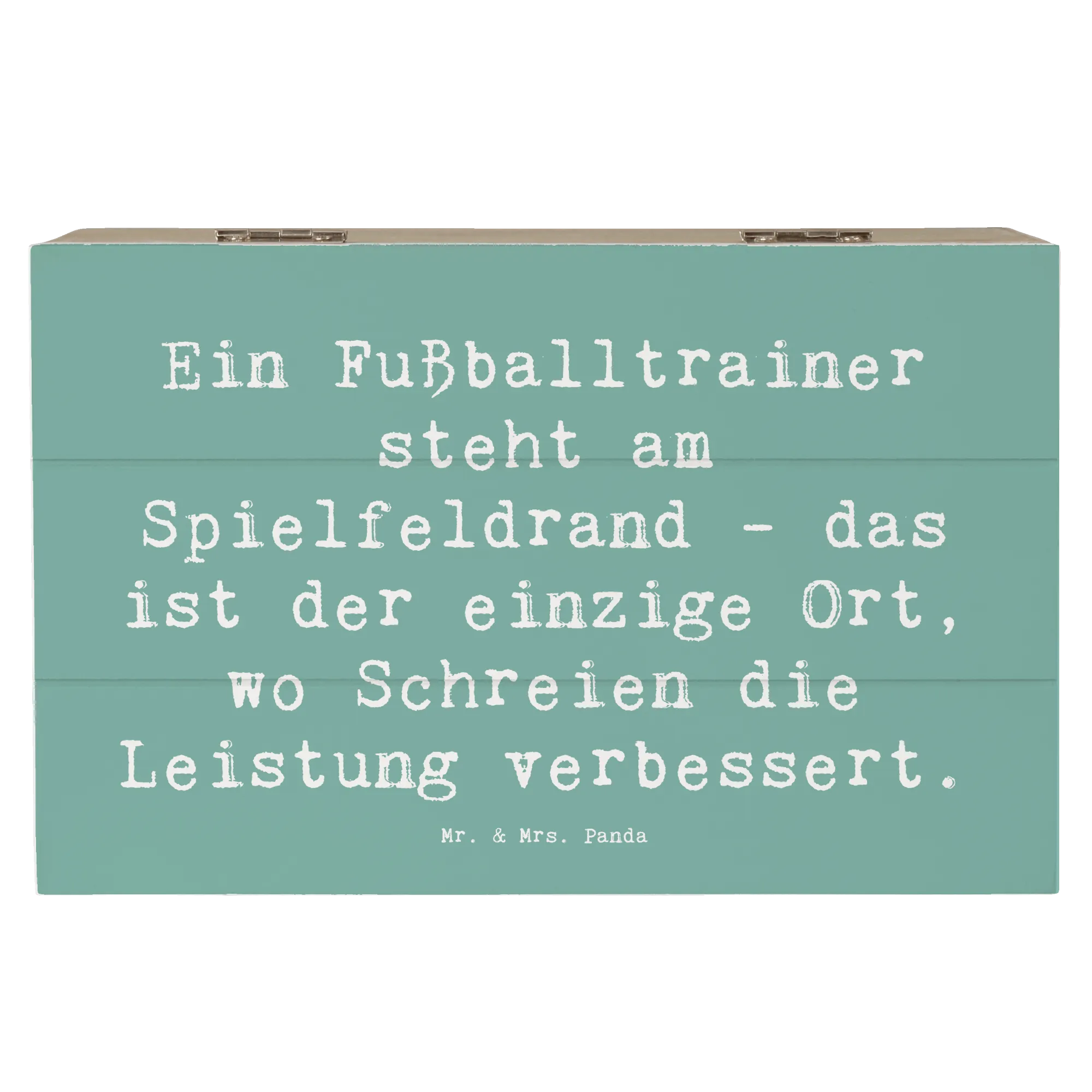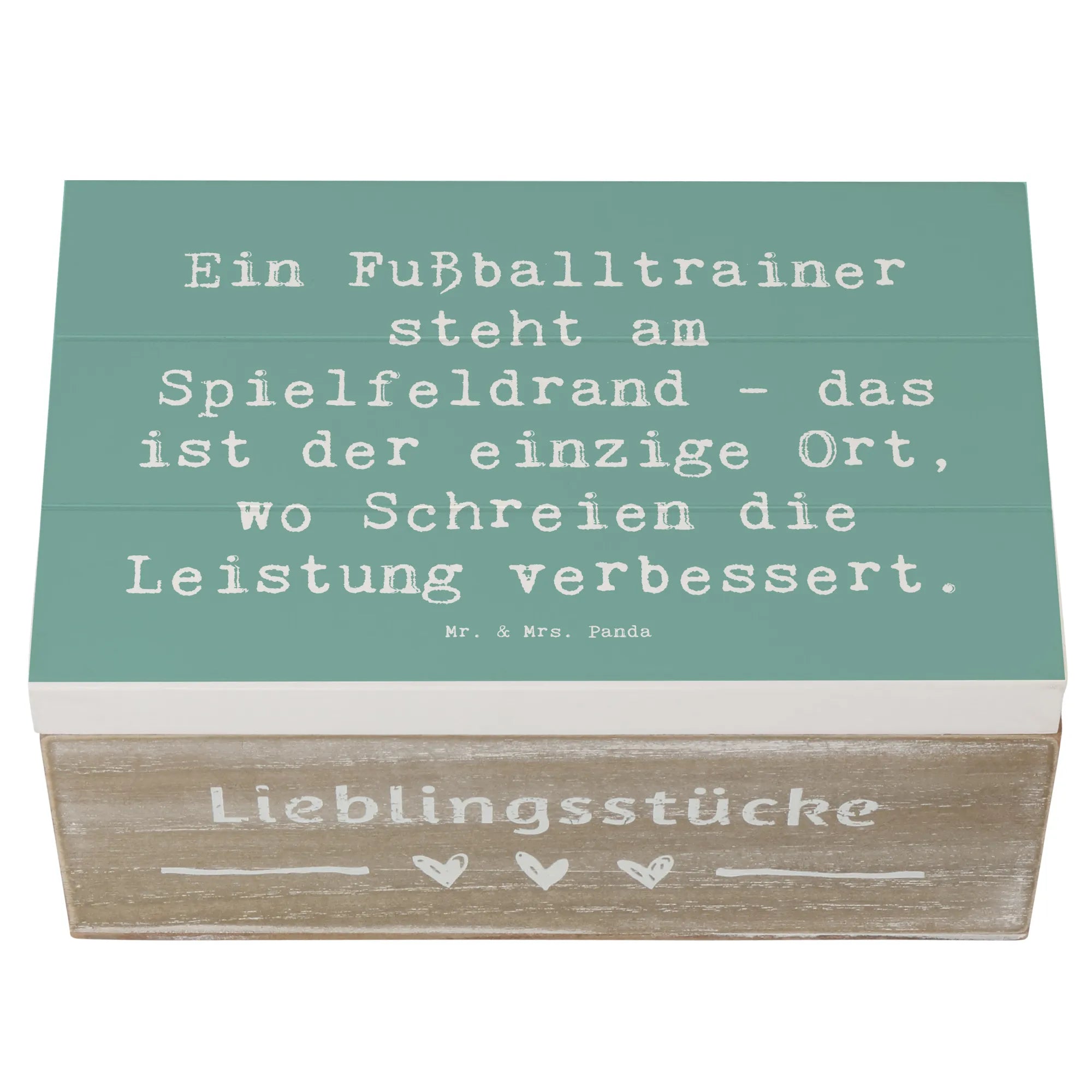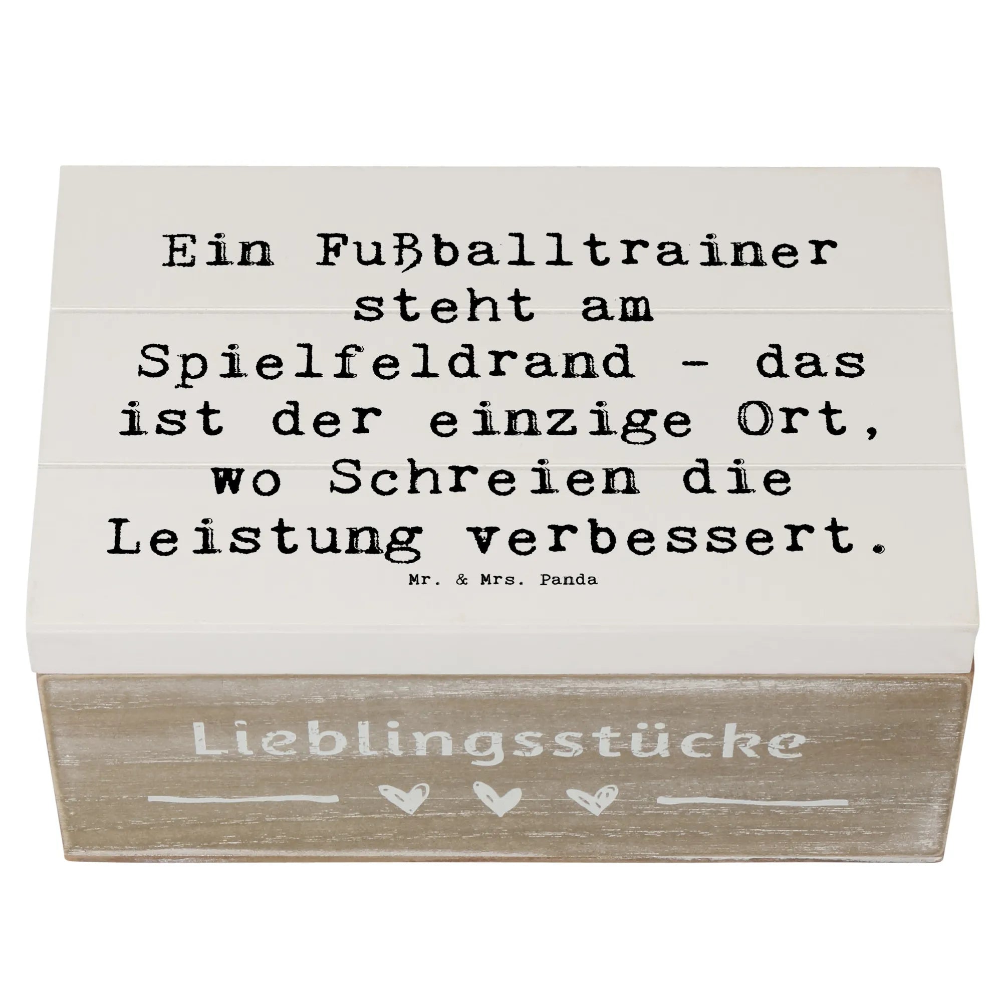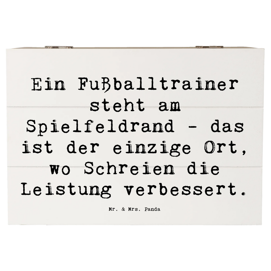 Die wunderschöne Holzkiste von Mr. & Mrs. Panda ist das perfekte Geschenk für alle Fußballtrainer und ihre Fans. Sie bietet nicht nur einen idealen Ort, um wertvolle Erinnerungen zu bewahren, sondern sieht mit ihrem liebevoll gestalteten Motiv und dem humorvollen Spruch "Ein Fußballtrainer steht am Spielfeldrand - das ist der einzige Ort, wo Schreien die Leistung verbessert." auch noch richtig toll aus.