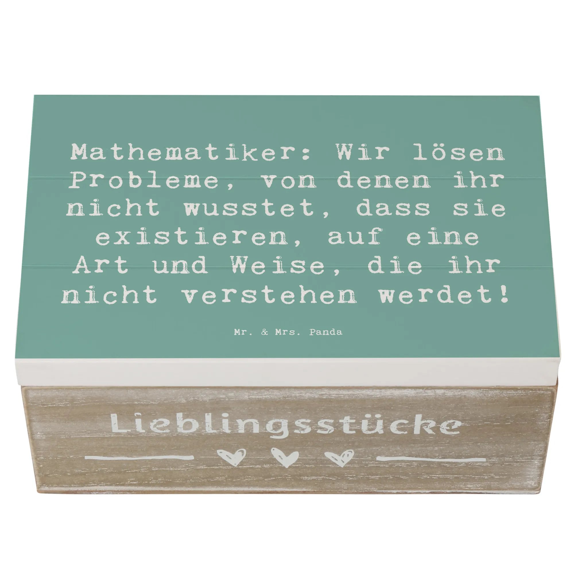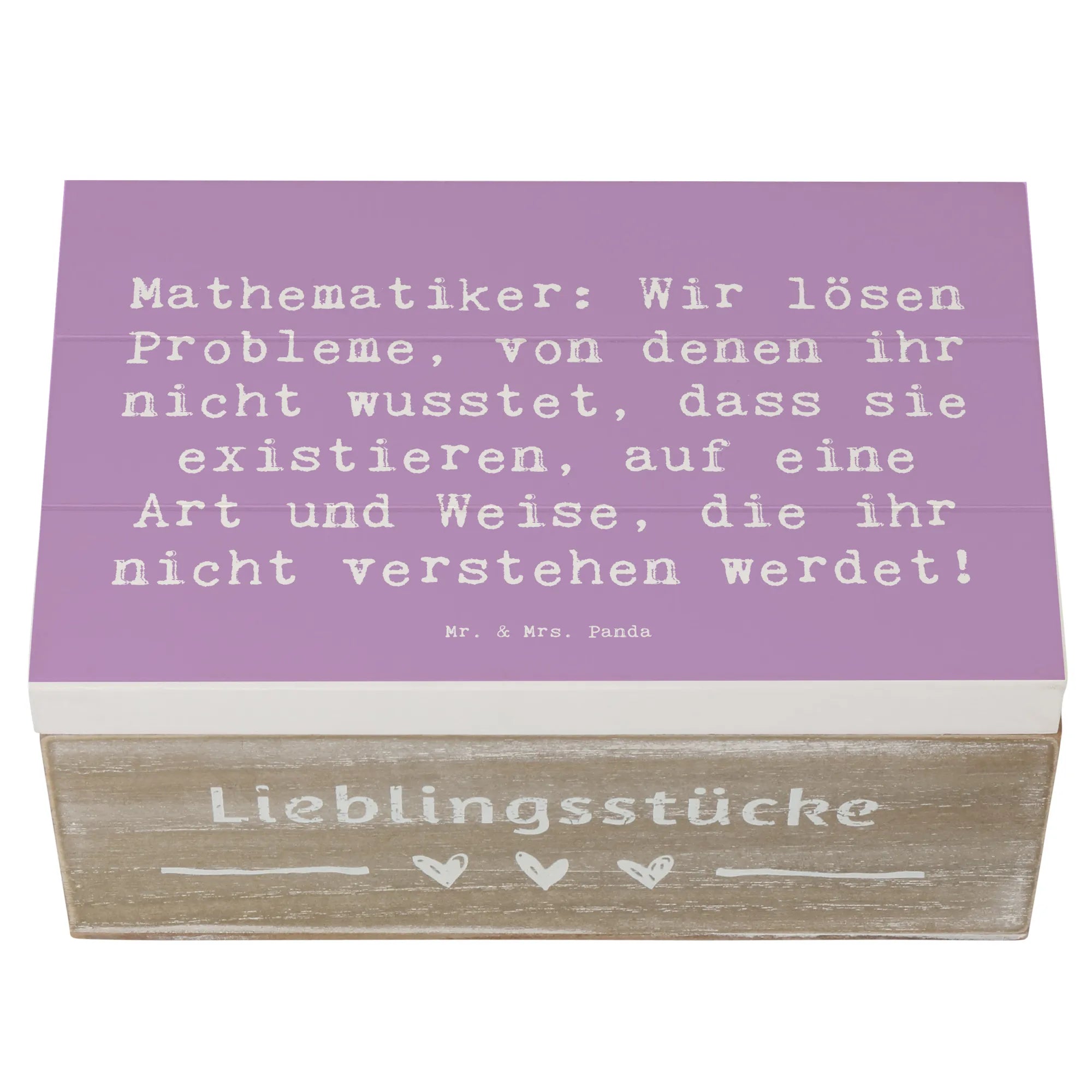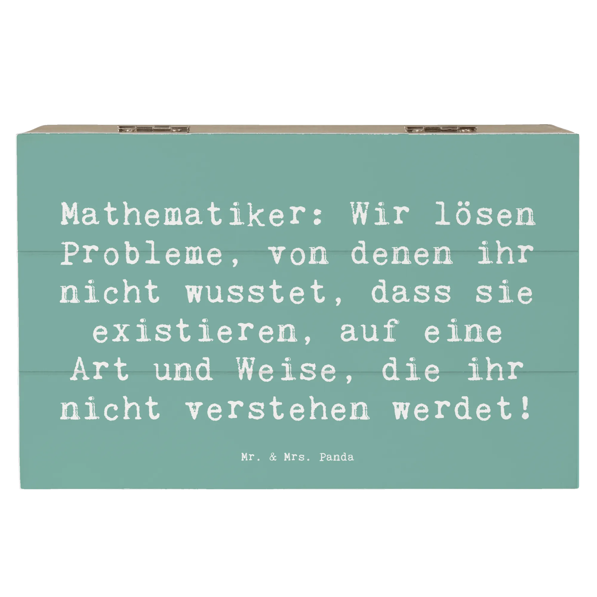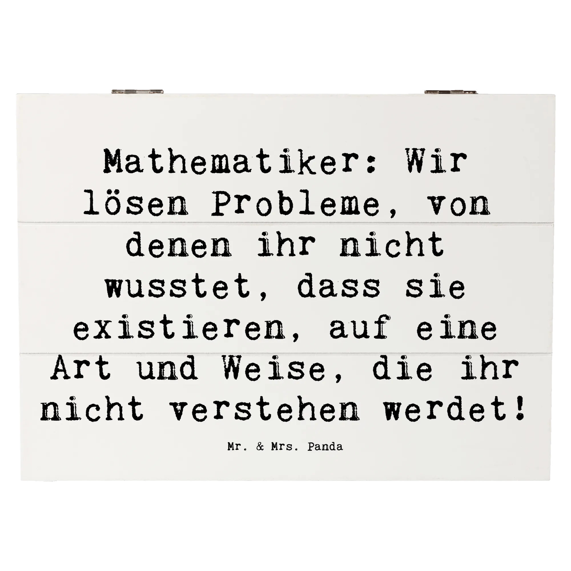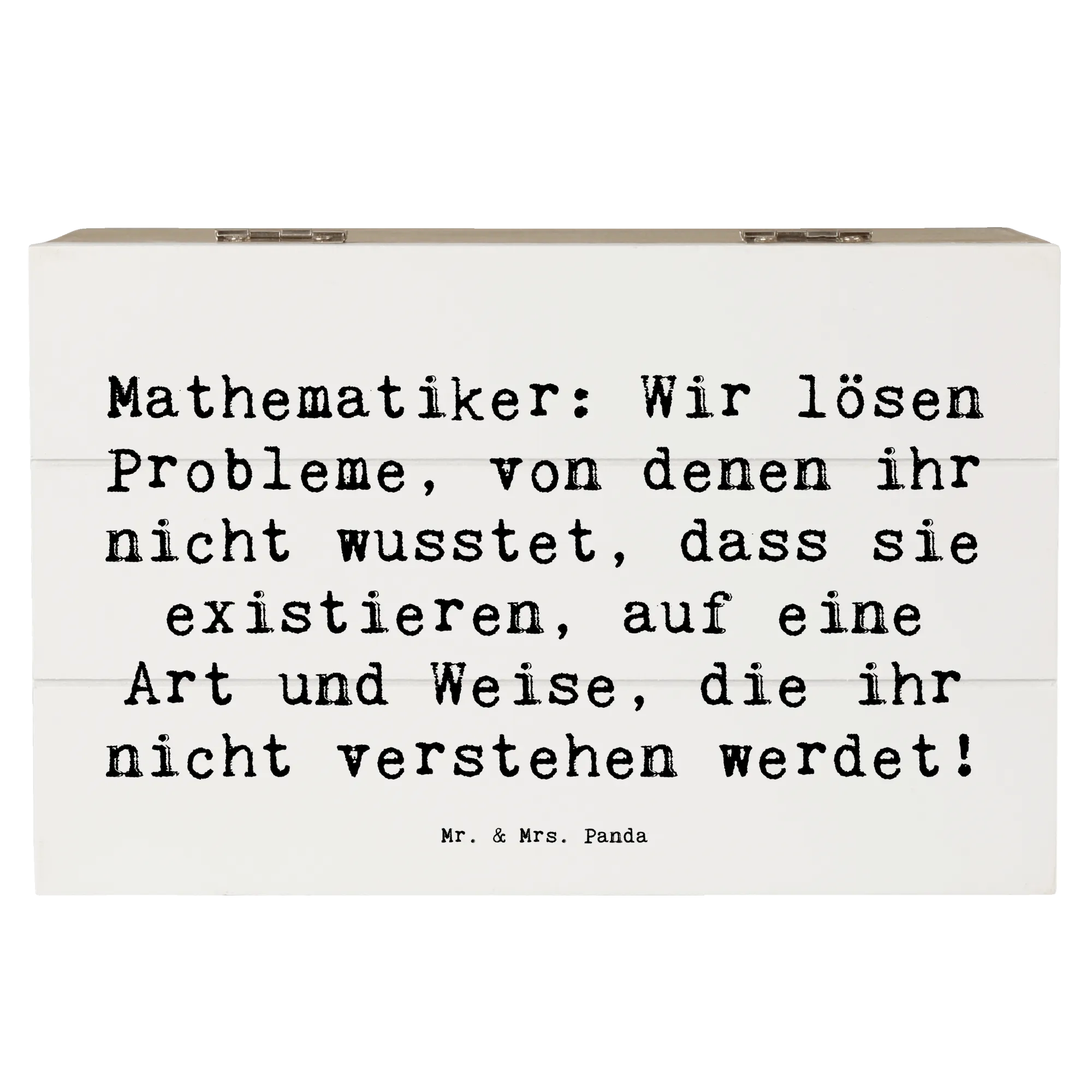 Holzkiste "Mathematiker" – die charmante Aufbewahrungsbox aus der Berufe-Kollektion von Mr. & Mrs. Panda. Mit dem witzigen Spruch „Mathematiker: Wir lösen Probleme, von denen ihr nicht wusstet, dass sie existieren, auf eine Art und Weise, die ihr nicht verstehen werdet!“ ist diese Holzbox mit Deckel das perfekte Geschenk für Mathe-Fans, Lehrer, Studenten und alle Nerds mit Humor.