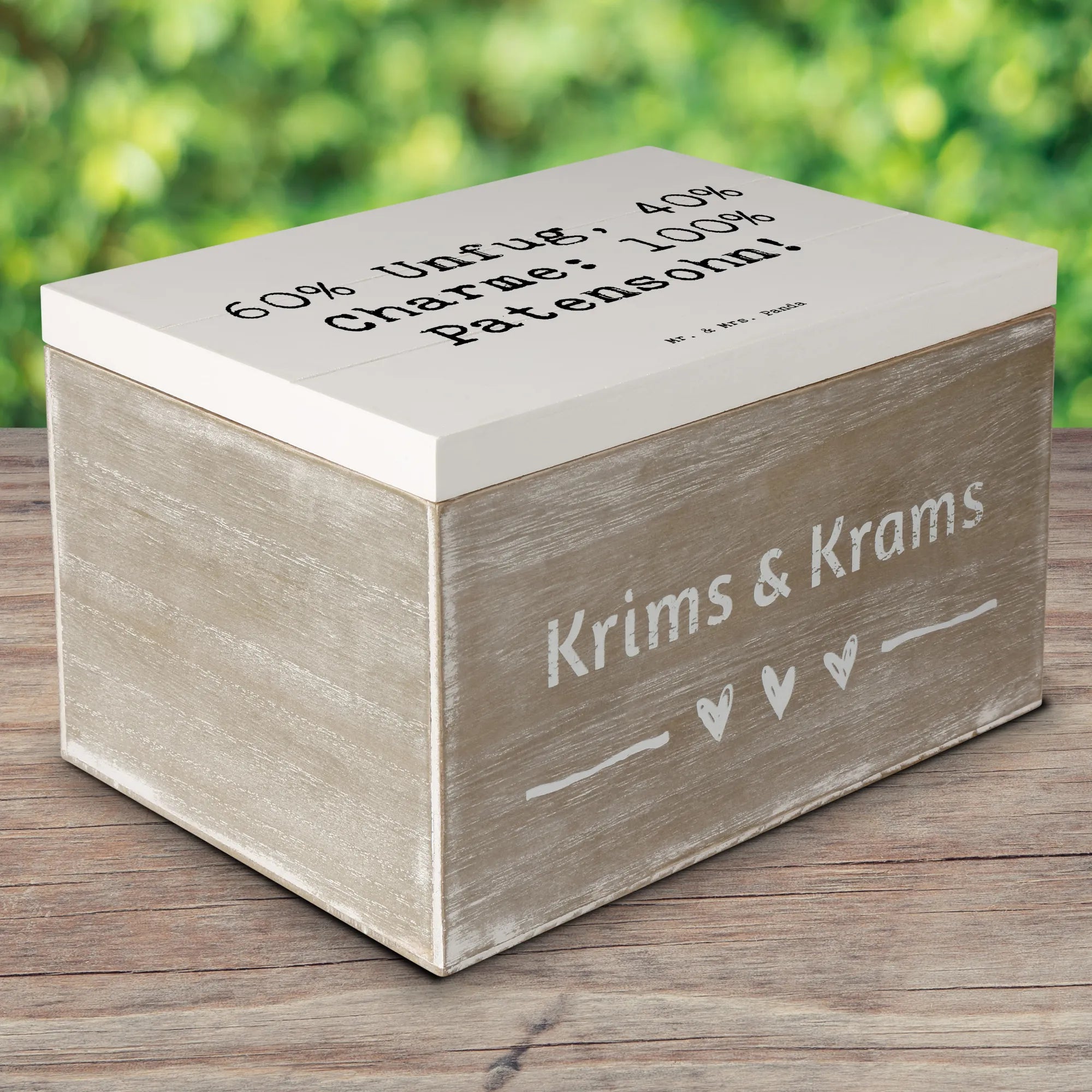 Entdecke die wunderschöne Holzkiste "Patensohn" von Mr. & Mrs. Panda! Diese einzigartige Kiste ist nicht nur ein schöner Anblick, sondern auch der perfekte Aufbewahrungsort für all deine wertvollen Erinnerungen. Mit einem liebevollen Design, das den Spruch "60% Unfug, 40% Charme: 100% Patensohn!" ziert, wird sie zu einem ganz besonderen Geschenk für deinen Patensohn oder dein Patenkind.