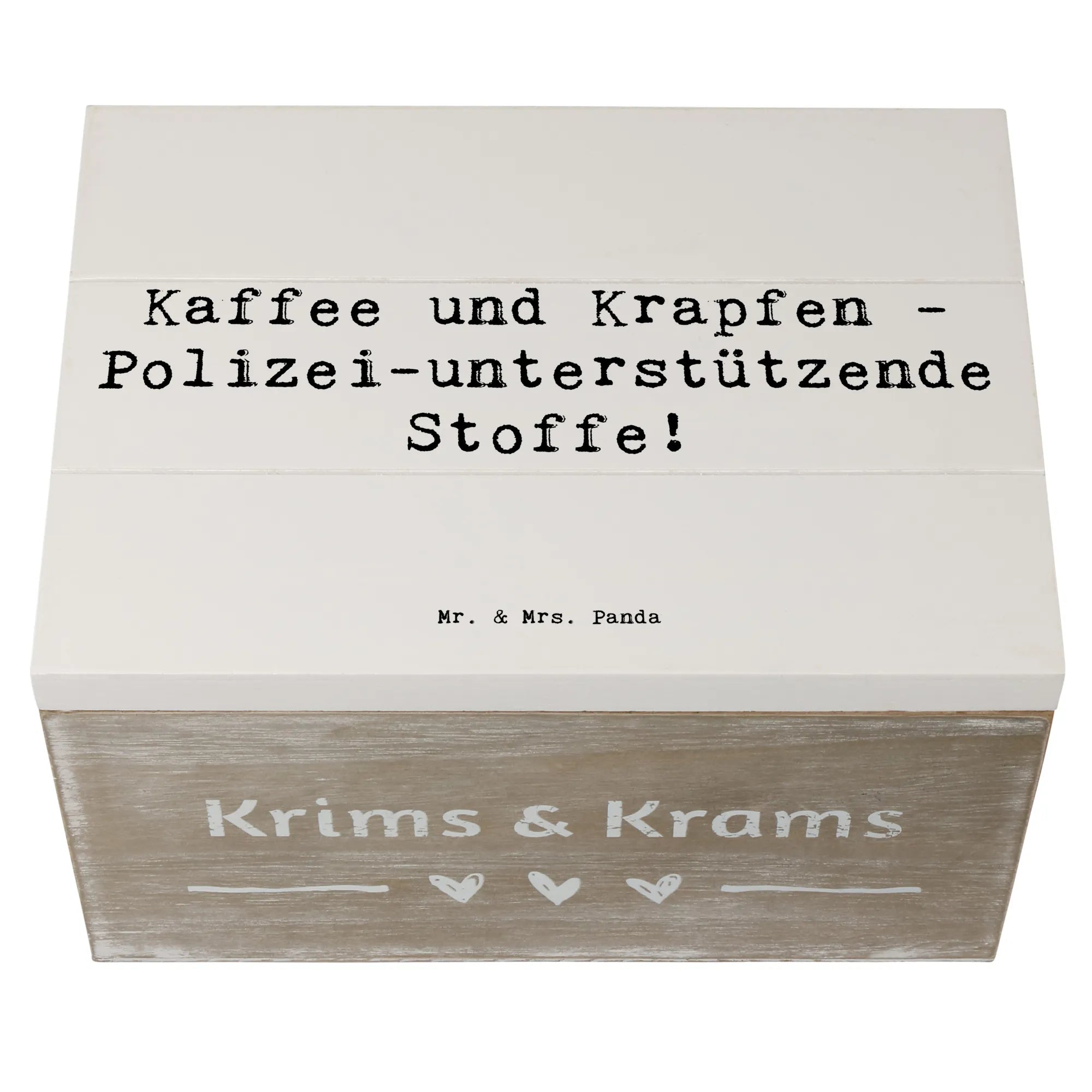 Wusstest Du, dass diese Kiste auch perfekt als nachhaltige Geschenkbox dient? Verschenke sie gefüllt mit kleinen Überraschungen oder Erinnerungen und zaubere so ein Lächeln auf das Gesicht des Beschenkten. Durch das elegante Design und den einzigartigen Spruch "Kaffee und Krapfen - Polizei-unterstützende Stoffe!" wird die Kiste immer wieder gerne in die Hand genommen und sorgt für Freude.