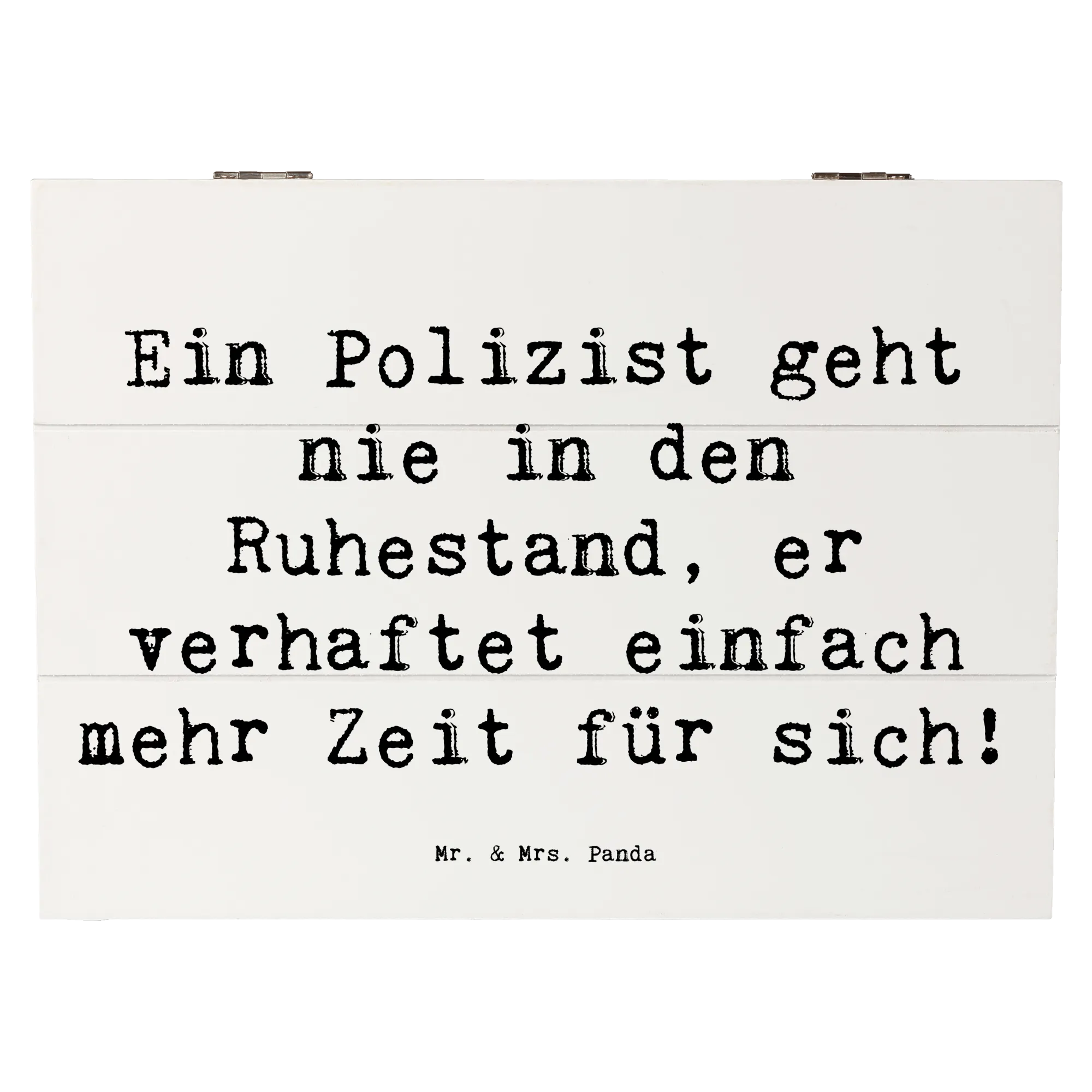 Entdecke die zauberhafte Holzkiste von Mr. & Mrs. Panda, die speziell für alle Polizisten entworfen wurde! Diese wunderschöne Holzkiste ist nicht nur ein Blickfang, sondern auch unglaublich praktisch. Mit dem liebevollen Spruch "Ein Polizist geht nie in den Ruhestand, er verhaftet einfach mehr Zeit für sich!" wird die Kiste zum perfekten Aufbewahrungsort für all deine wertvollen Schätze.