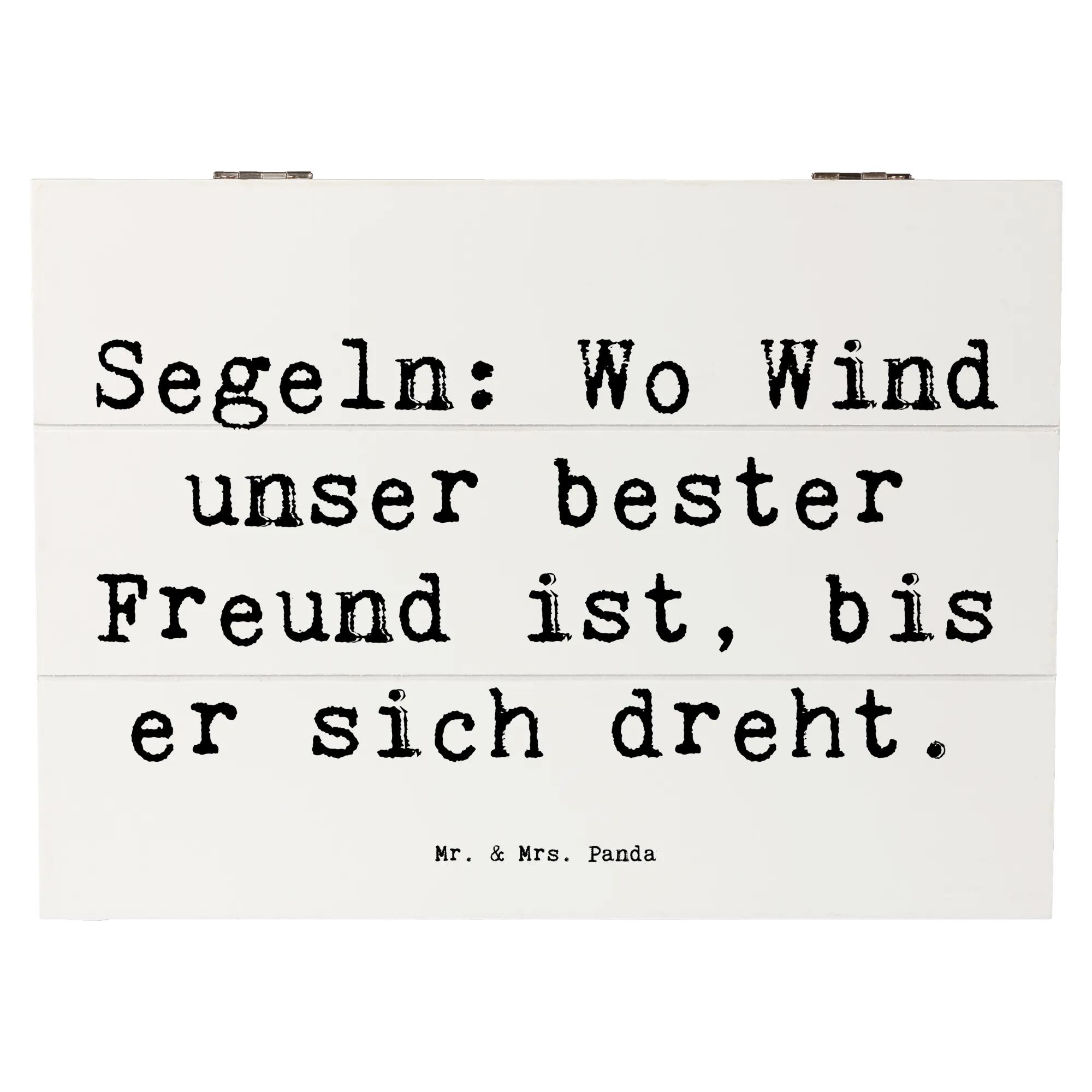 Die wunderschöne Holzkiste von Mr. & Mrs. Panda mit dem liebevollen Motiv 'Segeln: Wo Wind unser bester Freund ist, bis er sich dreht.' ist das perfekte Geschenk für alle, die die Freiheit und den Abenteuergeist des Segelns lieben. Diese stabile Erinnerungskiste bietet nicht nur eine stilvolle Aufbewahrung für all deine Schätze, sondern ist auch ein echtes Highlight in jedem Zuhause.