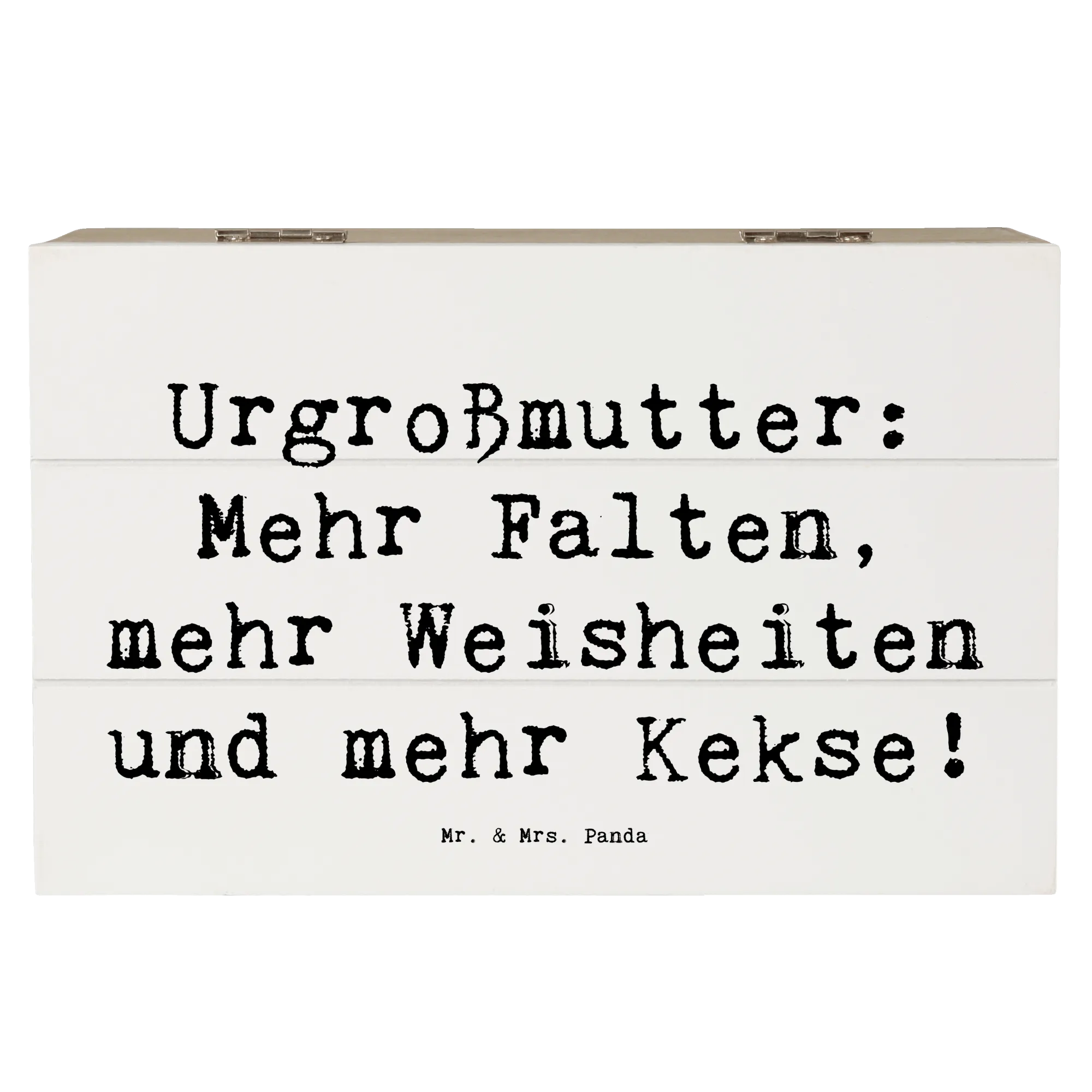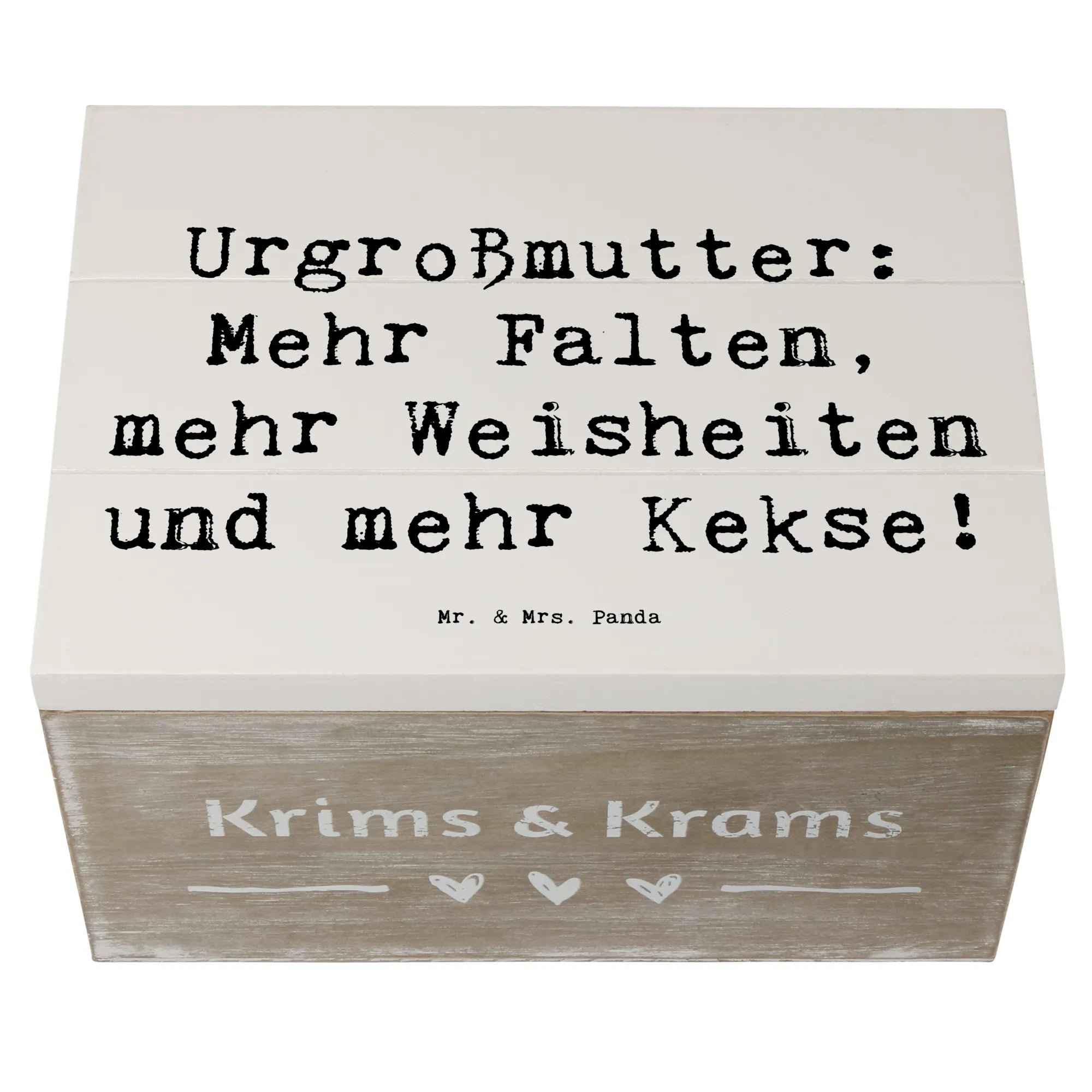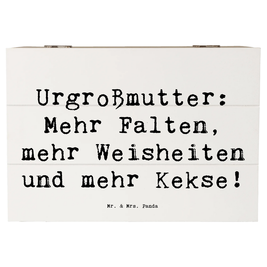 Die Holzkiste "Urgroßmutter: Mehr Falten, mehr Weisheiten und mehr Kekse!" von Mr. & Mrs. Panda ist das perfekte Geschenk für alle, die ihre Wurzeln ehren und die kostbaren Erinnerungen an die Urgroßmutter lebendig halten möchten. Diese wunderschöne Holzkiste ist nicht nur ein Blickfang, sondern auch ein idealer Aufbewahrungsort für Schätze, Erinnerungen und Traditionen, die von Generation zu Generation weitergegeben werden. Mit einem charmanten Design und einem liebevollen Spruch, der das Herz erwärmt, ist sie ein wunderbares Familienerbstück.