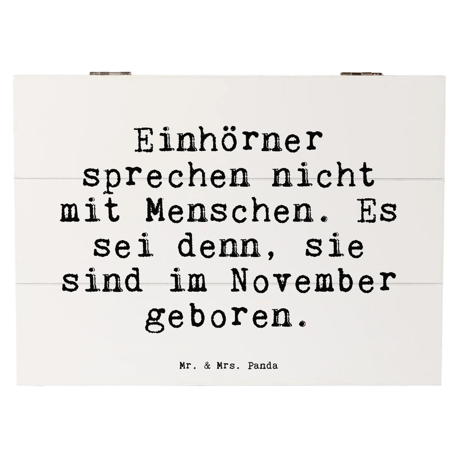 Die wunderschöne Holzkiste von Mr. & Mrs. Panda bietet nicht nur einen stilvollen Platz für all deine Schätze, sondern ist auch ein ganz besonderes Geschenk. Mit dem lustigen Spruch "Einhörner sprechen nicht mit Menschen. Es sei denn, sie sind im November geboren." verleiht diese Kiste jedem Raum einen Hauch von Magie und Freude.