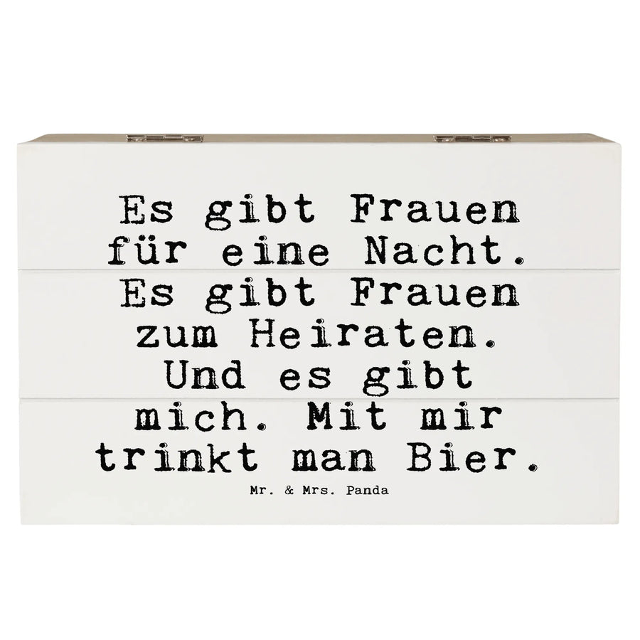 Die wunderschöne Holzkiste von Mr. & Mrs. Panda ist nicht nur ein praktischer Aufbewahrungsort, sondern auch ein tolles Geschenk für Deine Lieblingsmenschen! Mit dem liebevoll gestalteten Spruch 'Es gibt Frauen für eine Nacht. Es gibt Frauen zum Heiraten. Und es gibt mich. Mit mir trinkt man Bier.' ist diese Kiste ein echter Hingucker und sorgt garantiert für Schmunzler.