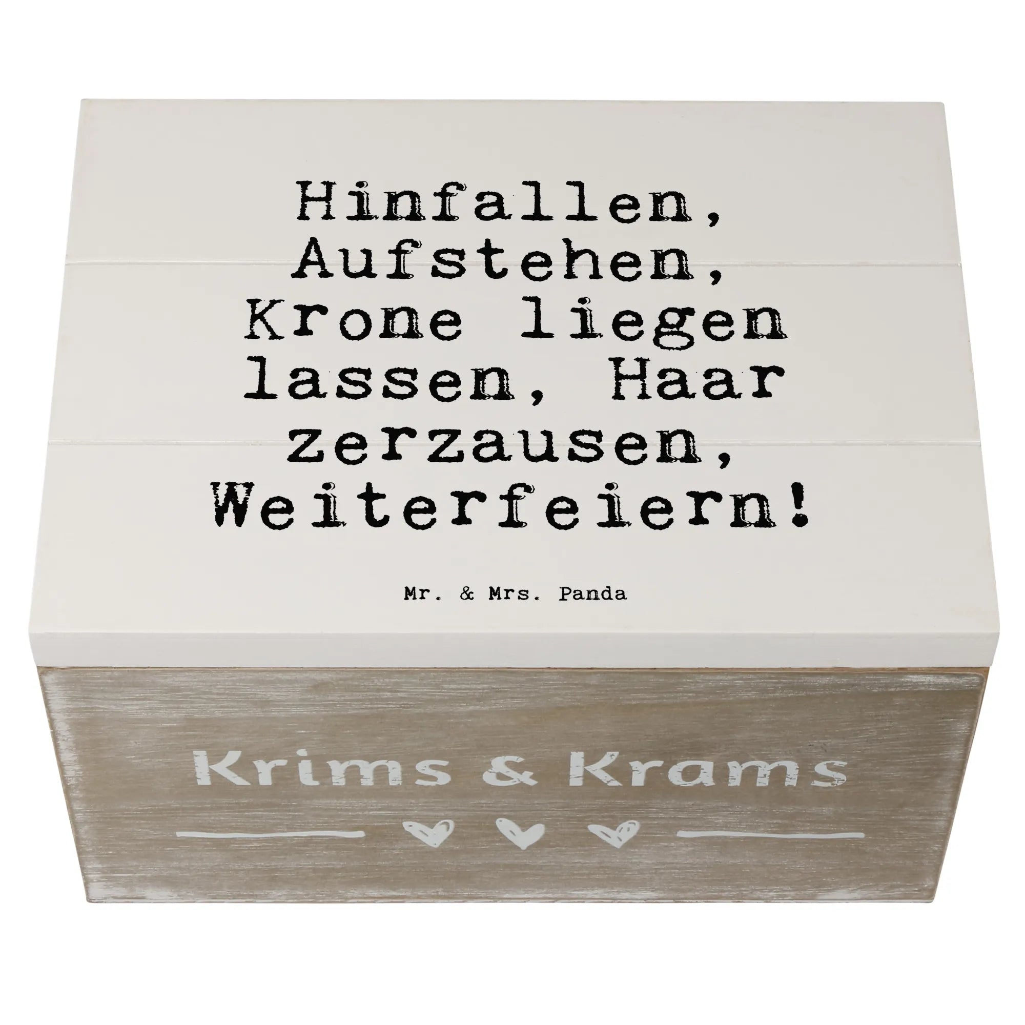 Die Holzkiste "Hinfallen, Aufstehen, Krone liegen lassen, Haar zerzausen, Weiterfeiern!" von Mr. & Mrs. Panda ist der perfekte Ort für all deine wundervollen Schätze! Egal, ob du diese hübsche Kiste als Dekokiste für dein Zuhause nutzen oder sie als Erinnerungskiste zur Aufbewahrung besonderer Momente einsetzen möchtest, sie ist vielseitig einsetzbar.