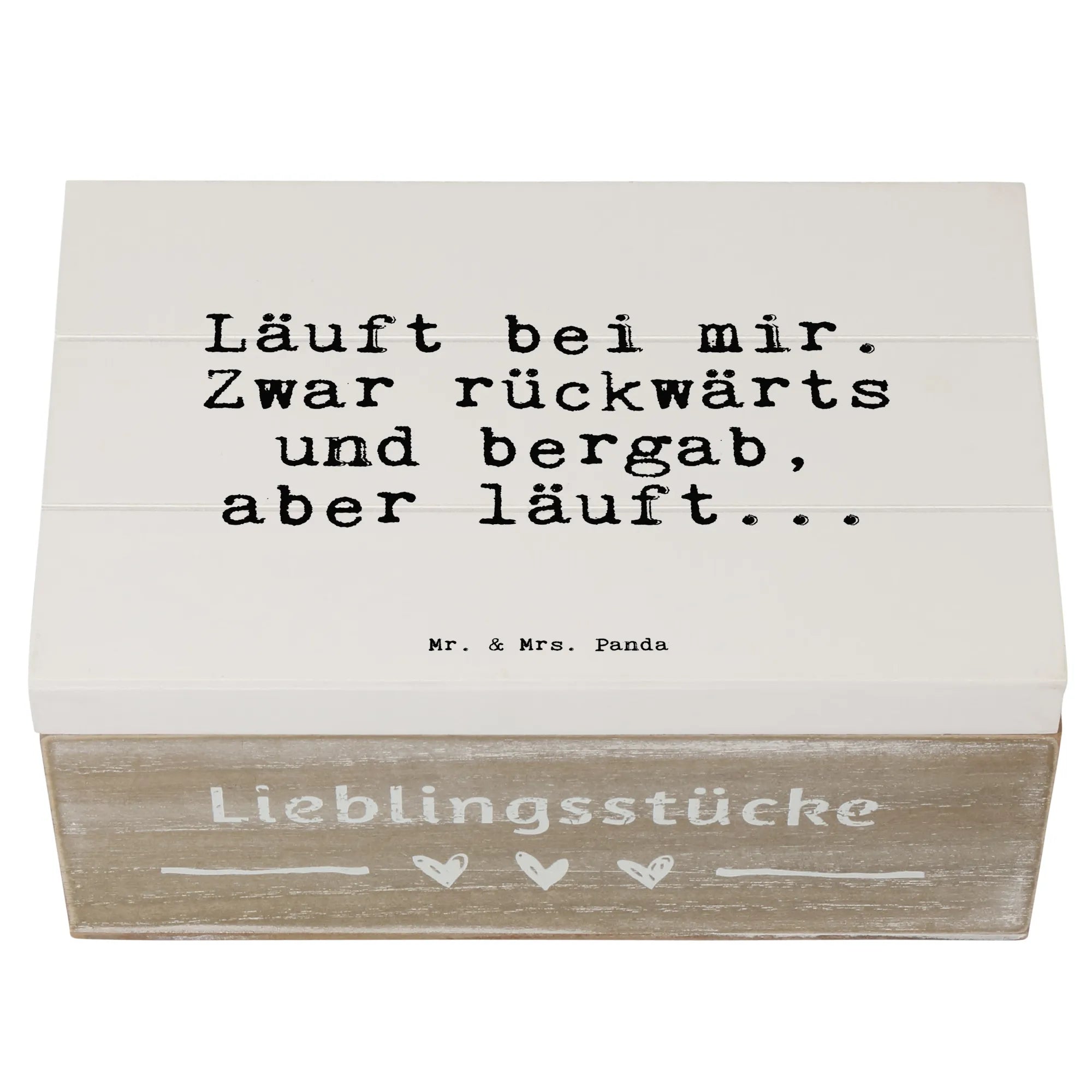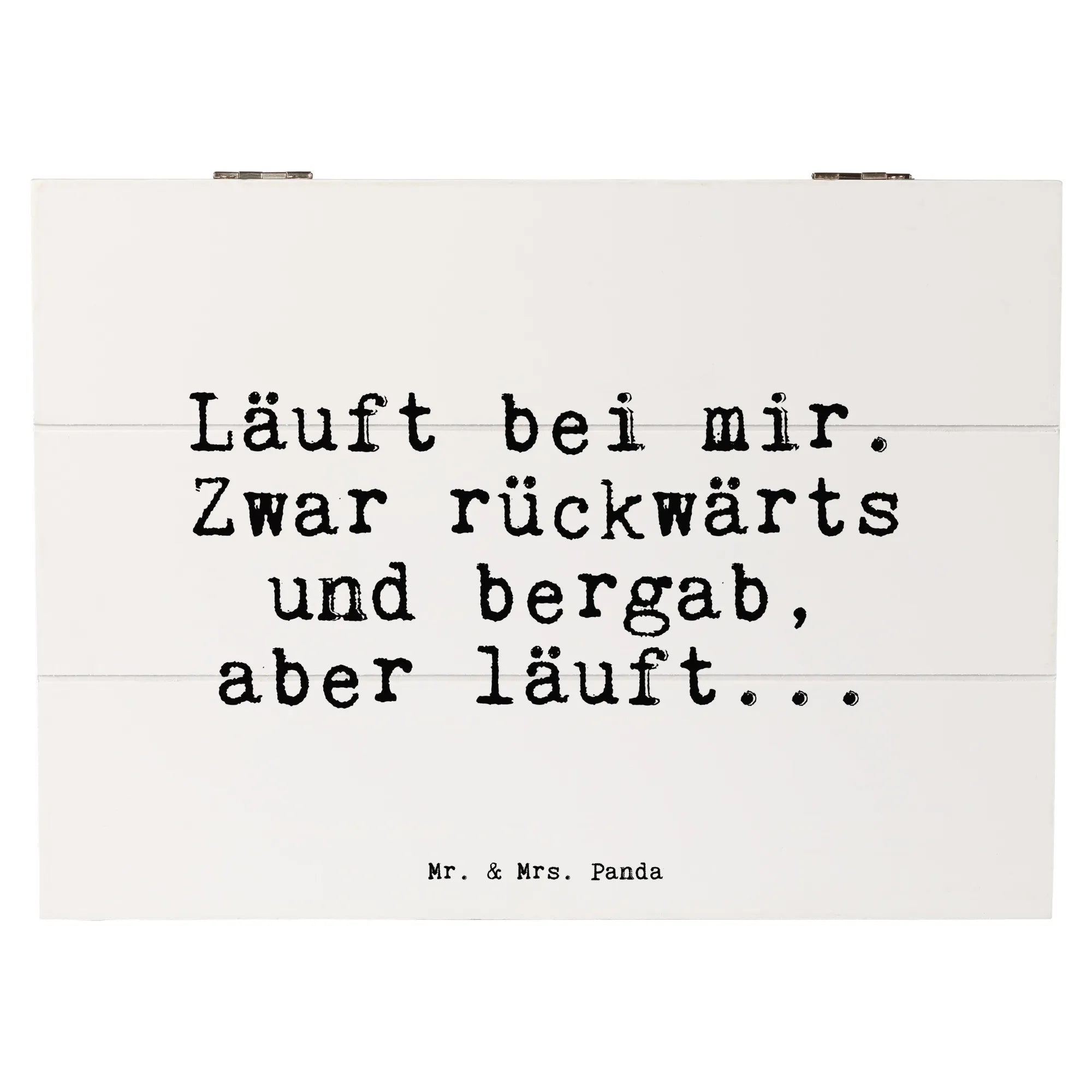 Die wunderschöne Holzkiste von Mr. & Mrs. Panda ist das perfekte Geschenk für alle, die das Leben mit einem Lächeln genießen. Bedruckt mit dem motivierenden Spruch: „Läuft bei mir. Zwar rückwärts und bergab, aber läuft...“ bringt sie Freude und einen Hauch von Humor in jedes Zuhause.