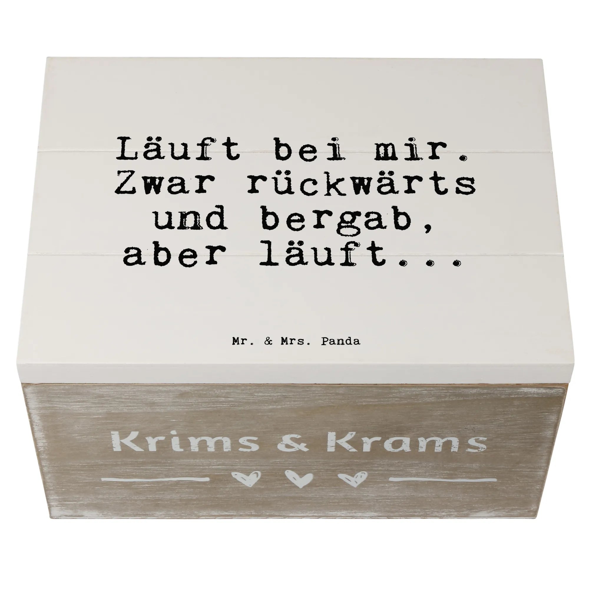 Hast du dich jemals gefragt, wie man das herrliche Chaos des Alltags am besten einfängt? Unsere Holzkiste von Mr. & Mrs. Panda mit dem herrlich ehrlichen Spruch Läuft bei mir. Zwar rückwärts und bergab, aber läuft... ist genau die Antwort darauf. ✨