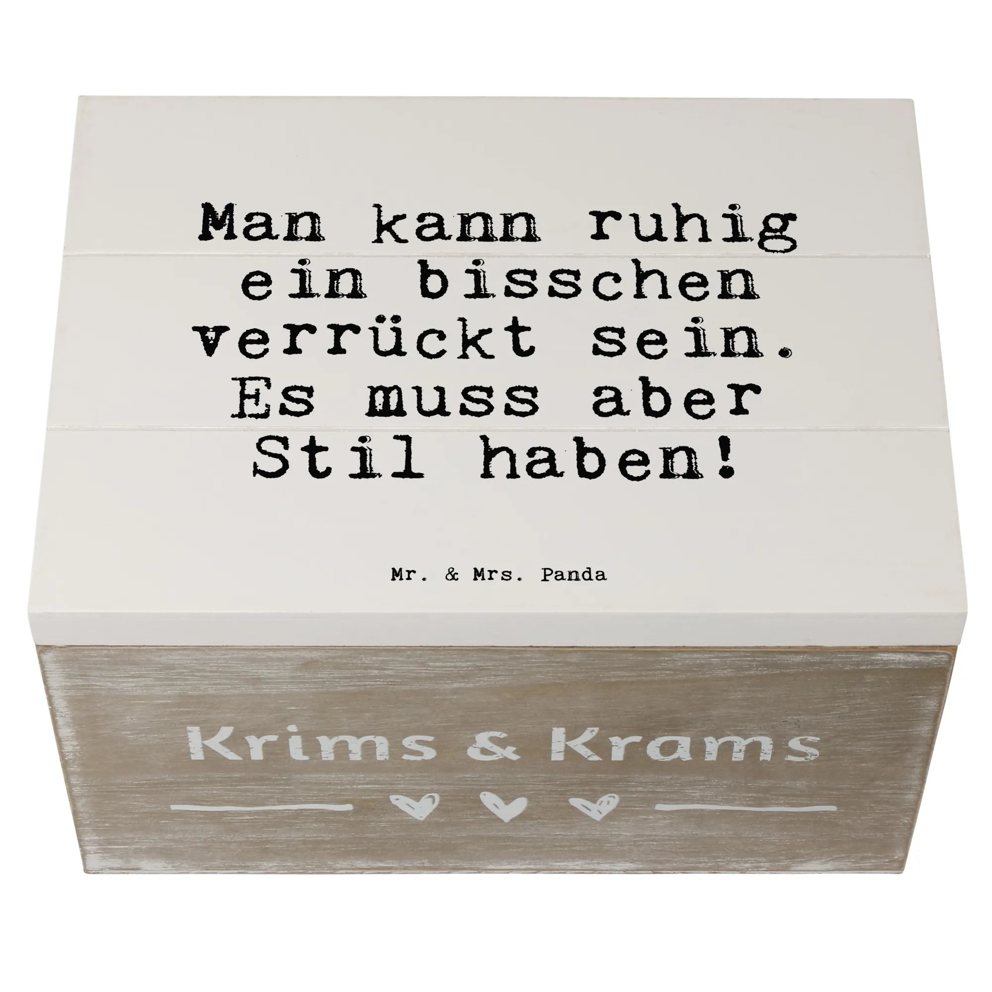 Die wunderschöne Holzkiste von Mr. & Mrs. Panda ist das perfekte Geschenk für alle, die das Besondere lieben. Mit dem liebevollen Spruch „Man kann ruhig ein bisschen verrückt sein. Es muss aber Stil haben!“ wird diese Kiste schnell zum absoluten Lieblingsstück.