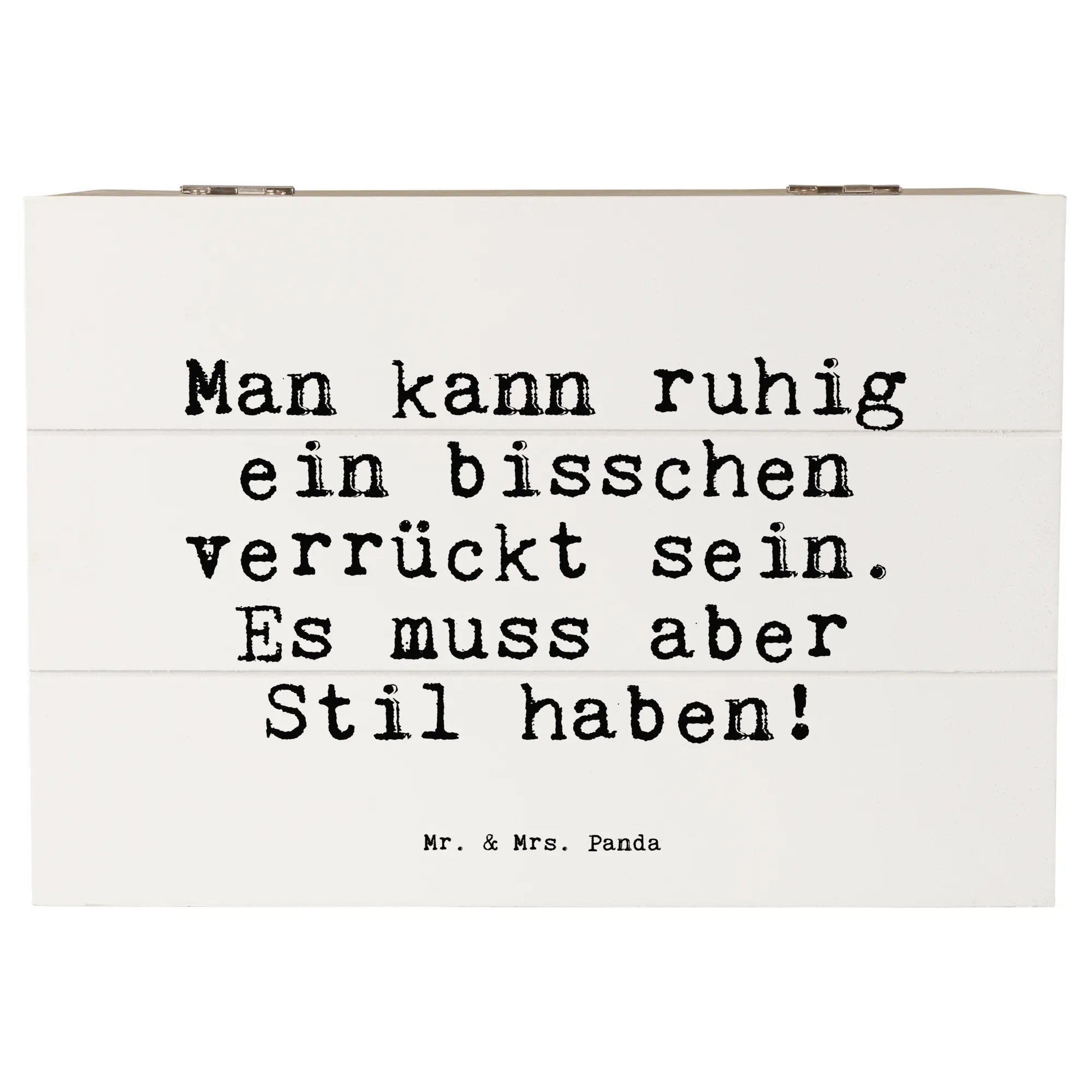Eine wunderschöne Holzkiste von Mr. & Mrs. Panda – bedruckt mit dem frechen Spruch „Man kann ruhig ein bisschen verrückt sein. Es muss aber Stil haben!“. Diese Holzbox mit Deckel ist mehr als nur Aufbewahrung: Sie ist ein Statement, ein Lächeln und ein liebevolles Geschenk für Frauen mit Stil. Ideal als Geschenk für die Freundin, zum Junggesellinnenabschied oder einfach als besondere Aufmerksamkeit.