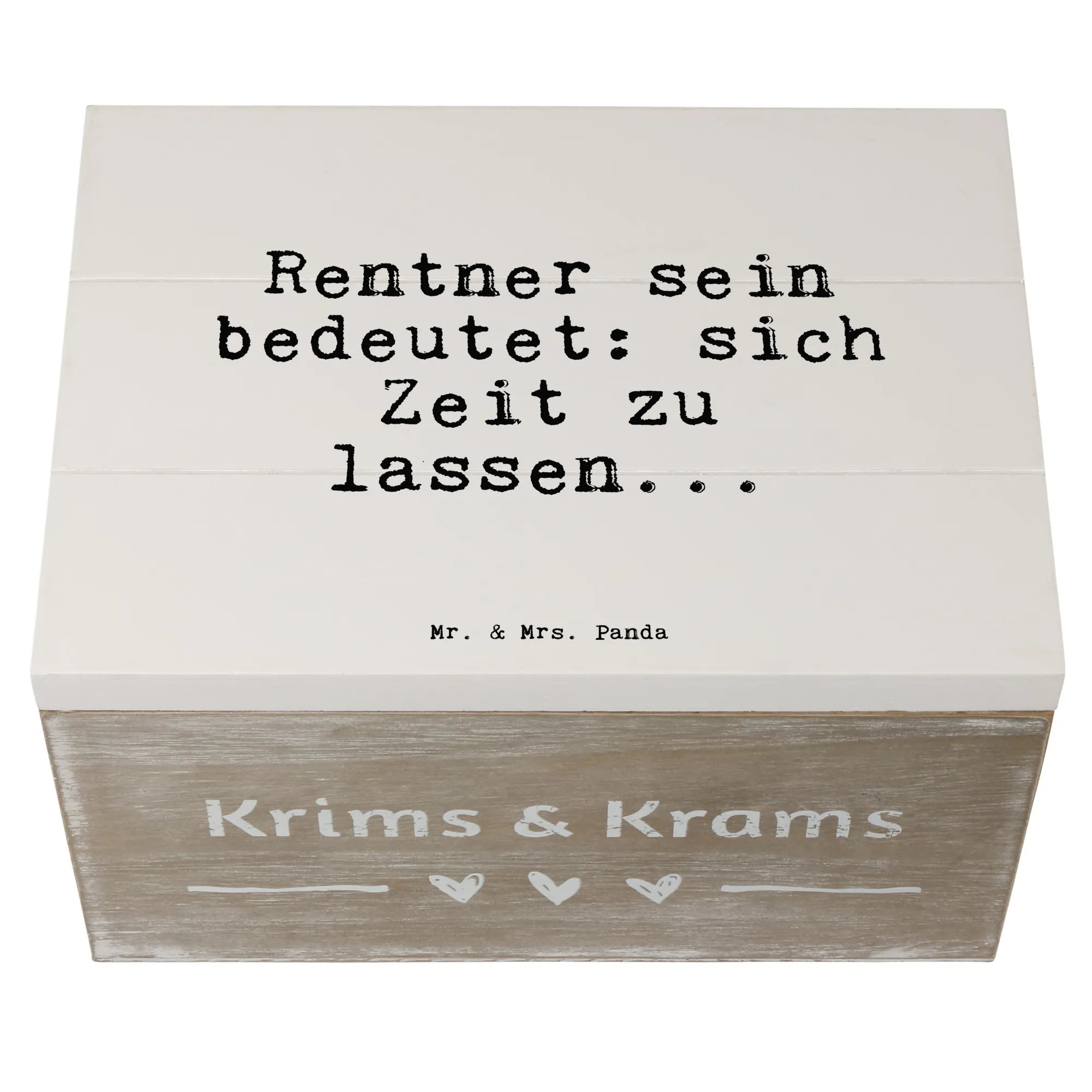 Entdecke die zauberhafte Holzkiste von Mr. & Mrs. Panda, die speziell für den neuen Lebensabschnitt von Rentnern entworfen wurde! Mit dem liebevollen Slogan "Rentner sein bedeutet: sich Zeit zu lassen..." ist diese schöne Erinnerungskiste nicht nur ein absoluter Hingucker, sondern auch ein perfekter Aufbewahrungsort für all die wertvollen Schätze, die Du im Laufe der Jahre angesammelt hast.