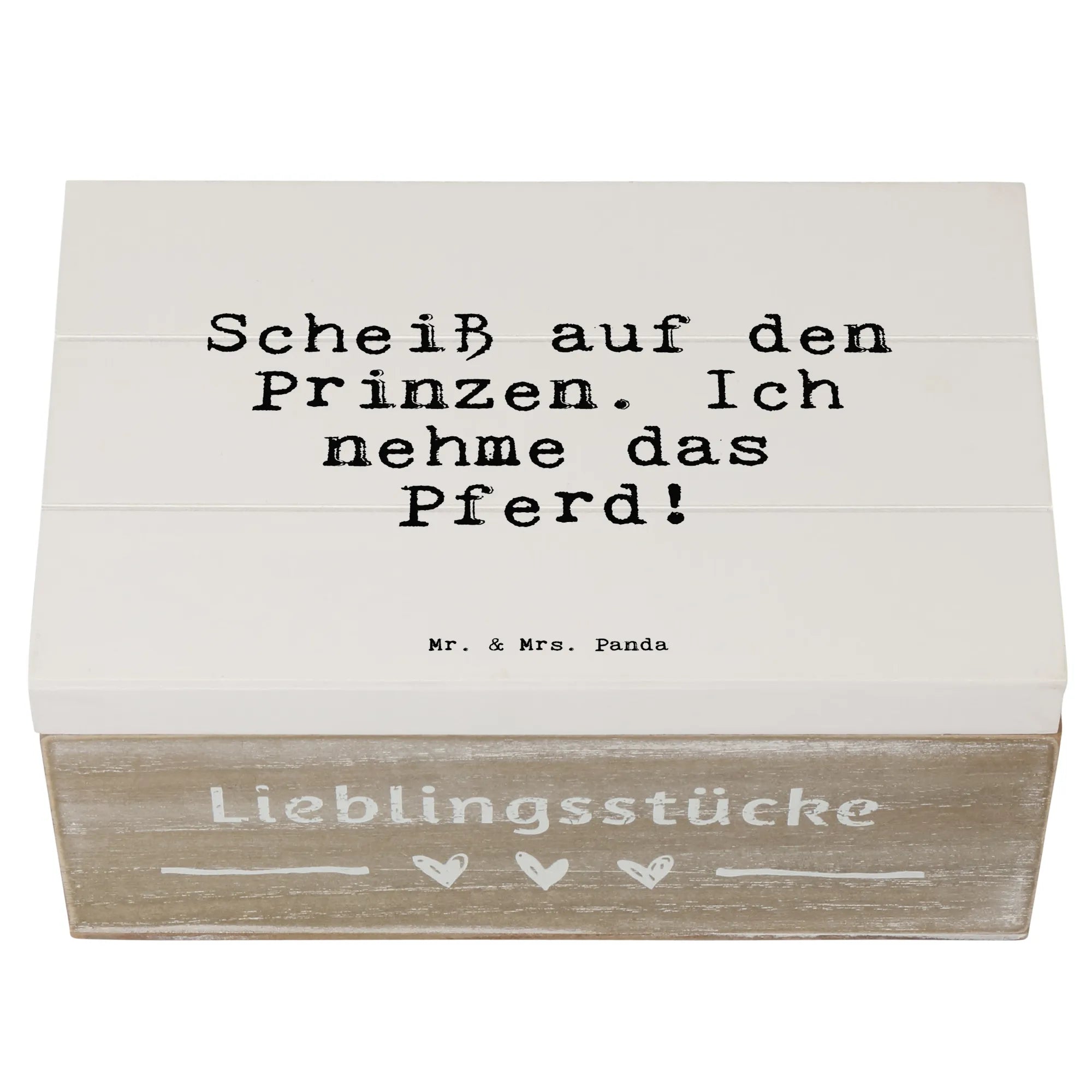 Entdecke die wunderschöne Holzkiste von Mr. & Mrs. Panda mit dem Spruch "Scheiß auf den Prinzen. Ich nehme das Pferd!". Diese einzigartige Kiste ist die perfekte Aufbewahrungslösung für all deine persönlichen Schätze und Erinnerungen.