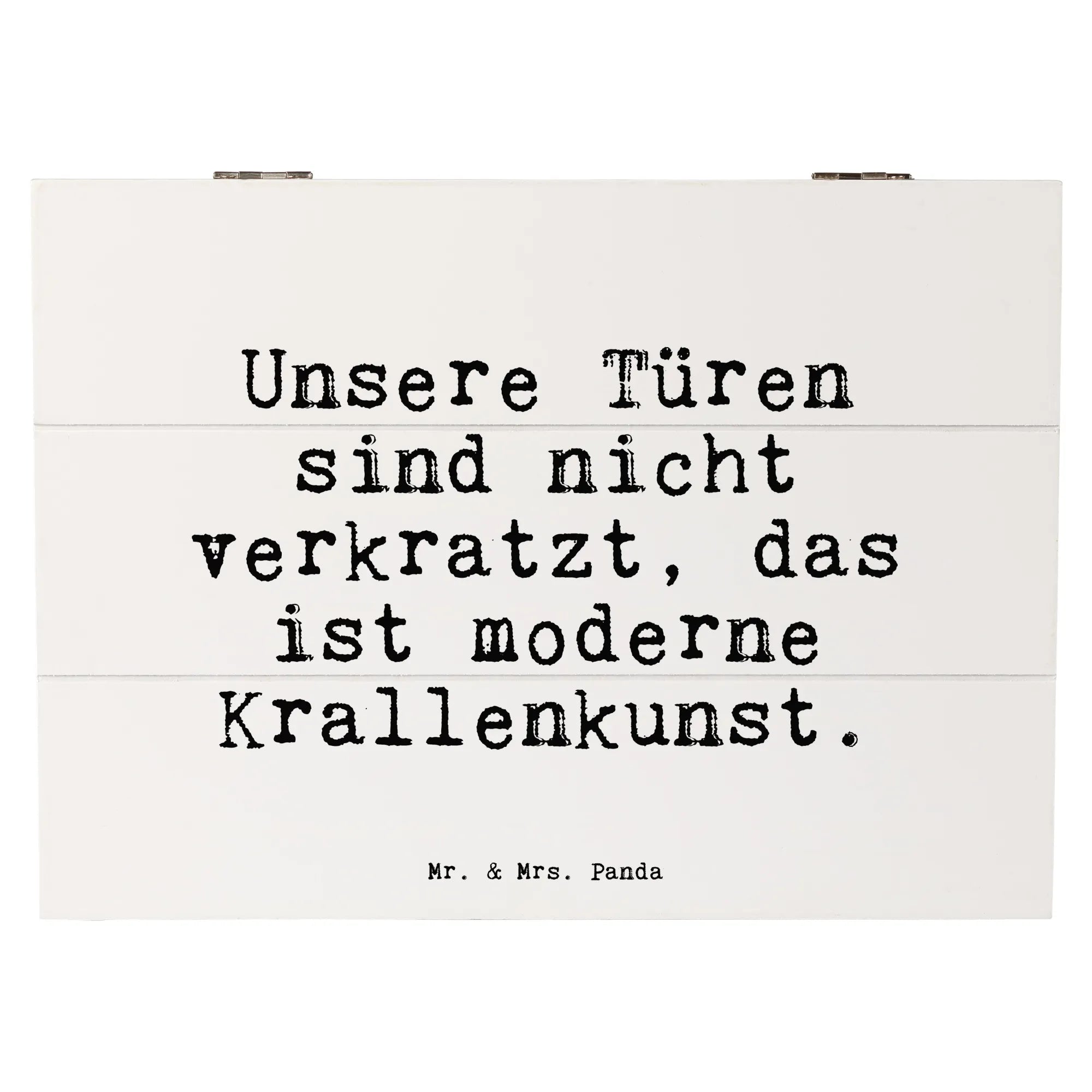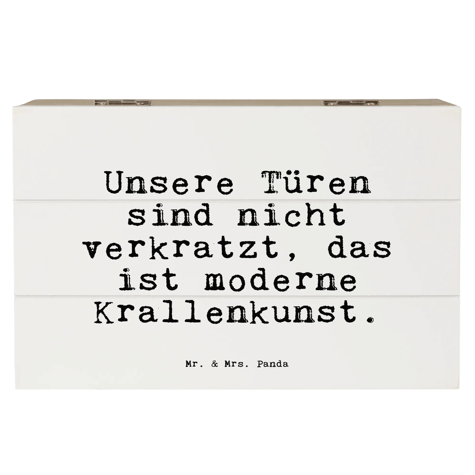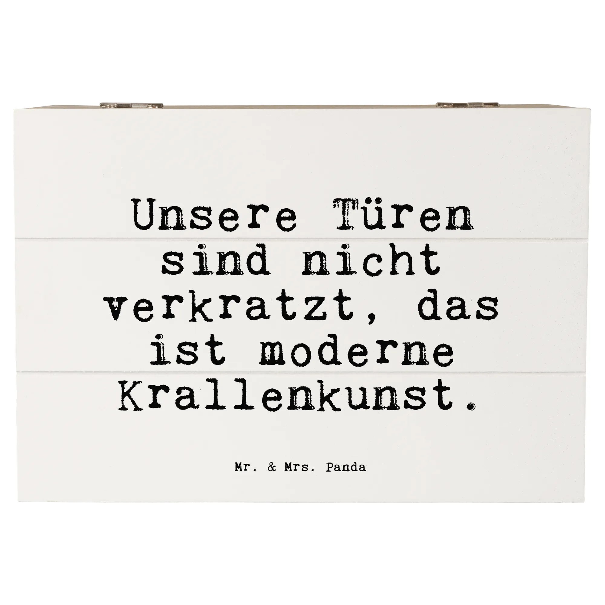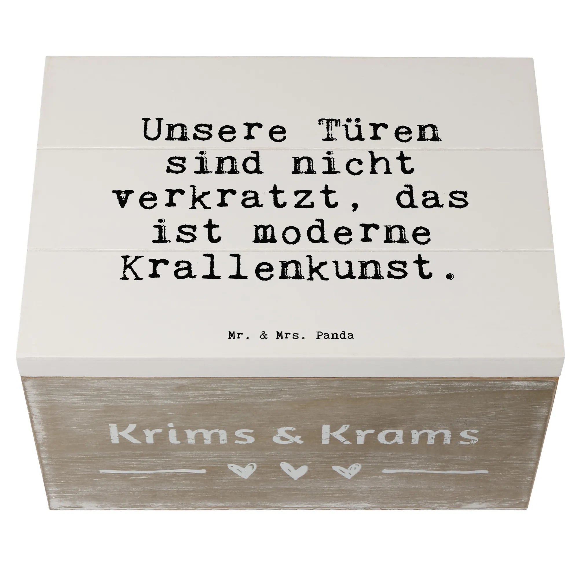 Die Holzkiste "Unsere Türen sind nicht verkratzt, das ist moderne Krallenkunst" von Mr. & Mrs. Panda ist nicht nur ein echter Hingucker, sondern auch der ideale Aufbewahrungsort für all deine wertvollen Schätze. Sie ist nicht nur hübsch, sondern auch unglaublich praktisch!