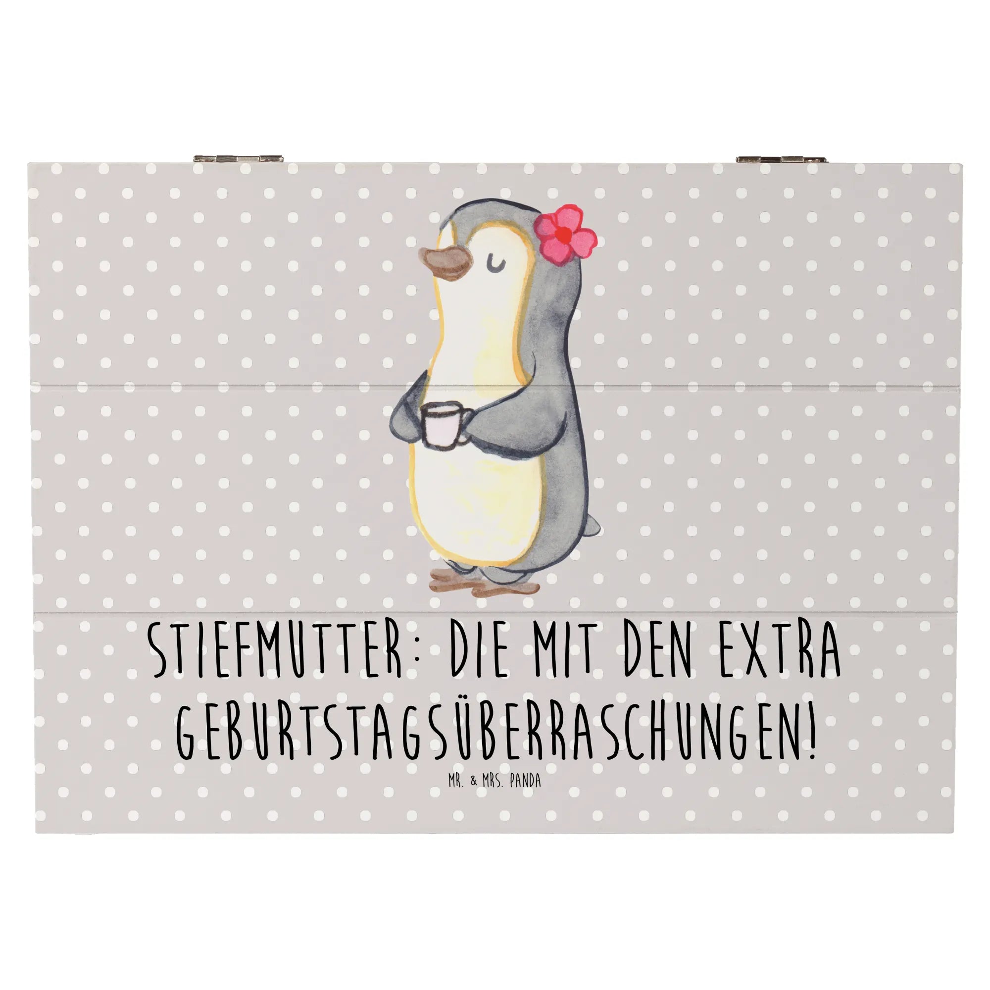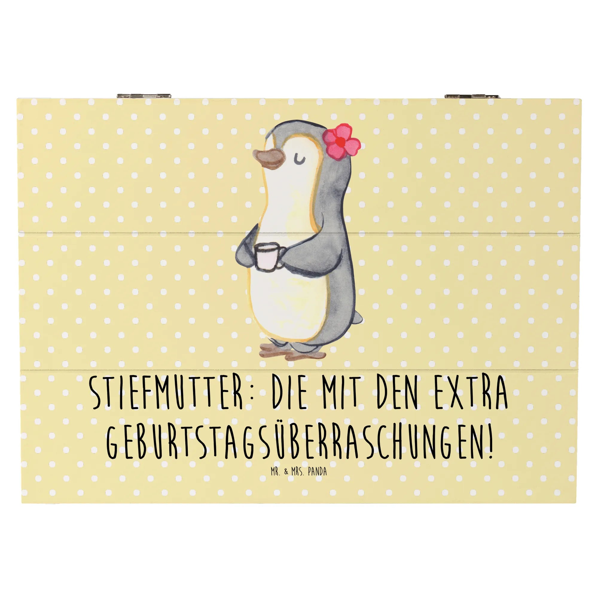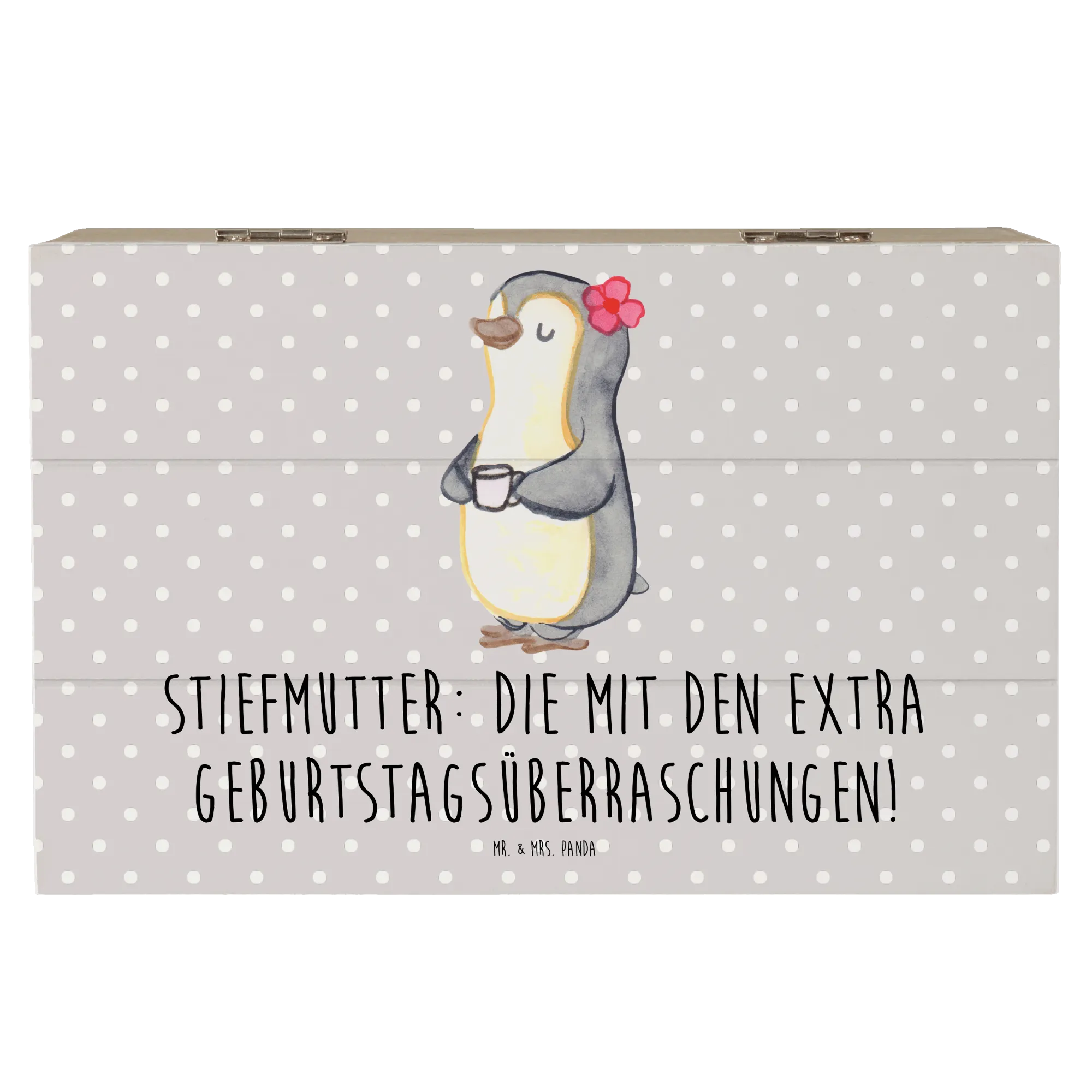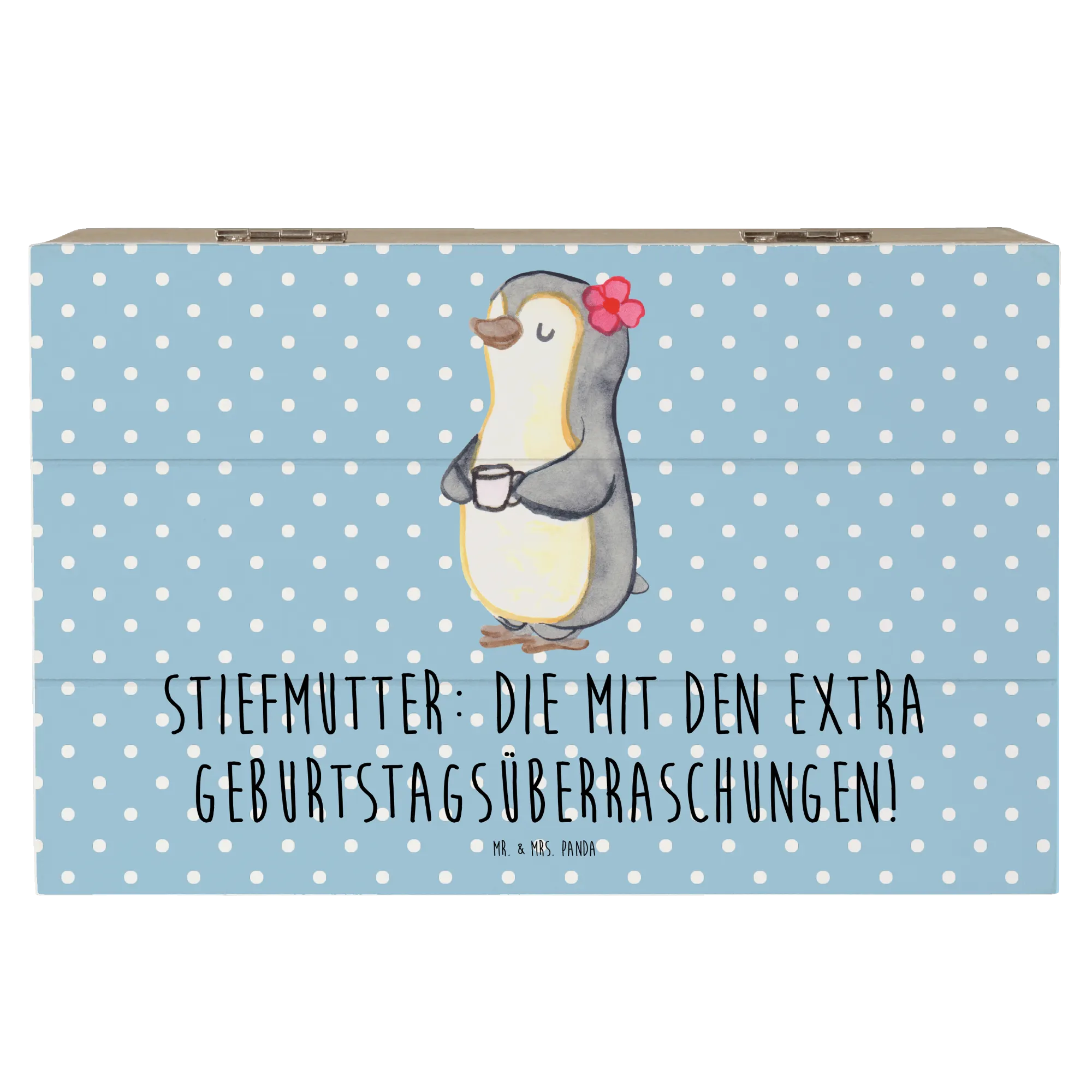 Die wunderschöne Holzkiste von Mr. & Mrs. Panda ist nicht nur ein praktisches Aufbewahrungselement, sondern auch eine zauberhafte Erinnerungskiste. Mit dem liebevollen Motiv "Stiefmutter: Die mit den extra Geburtstagsüberraschungen!" ist sie das perfekte Geschenk für alle Stiefmütter in Patchwork-Familien.