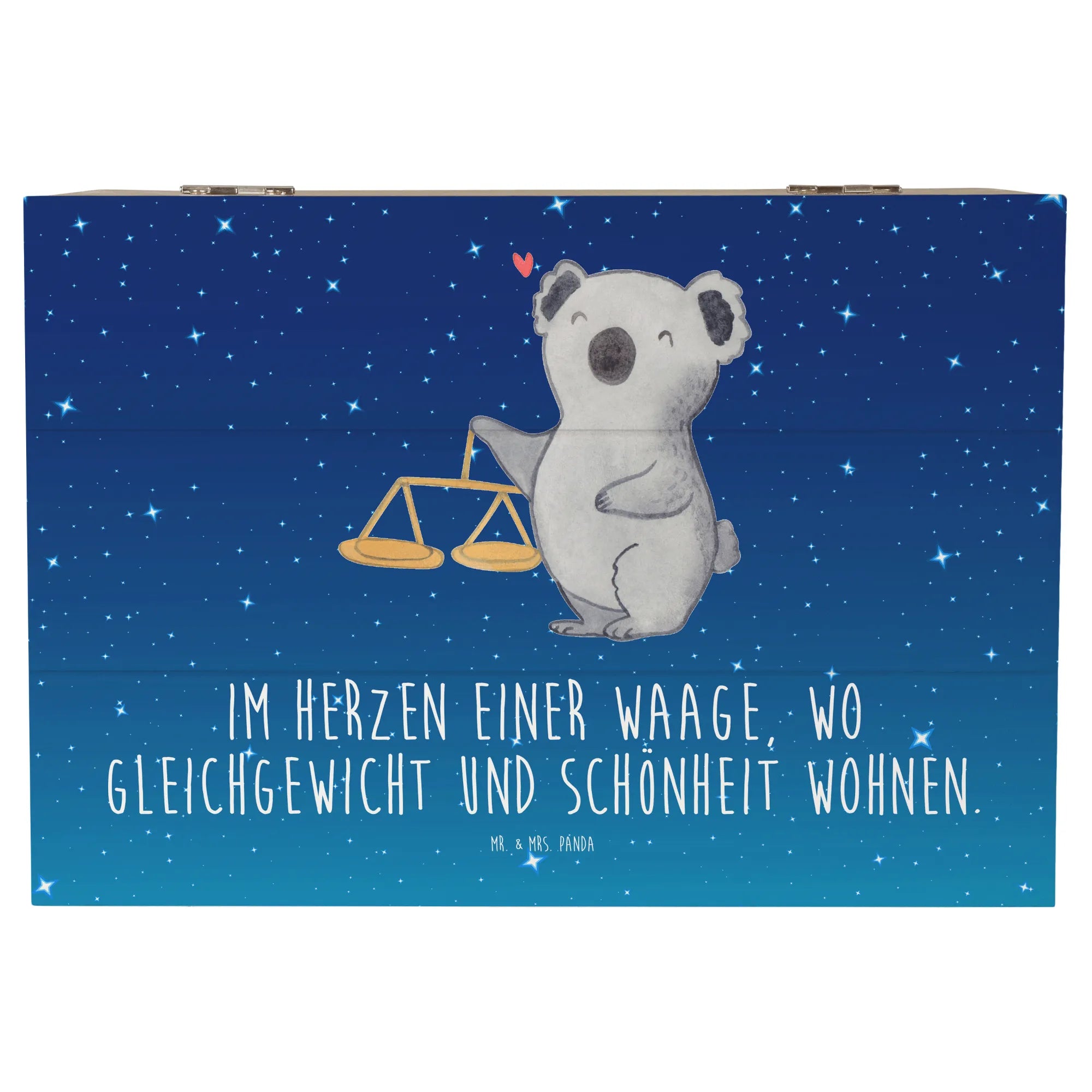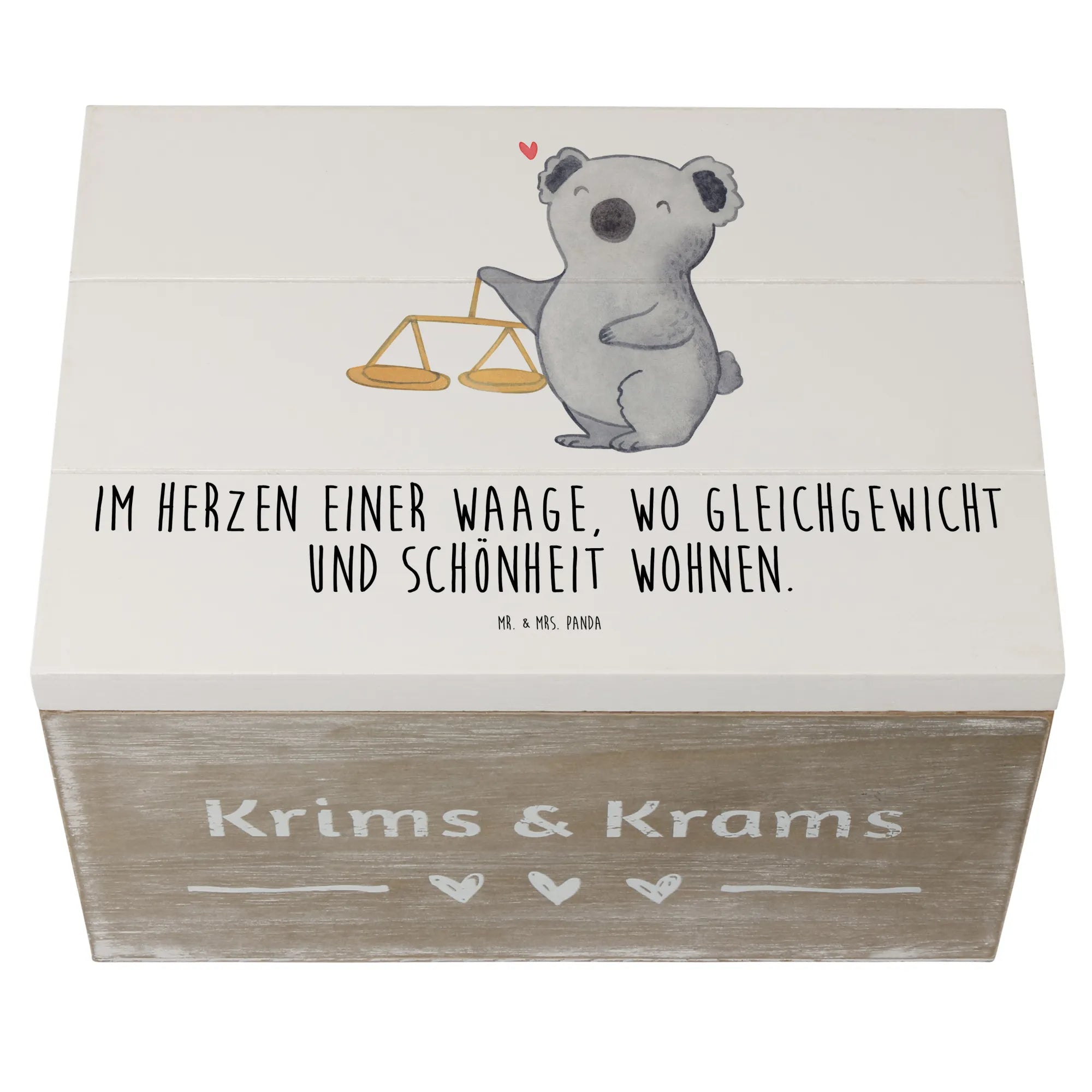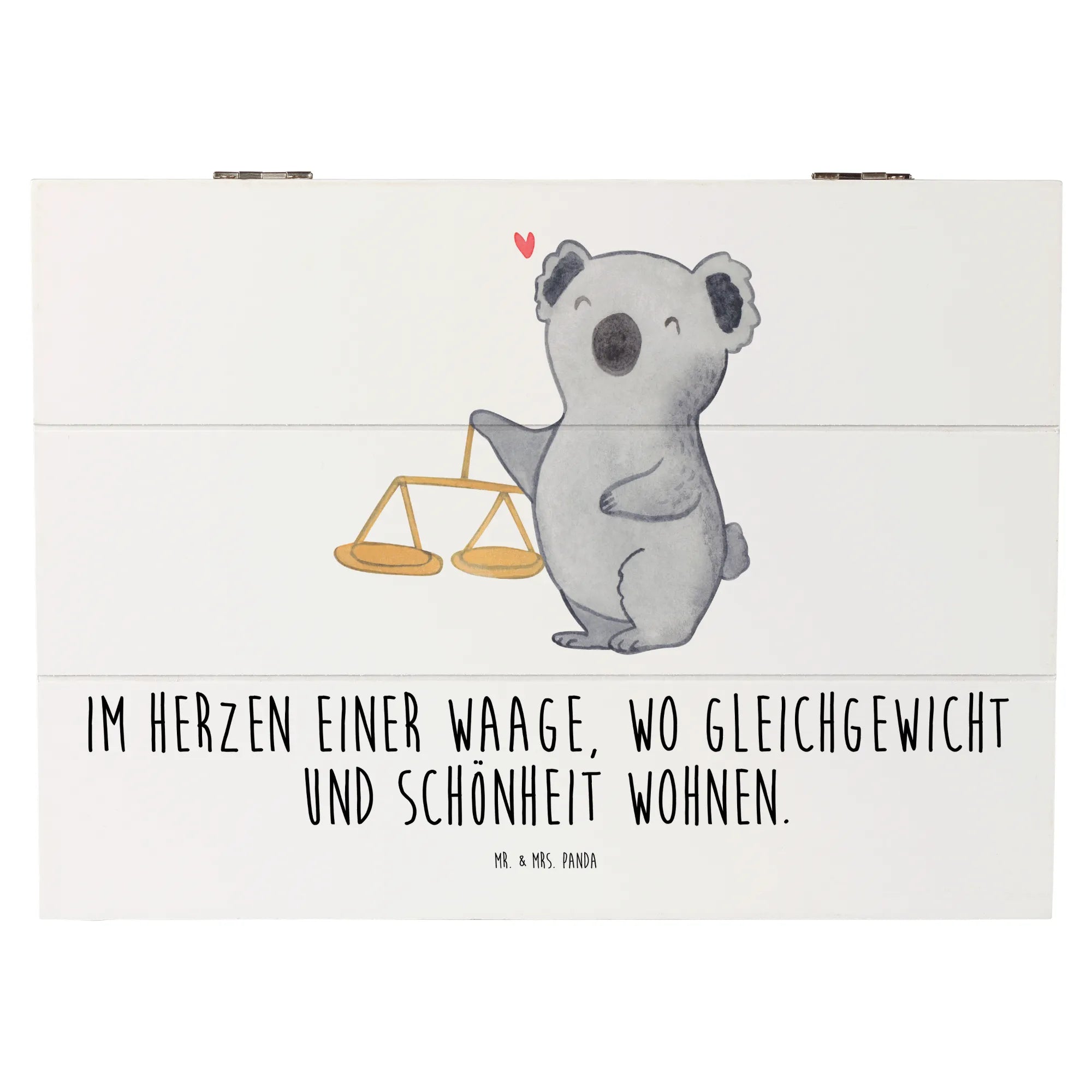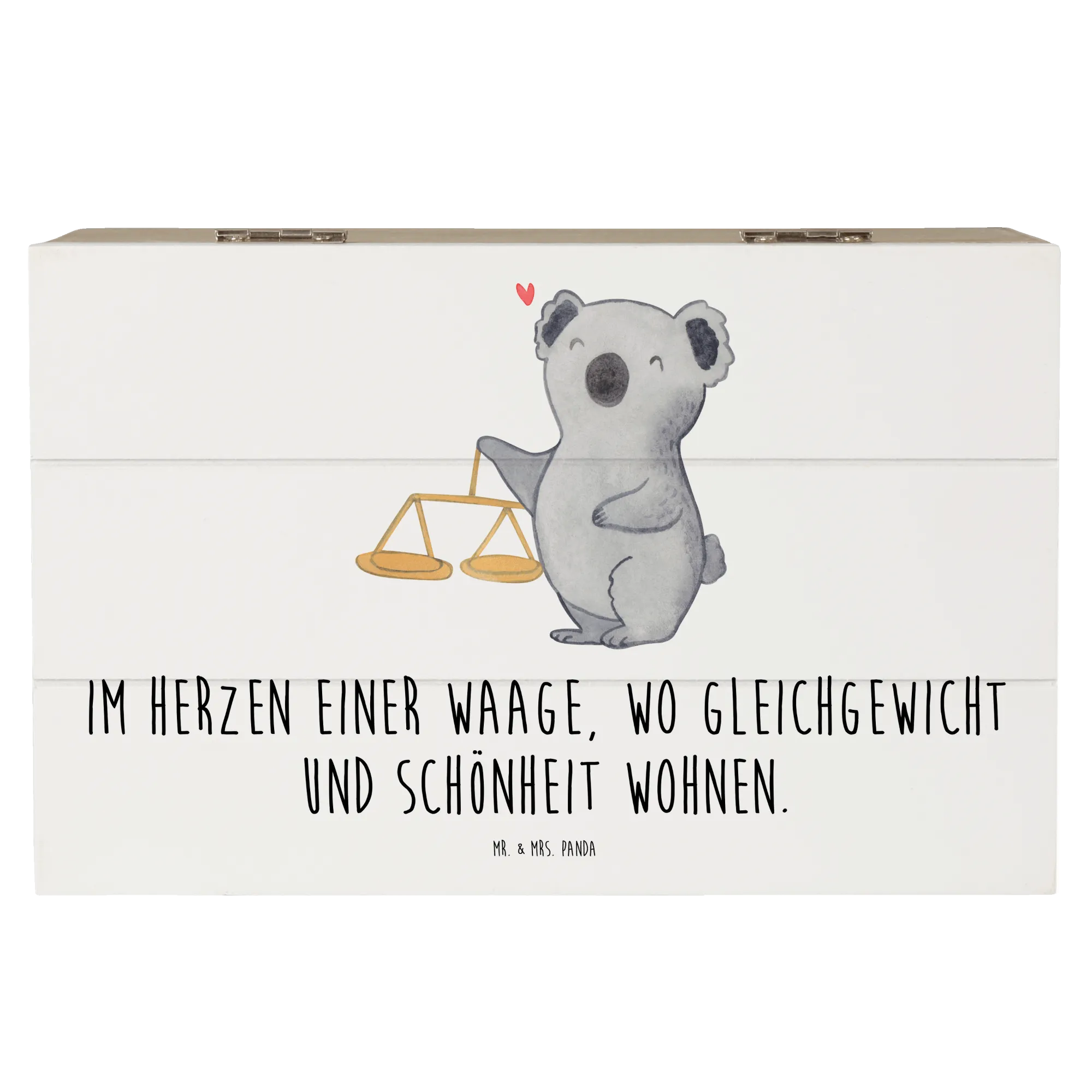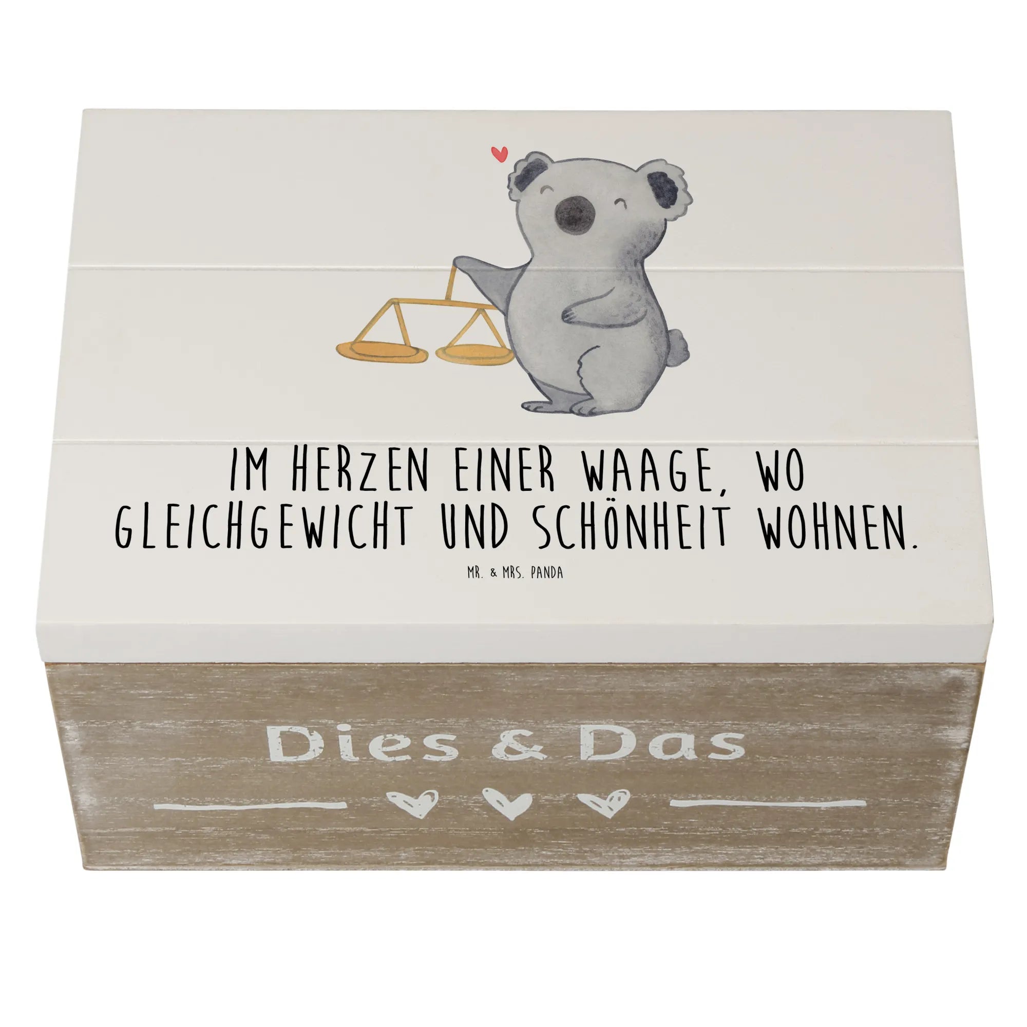 Suchst Du ein Geschenk, das persönlich, hübsch und praktisch zugleich ist? Unsere Holzkiste „Waage“ aus der Sternzeichen-Kollektion von Mr. & Mrs. Panda vereint genau diese Eigenschaften. Das liebevoll von Mrs. Panda handgezeichnete Motiv zeigt einen freundlichen Koala neben einer klassischen Balkenwaage und trägt den schönen Spruch: Im Herzen einer Waage, wo Gleichgewicht und Schönheit wohnen.