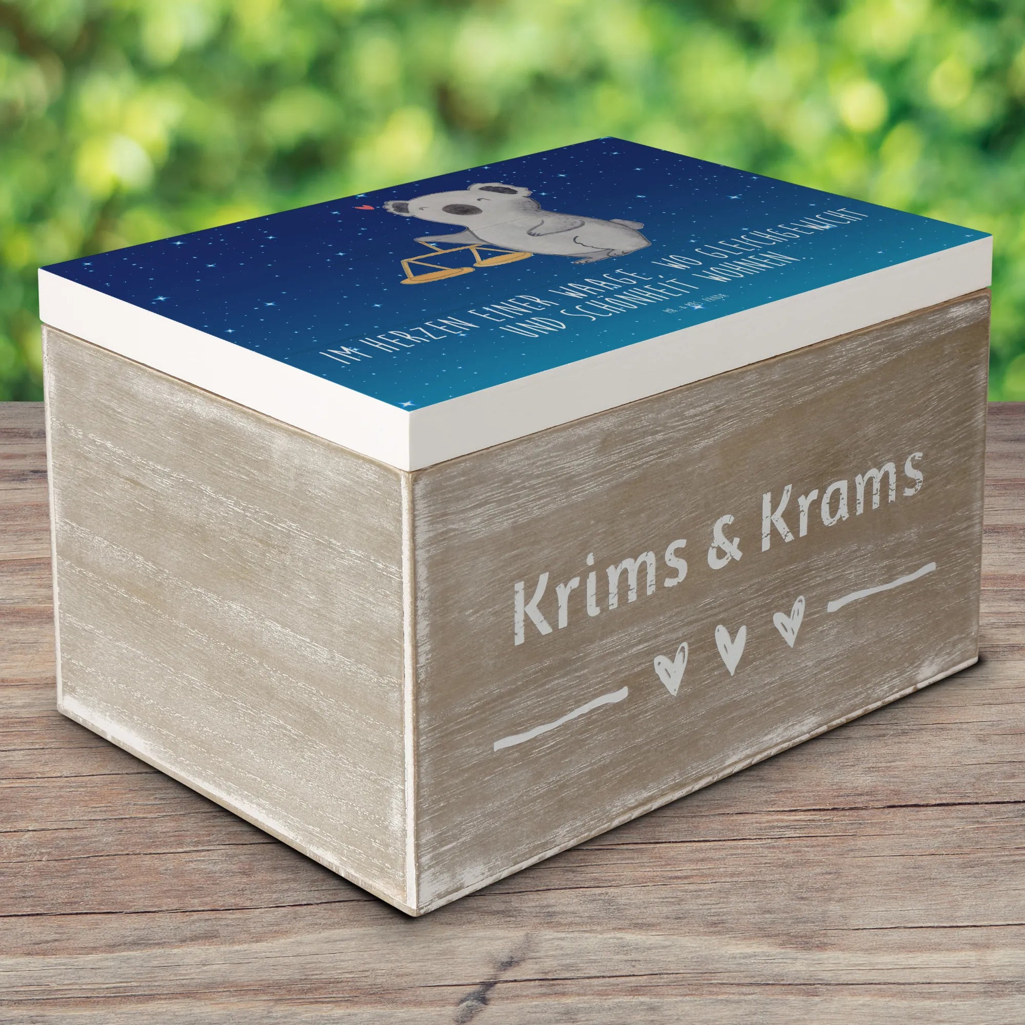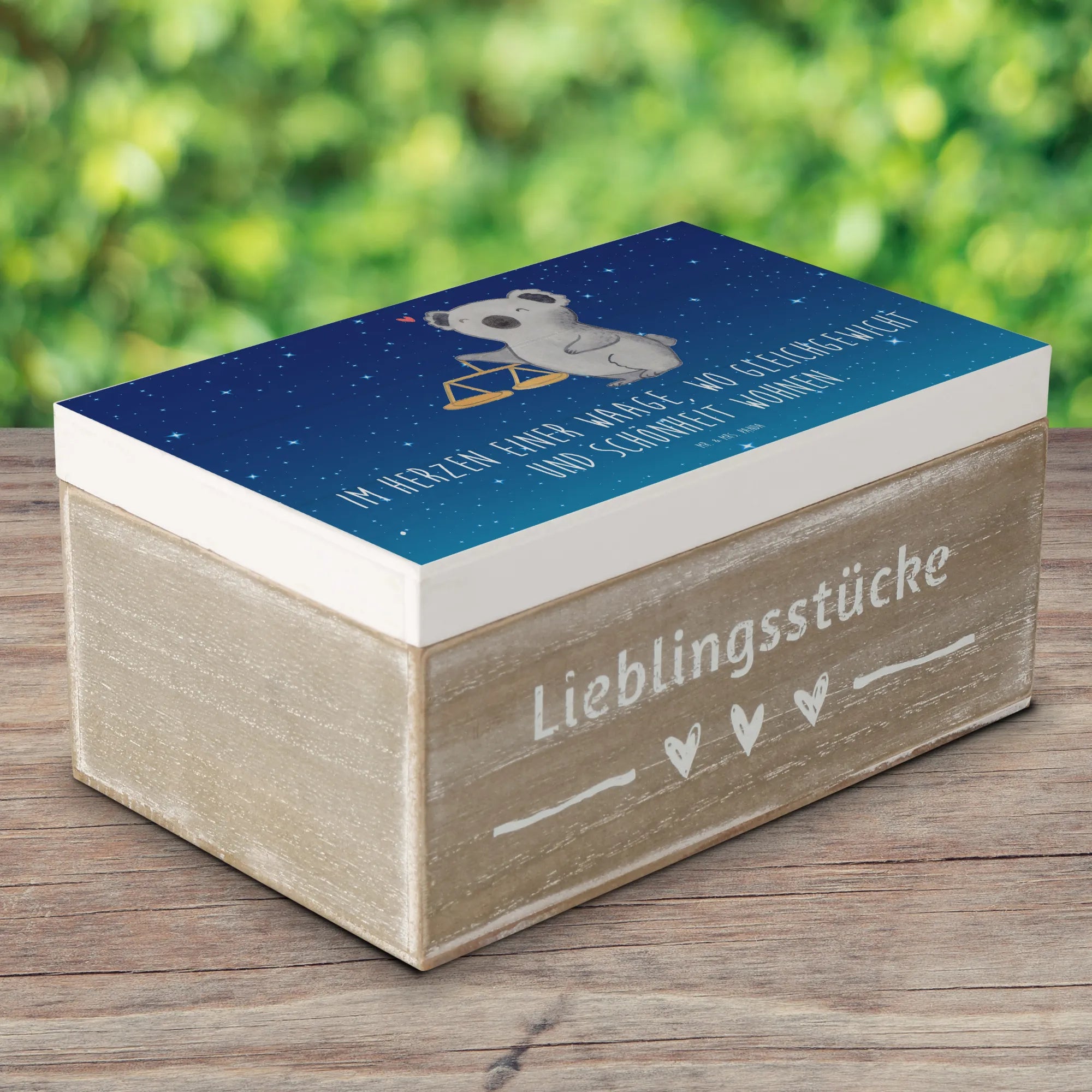 Das handgezeichnete Motiv zeigt einen süßen Koala neben einer eleganten Balkenwaage, das astrologische Symbol für das Sternzeichen Waage. Über dem Koala schwebt ein rotes Herz, das die Liebe und Harmonie widerspiegelt, die mit diesem Zeichen verbunden sind. Der Slogan "Im Herzen einer Waage, wo Gleichgewicht und Schönheit wohnen" verstärkt den sentimentalen Wert dieser Kiste.