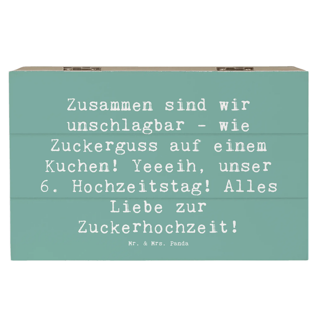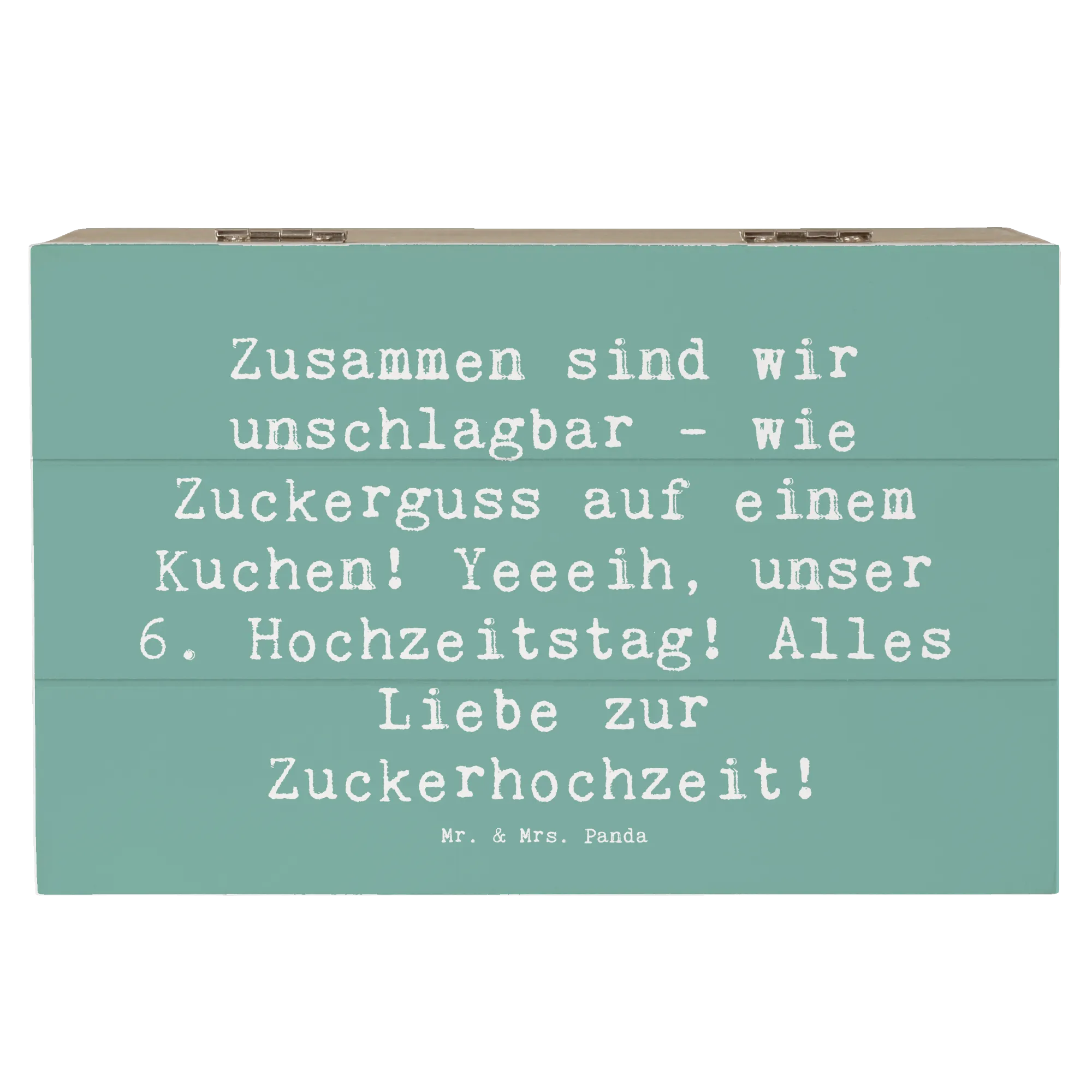 Entdecke die wunderschöne Holzkiste zum 6. Hochzeitstag, die aus robuster Holzfaser gefertigt ist und mit dem herzlichen Spruch "Zusammen sind wir unschlagbar - wie Zuckerguss auf einem Kuchen! Yeeeih, unser 6. Hochzeitstag! Alles Liebe zur Zuckerhochzeit!" verziert ist. Diese Erinnerungskiste eignet sich perfekt, um besondere Schätze und Erinnerungen aufzubewahren. Egal, ob du Fotos, kleine Geschenke oder Andenken aus deiner gemeinsamen Zeit darin verstauen möchtest – diese nostalgische Schatzkiste ist ideal dafür!