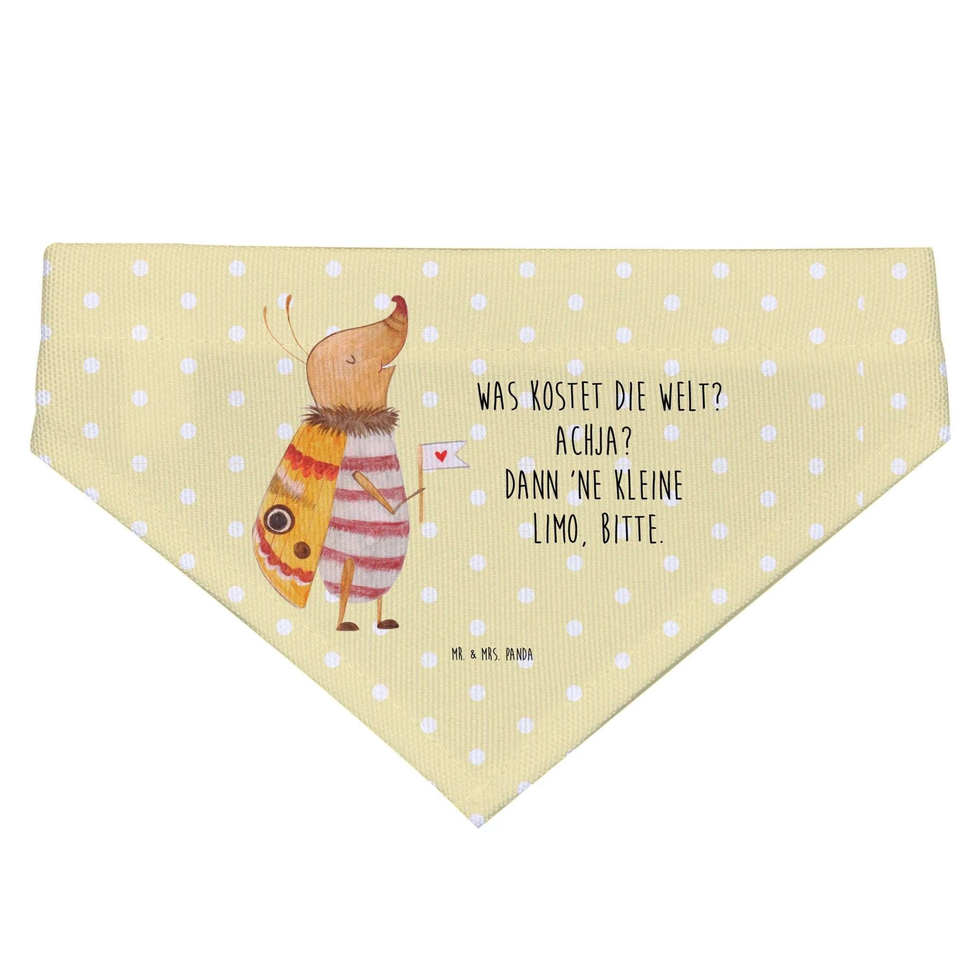 Das Hundehalstuch L mit dem bezaubernden Motiv 'Nachtfalter mit Fähnchen' aus der Small World Kollektion von Mr. & Mrs. Panda ist das perfekte Accessoire für große Hunde! Dieses hochwertige Hundehalstuch besticht durch sein süßes Design und den humorvollen Spruch 'Was kostet die Welt? Achja? Dann ne kleine Limo, bitte.' Dein Hund wird nicht nur stylisch aussehen, sondern auch mit diesem besonderen Tuch zum Blickfang in jeder Situation.