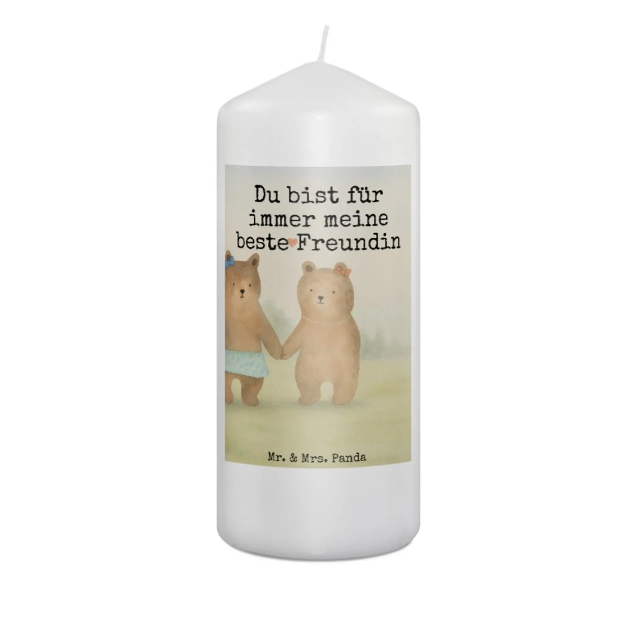 Die Kerze „Bär Freundin" von Mr. & Mrs. Panda ist ein liebevoll gestaltetes Geschenk, das Freundschaft und Zuneigung in warmes Licht taucht. Auf weißem Hintergrund halten zwei süße Bärenmädchen Händchen und der Schriftzug „Du bist für immer meine beste Freundin“ macht dieses Motiv zu einem emotionalen Andenken.