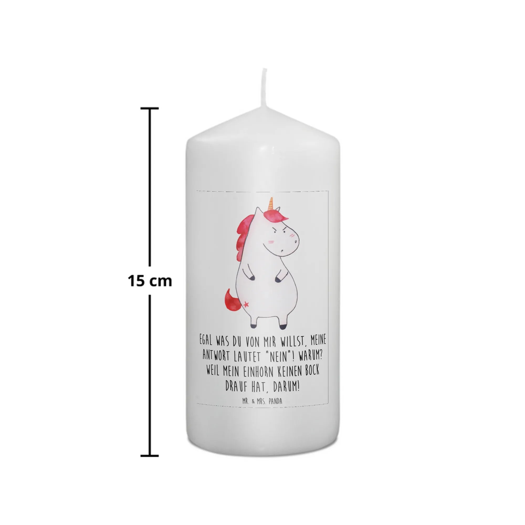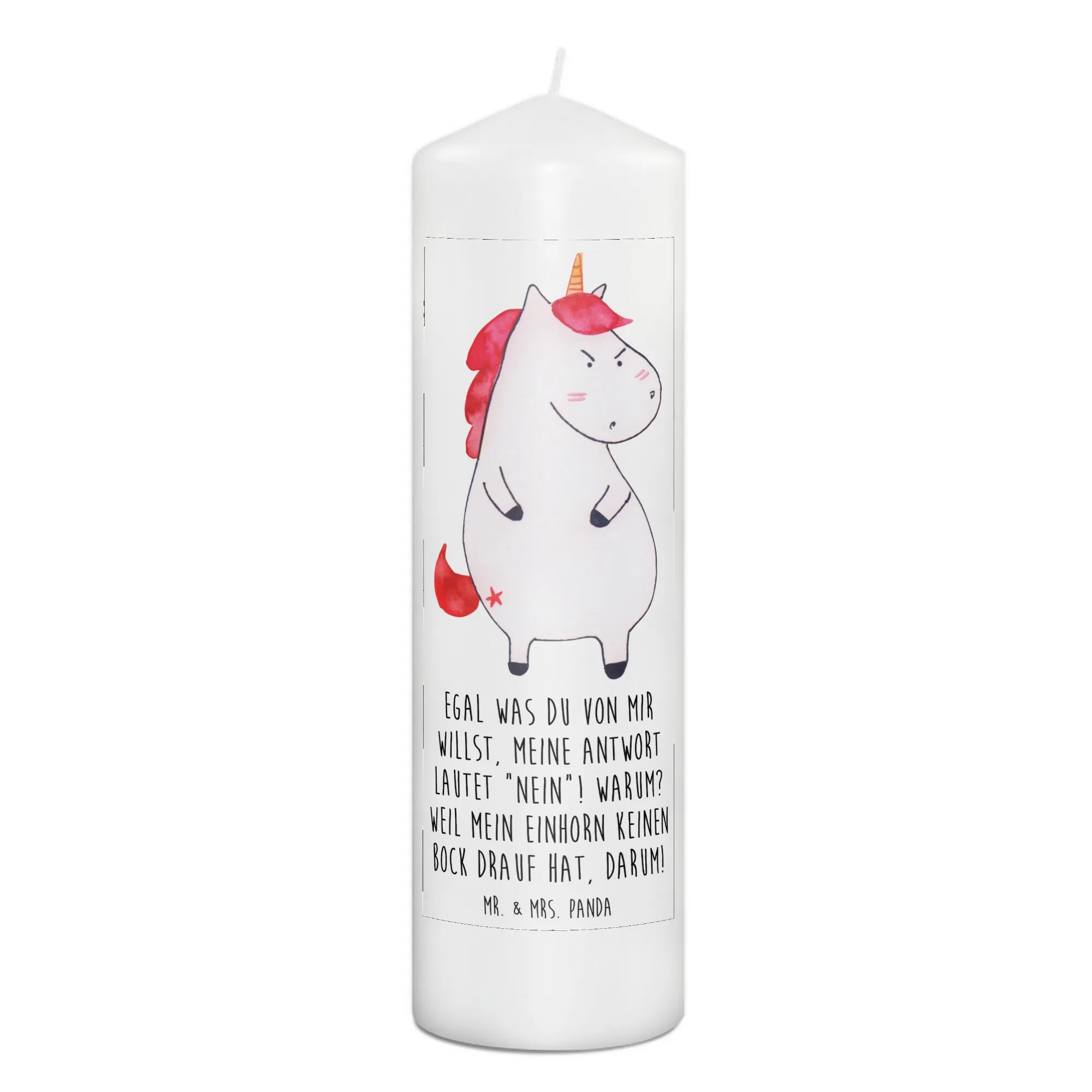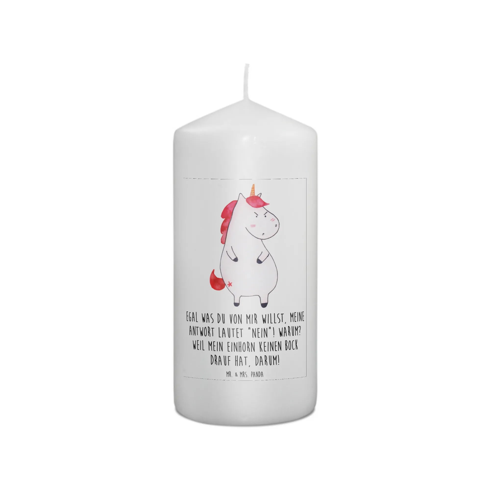Du bist auf der Suche nach dem perfekten Geschenk für einen Einhorn-Liebhaber? Dann ist die wütende Einhorn-Kerze von Mr. & Mrs. Panda genau das richtige für dich! Mit dem witzigen Slogan "Egal was du von mir willst, meine Antwort lautet 'Nein'! Warum? Weil mein Einhorn keinen Bock drauf hat, darum!" bringt diese Kerze ein Lächeln in jeden Raum. Ideal für Geburtstage oder als süßes Taufgeschenk, sorgt diese Kerze für gute Laune und eine besondere Stimmung. Durch ihre ultralange Brenndauer von bis zu 60 Stunden kannst du sie immer wieder anzünden und das warm-gediegene Licht genießen.