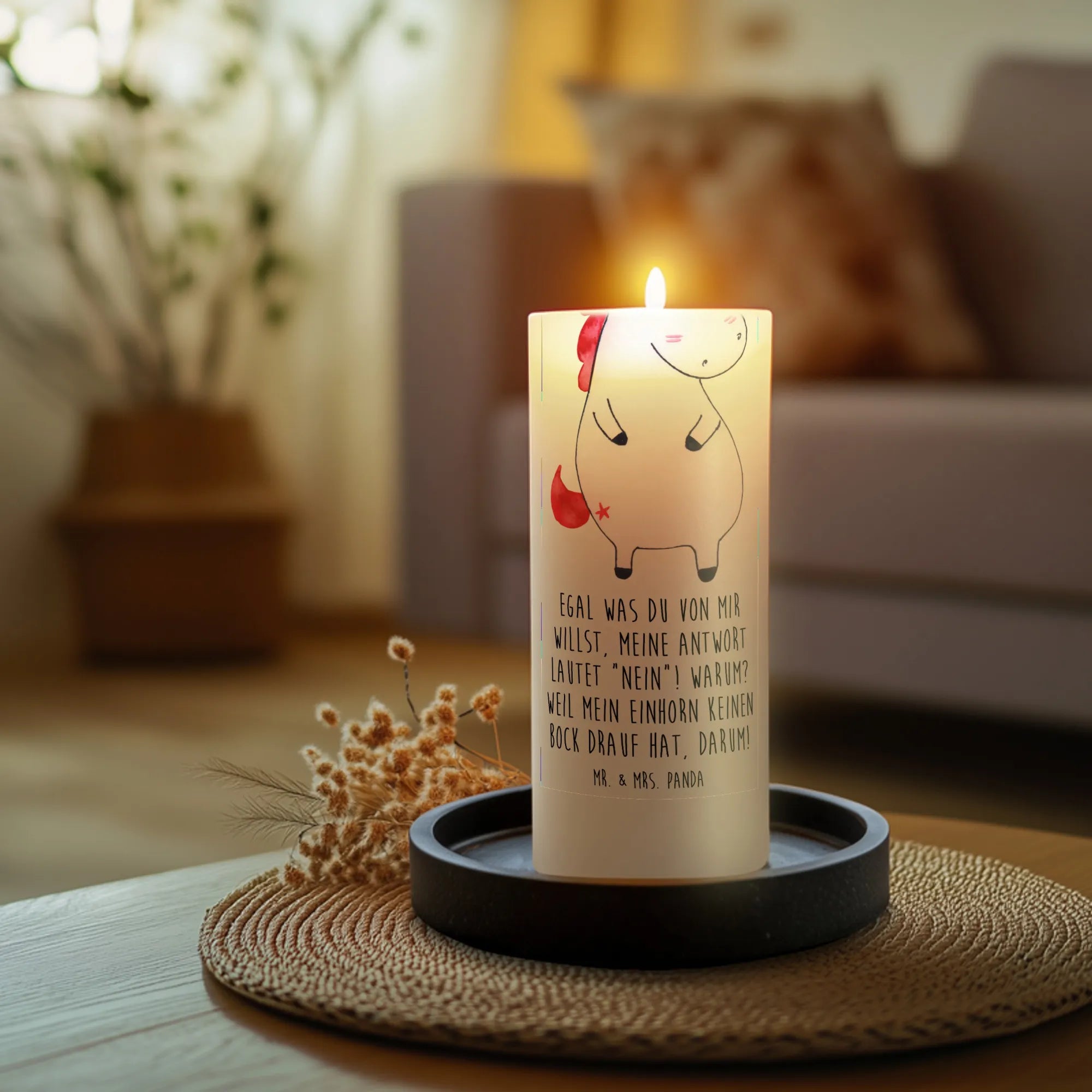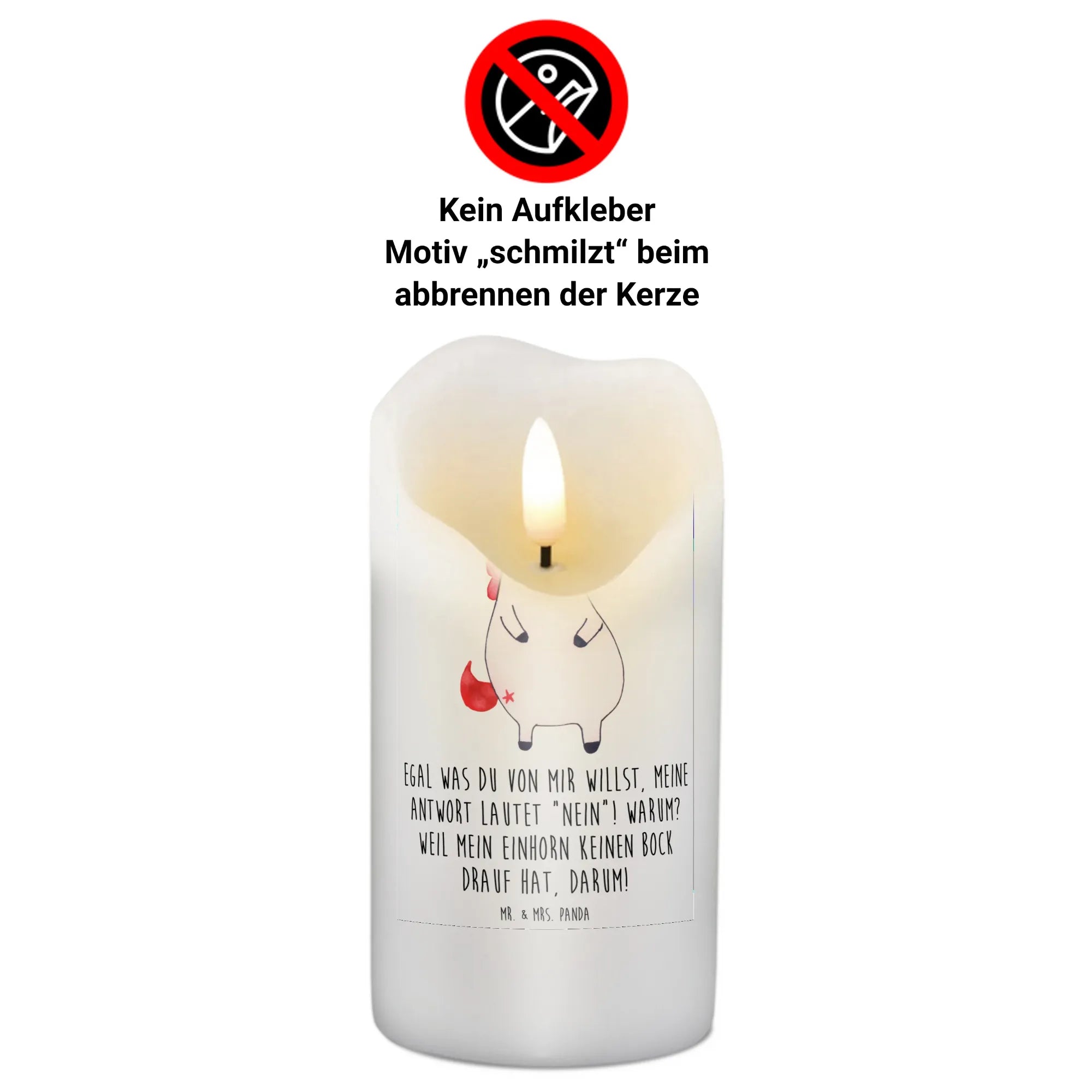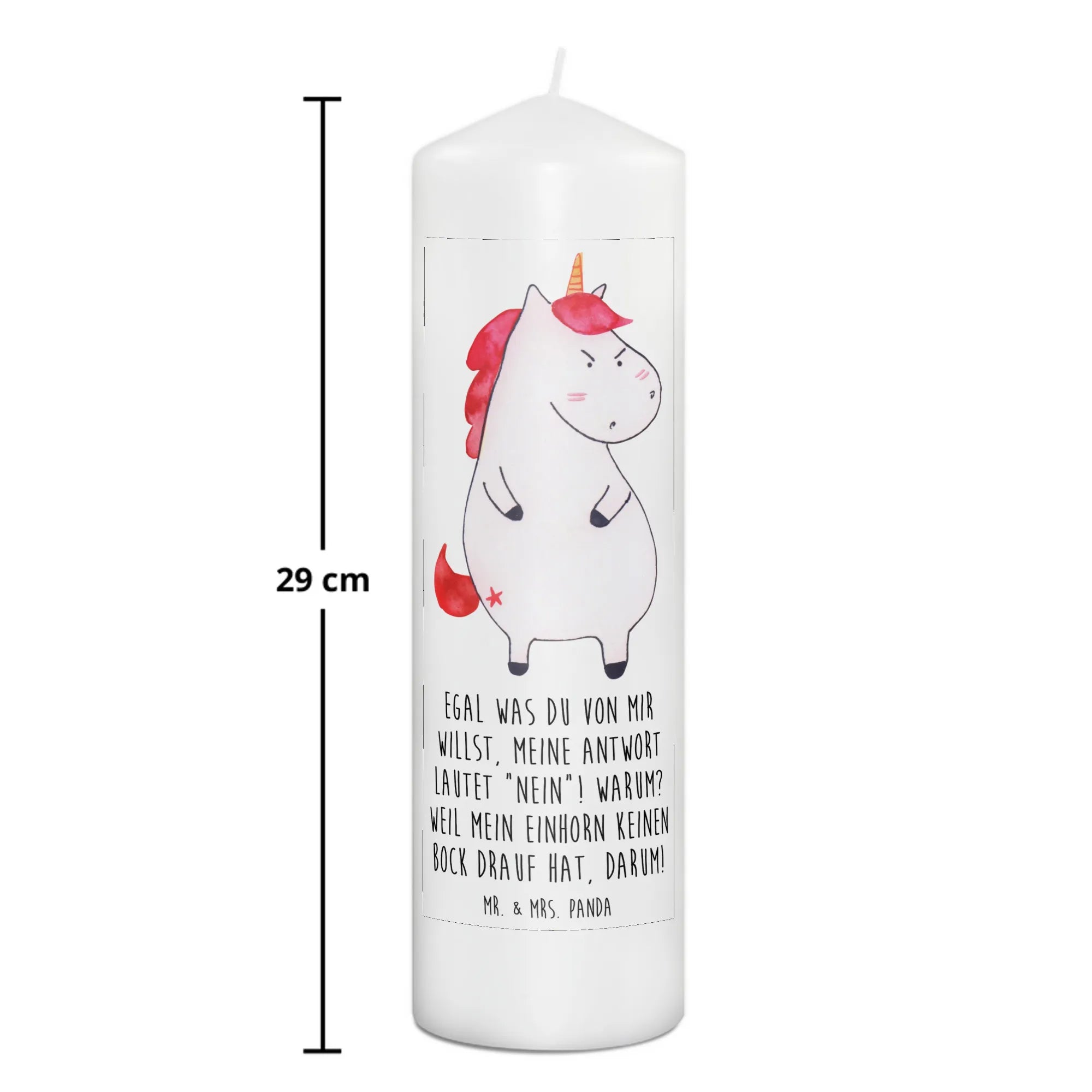 Du bist auf der Suche nach dem perfekten Geschenk für einen Einhorn-Liebhaber? Dann ist die wütende Einhorn-Kerze von Mr. & Mrs. Panda genau das richtige für dich! Mit dem witzigen Slogan "Egal was du von mir willst, meine Antwort lautet 'Nein'! Warum? Weil mein Einhorn keinen Bock drauf hat, darum!" bringt diese Kerze ein Lächeln in jeden Raum. Ideal für Geburtstage oder als süßes Taufgeschenk, sorgt diese Kerze für gute Laune und eine besondere Stimmung. Durch ihre ultralange Brenndauer von bis zu 60 Stunden kannst du sie immer wieder anzünden und das warm-gediegene Licht genießen.