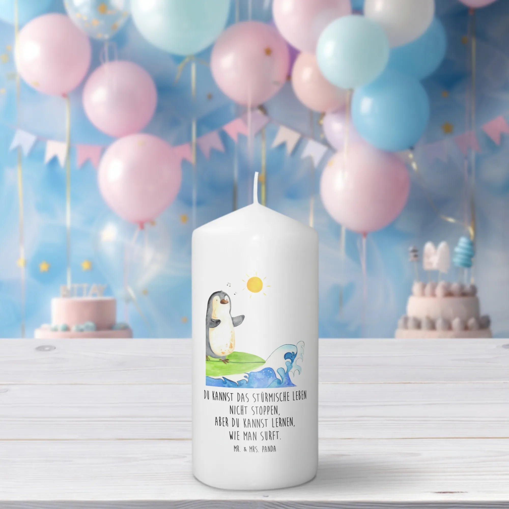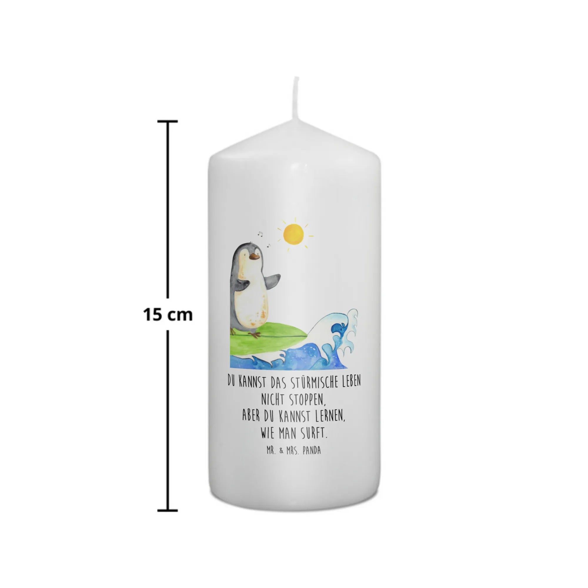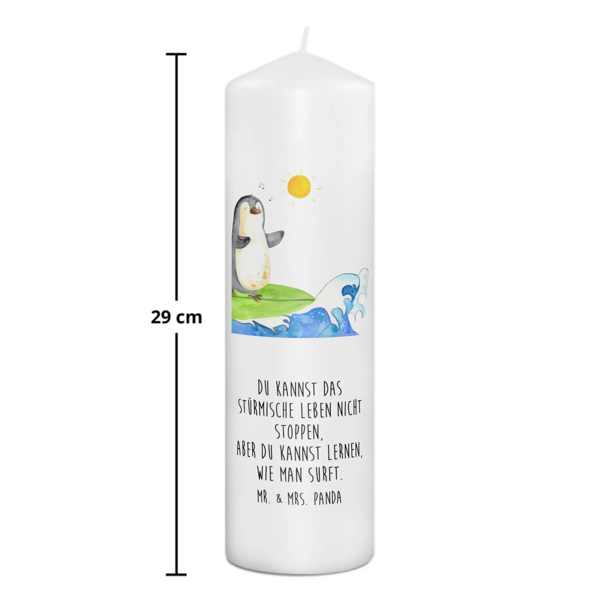 Die Pinguin Surfer Kerze von Mr. & Mrs. Panda ist das perfekte Geschenk für jeden Anlass! Ob zur Taufe, Kommunion oder als Geburtstagsgeschenk – diese Kerze wird garantiert Freude bereiten. Mit einem einzigartigen Motiv eines coolen Pinguins auf seinem Surfbrett, der entspannt über die Wellen gleitet, strahlt sie Lebensfreude und Abenteuerlust aus. Darüber hinaus trägt der Slogan "Du kannst das stürmische Leben nicht stoppen, aber du kannst lernen, wie man surft." dazu bei, dass jeder beim Anzünden dieser freudigen Kerze inspiriert wird, das Leben in vollen Zügen zu genießen.