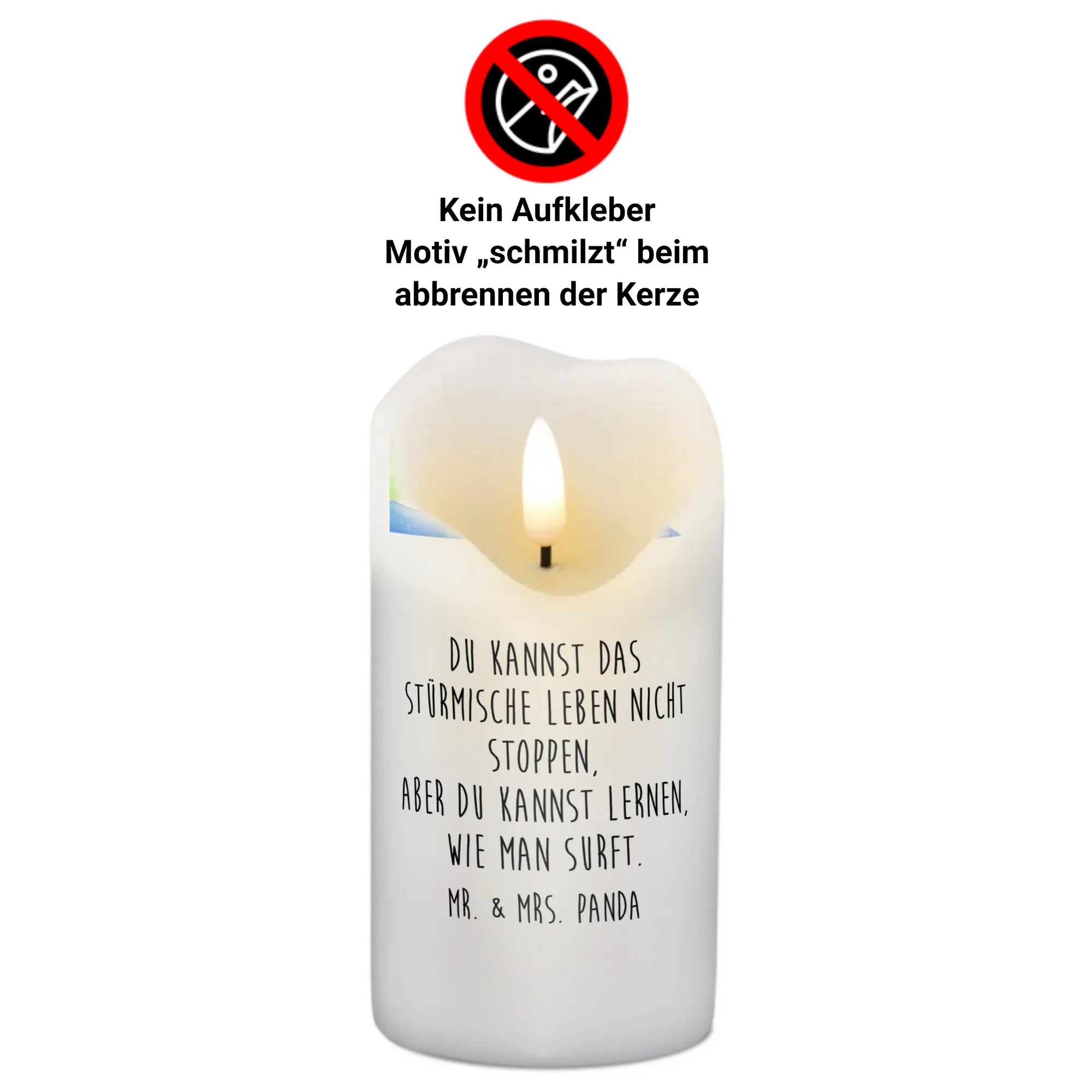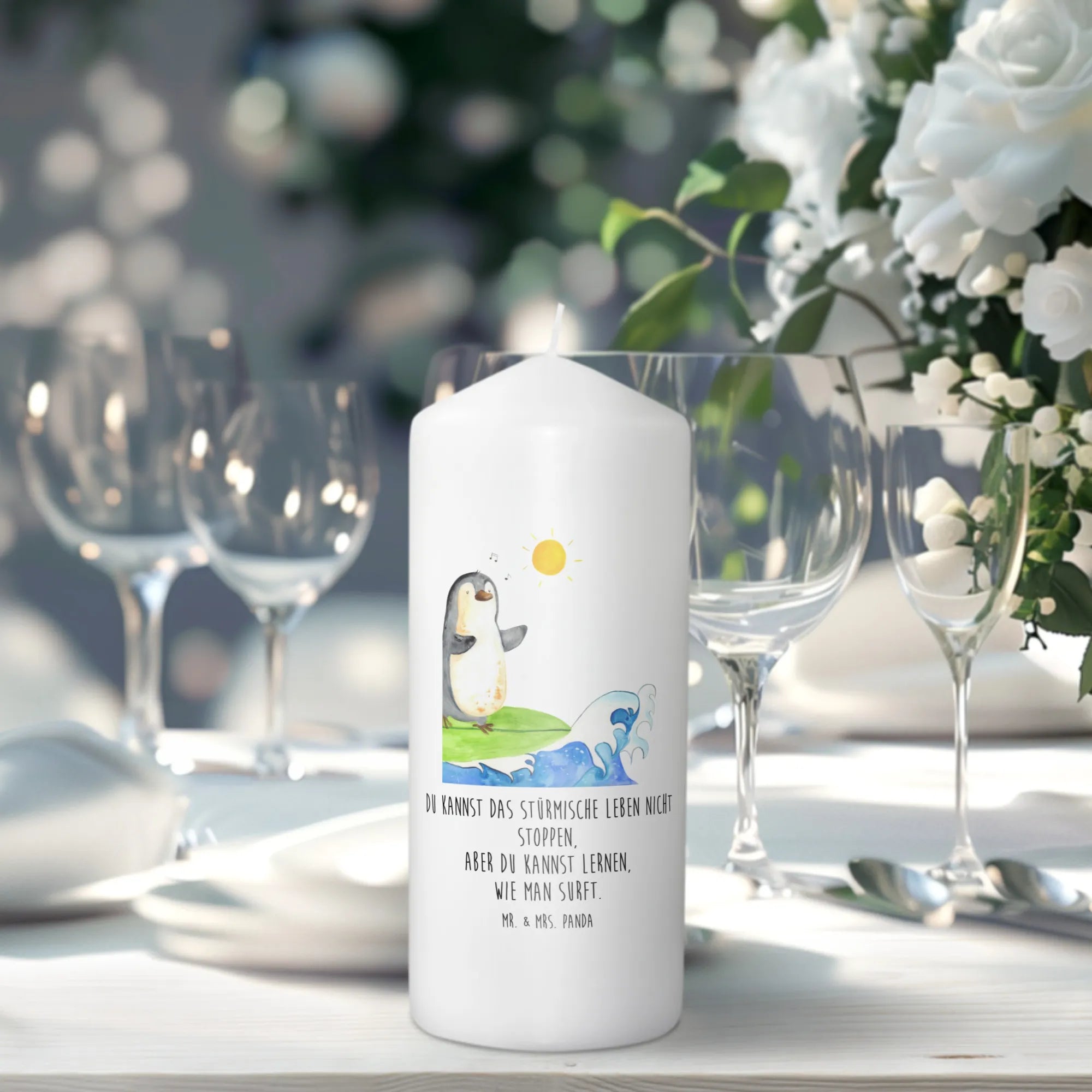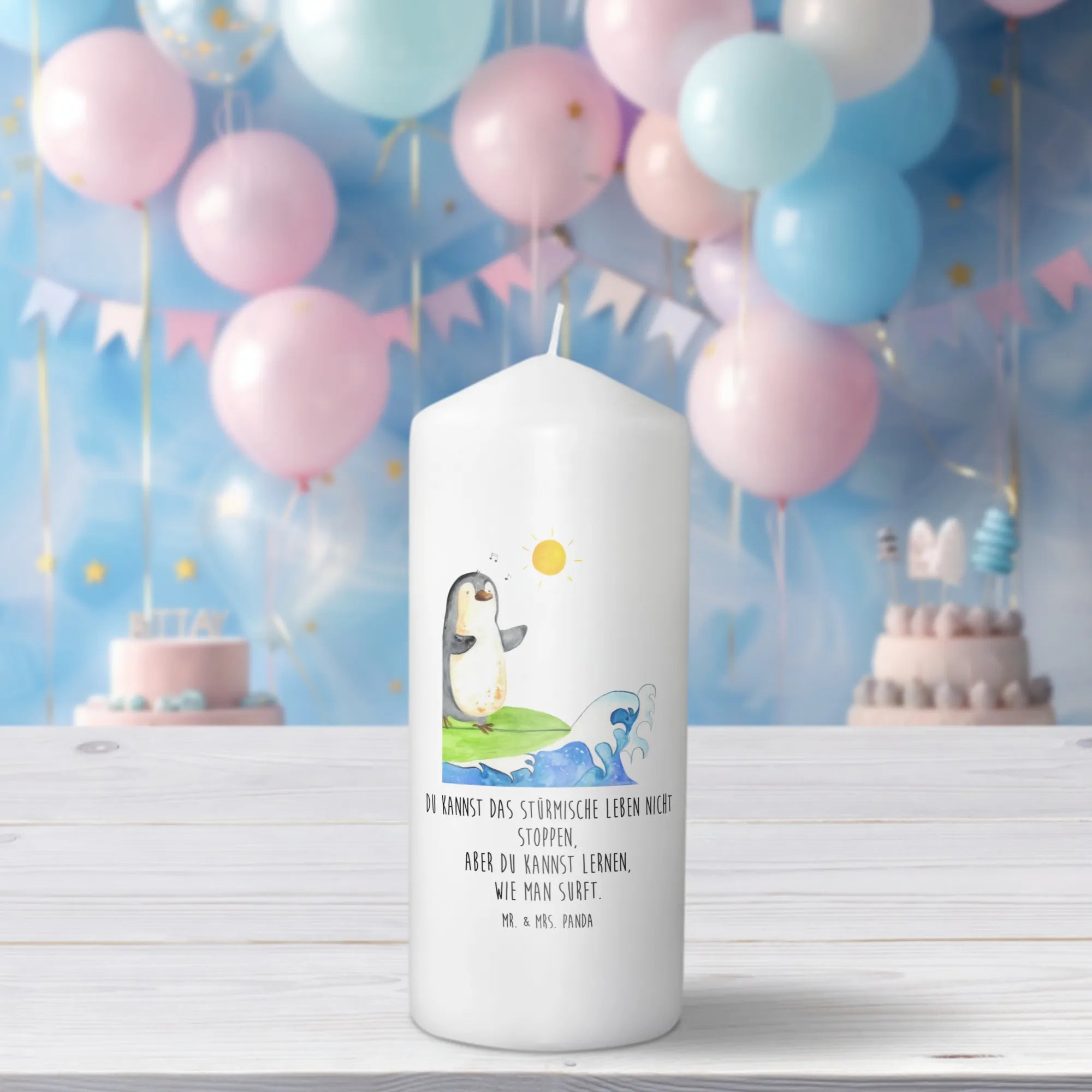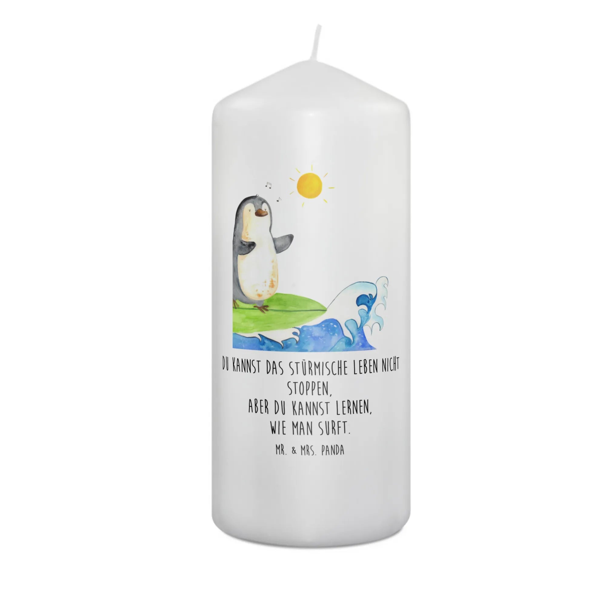 Die Pinguin Surfer Kerze von Mr. & Mrs. Panda ist das perfekte Geschenk für jeden Anlass! Ob zur Taufe, Kommunion oder als Geburtstagsgeschenk – diese Kerze wird garantiert Freude bereiten. Mit einem einzigartigen Motiv eines coolen Pinguins auf seinem Surfbrett, der entspannt über die Wellen gleitet, strahlt sie Lebensfreude und Abenteuerlust aus. Darüber hinaus trägt der Slogan "Du kannst das stürmische Leben nicht stoppen, aber du kannst lernen, wie man surft." dazu bei, dass jeder beim Anzünden dieser freudigen Kerze inspiriert wird, das Leben in vollen Zügen zu genießen.