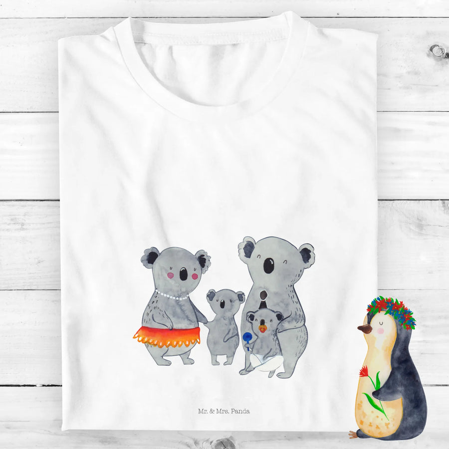 Auf dem T-Shirt sind zwei große Koalas und zwei kleine Koalas zu sehen, die ganz menschliche Züge und dreidimensionale Accessoires tragen. Diese Kreation von Mr. & Mrs. Panda vermittelt eine warme und einladende Atmosphäre, perfekt für Geschwister, Mama, Papa, Opa und Oma. Ein ideales Geschenk zum Vatertag, Muttertag oder einfach als süße Überraschung für Deine Liebsten.
