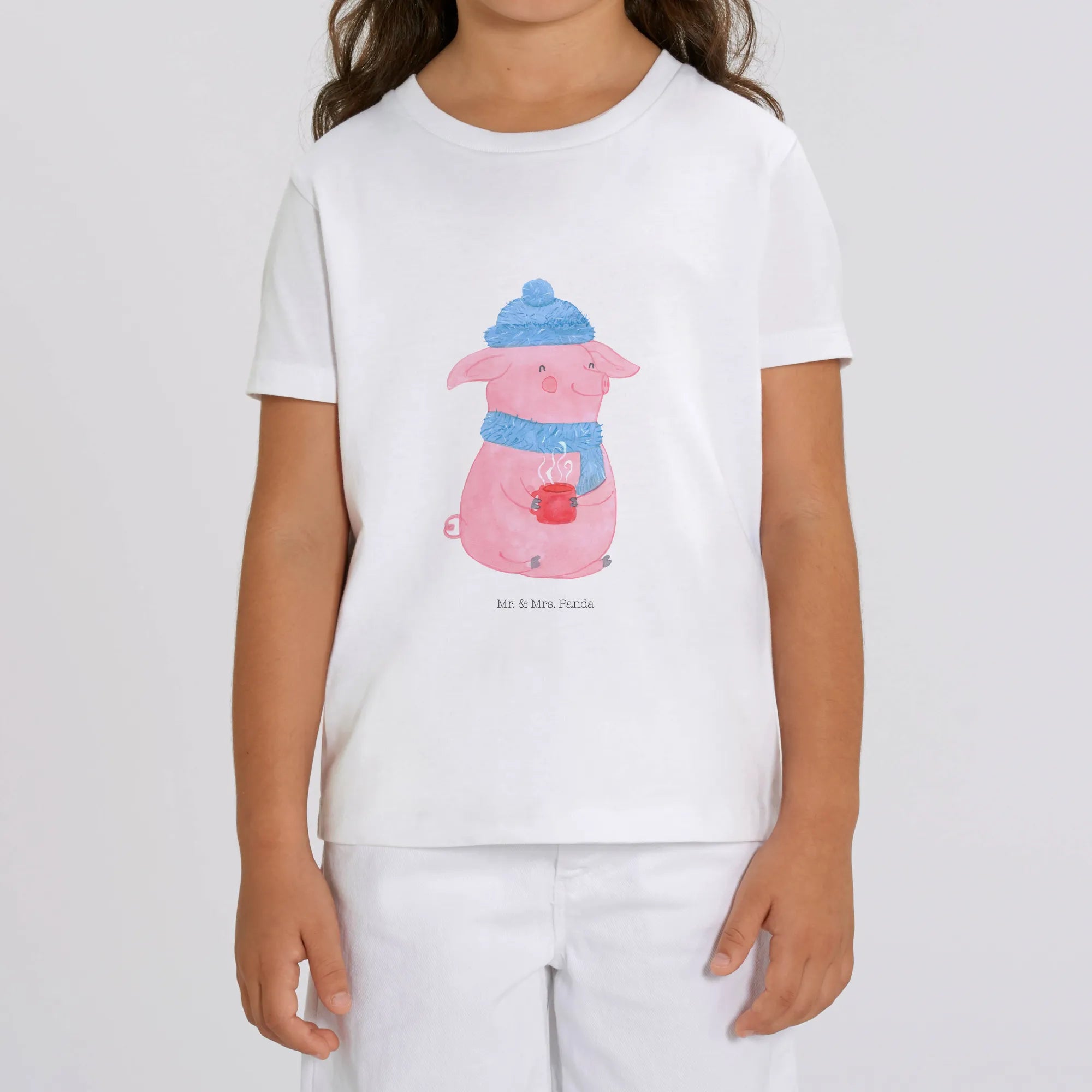 Die fröhlichen Elemente des Designs, wie das lächelnde, winterlich gekleidete Schwein mit der blauen Mütze und dem Schal, sowie die festliche Tasse, die an ein leckeres Heißgetränk erinnert, sind ideal für Kinder von 3 bis 14 Jahren. Dieses T-Shirt ist nicht nur ein modisches Statement, sondern bringt auch ausgelassene Freude in die Winterzeit!