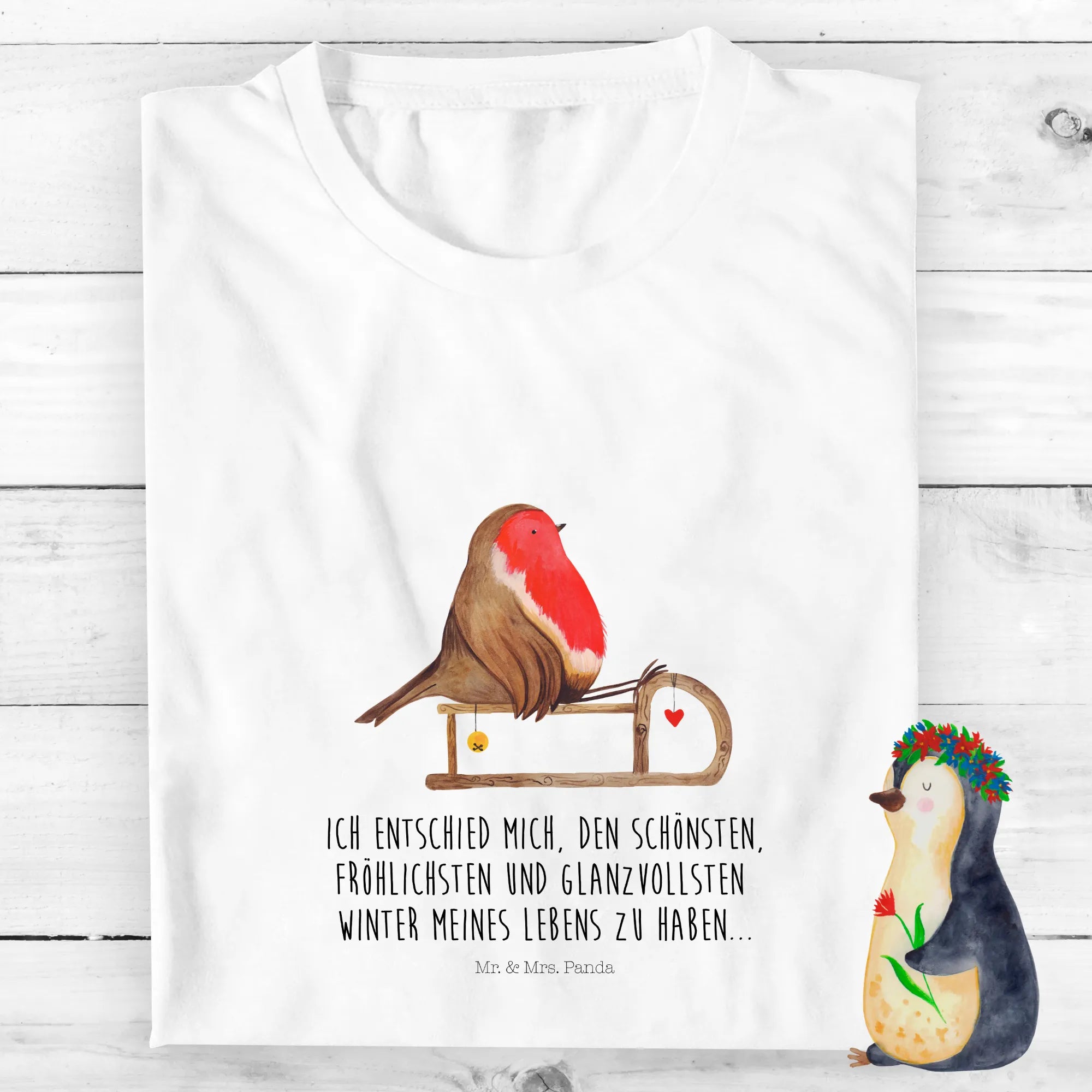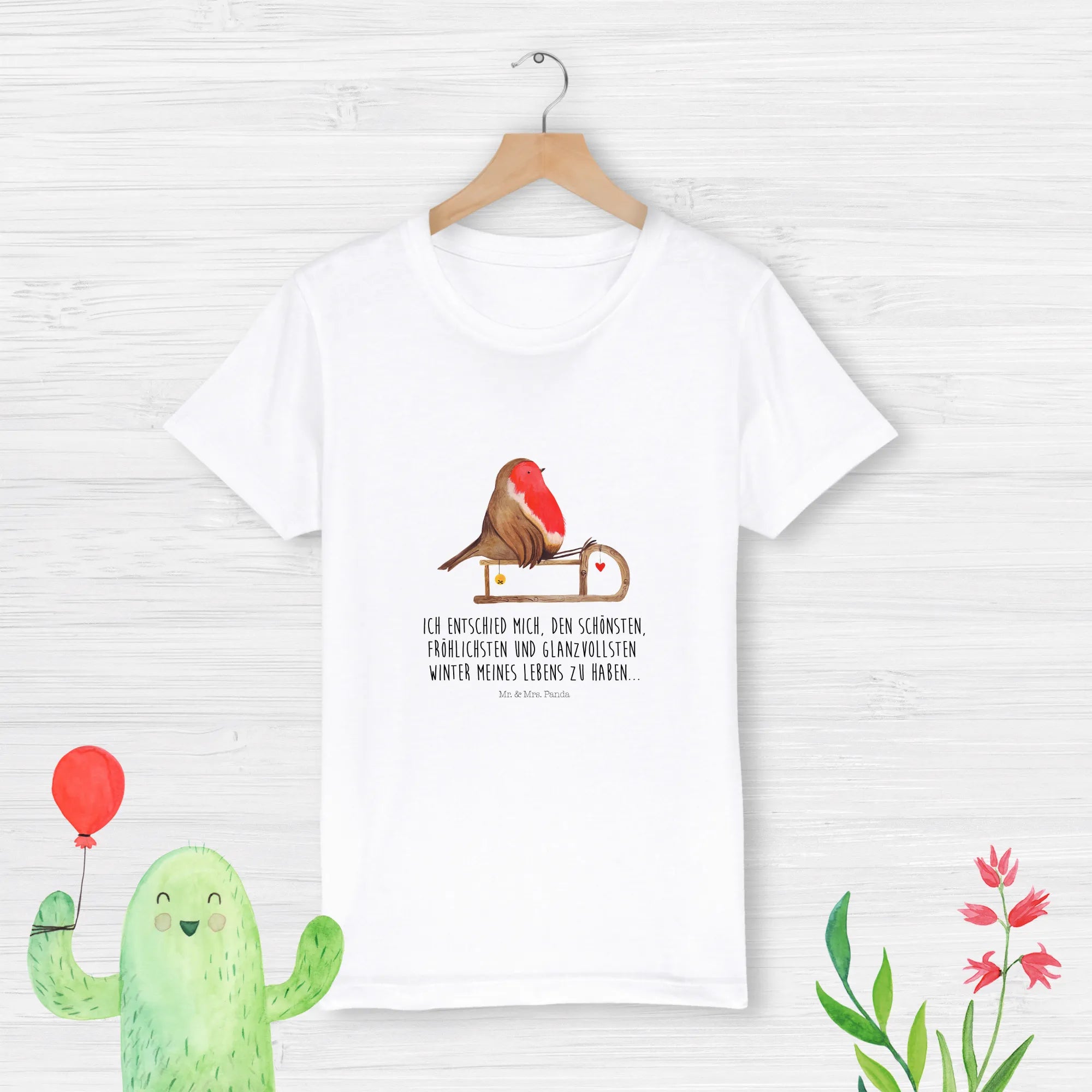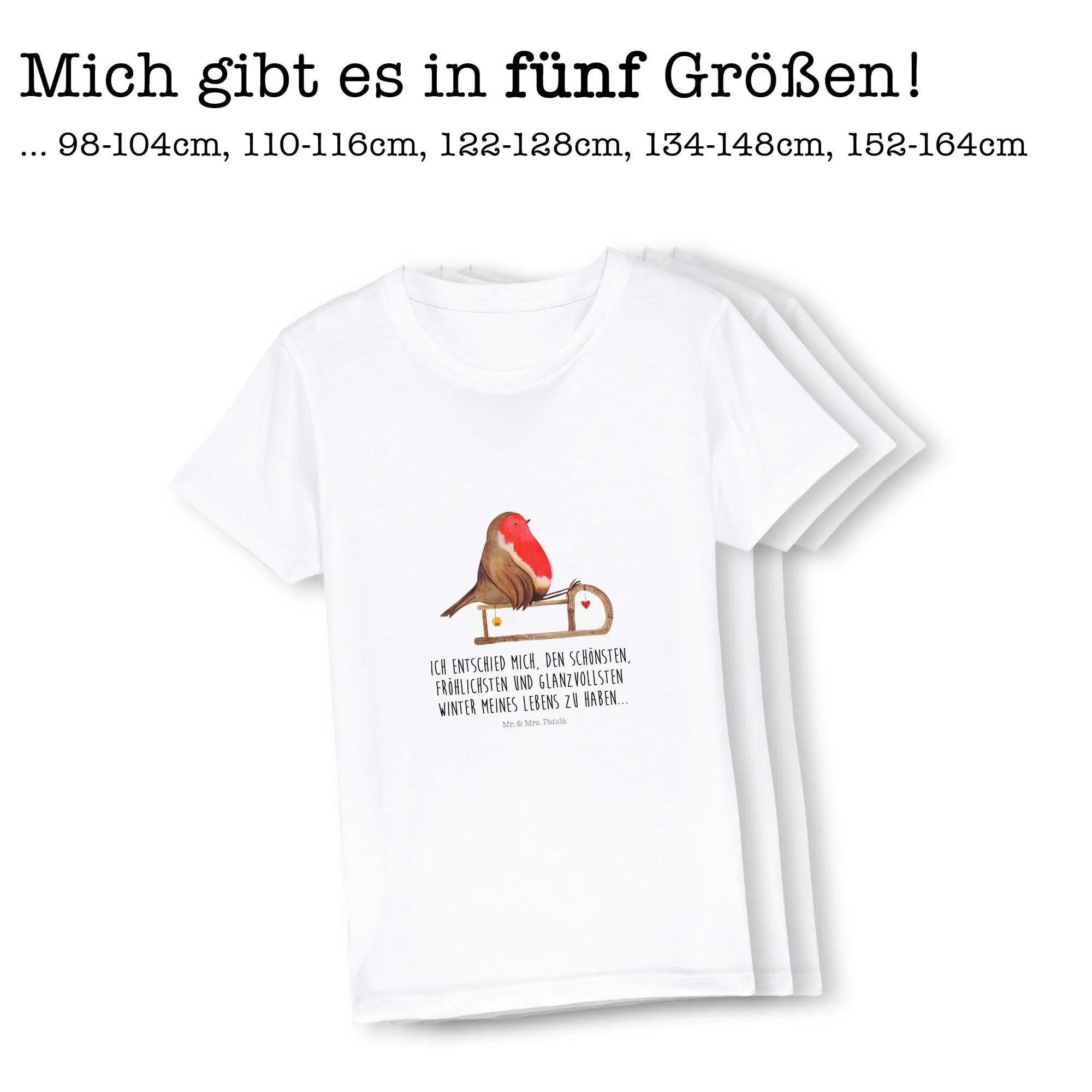 Das niedliche Rotkehlchen, das auf einem Holzschlitten sitzt, wurde liebevoll von Mrs. Panda handgezeichnet und verleiht dem T-Shirt einen besonderen Charme. Ob beim Spielen im Schnee oder beim Weihnachtsmarktbesuch, in diesem T-Shirt wird sich jedes Kind rundum wohlfühlen! Es ist in verschiedenen Größen erhältlich, sodass Du ganz leicht das passende für Deine Kleinen findest.
