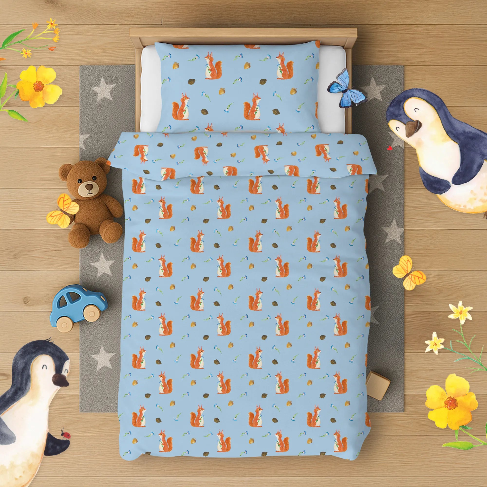Kinderbettwäsche Eichhörnchen Blume Muster
