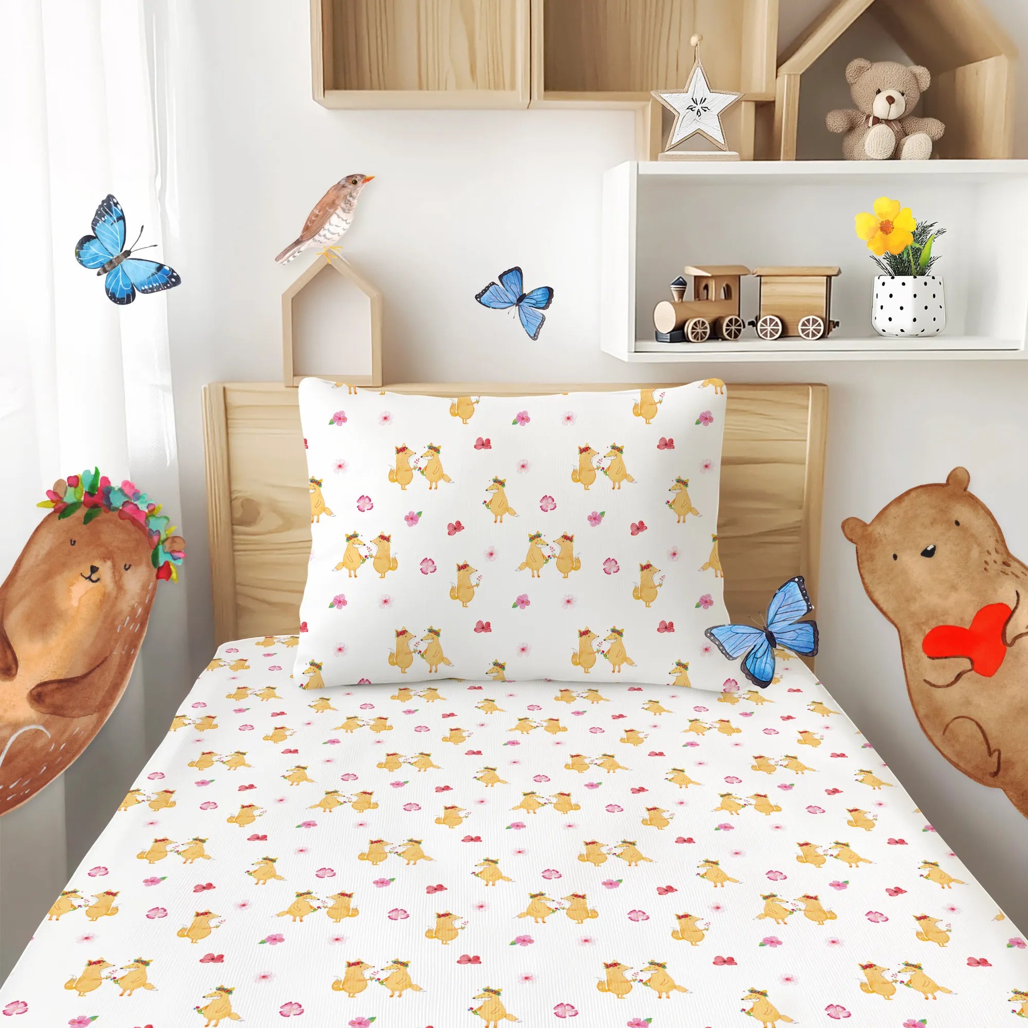 Schenke Freude, Geborgenheit und ein kleines Stück Zauber mit der Kinderbettwäsche „Fuchs Blumenliebe“ von Mr. & Mrs. Panda.