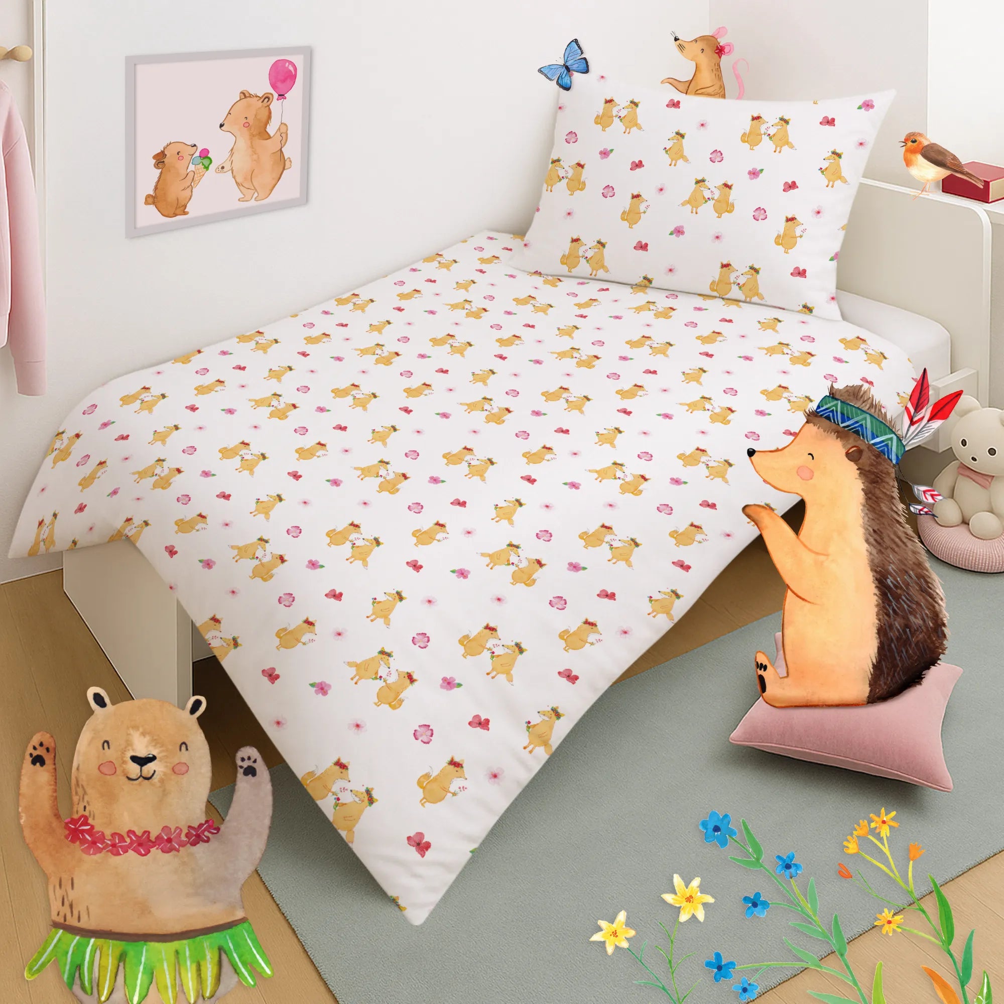 Kinderbettwäsche Fuchs Blumen Muster