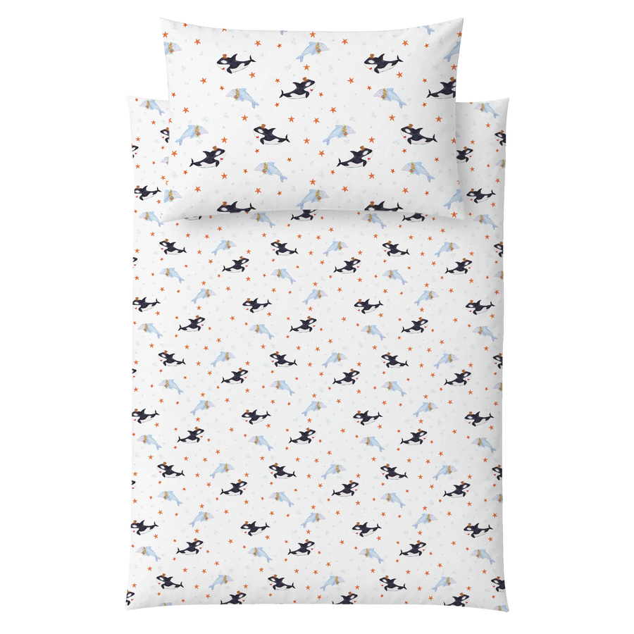 Warum diese Bettwäsche? Weil sie Träume von Meer, Urlaub und kleinen Festen ins Kinderzimmer bringt. Weil sie Glitzer, Konfetti und einen frechen Orca mit Zylinder vereint. Und weil sie als Geschenk zur Geburt, Taufe, Einschulung oder zum Geburtstag jedes Kinderherz höherschlagen lässt.