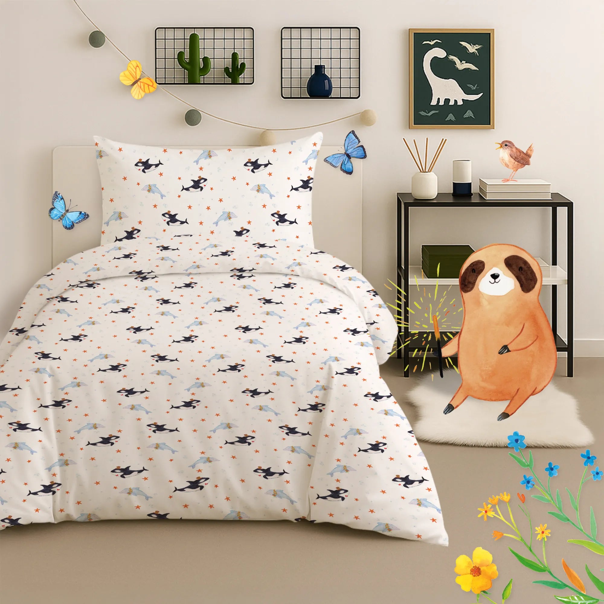 Mr. & Mrs. Panda Kinderbettwäsche „Orca Zylinder“ – ein fröhliches Motiv aus unserer Meerestiere-Kollektion, das Kinderzimmer in eine bunte Unterwasserwelt verwandelt. Auf der Bettwäsche siehst du einen freundlich wirkenden Orca mit weißem Bauch und schwarzem Rücken, der einen verspielten Zylinder mit Blumen trägt. Ein kleiner roter Fisch neben seiner Wange sorgt für zusätzlichen Charme. Der Slogan „Konfetti und Glitzer für alle!“ macht das Motiv zur perfekten Wahl für Geburtstage, Feiern und zauberhafte Gute-Nacht-Rituale.