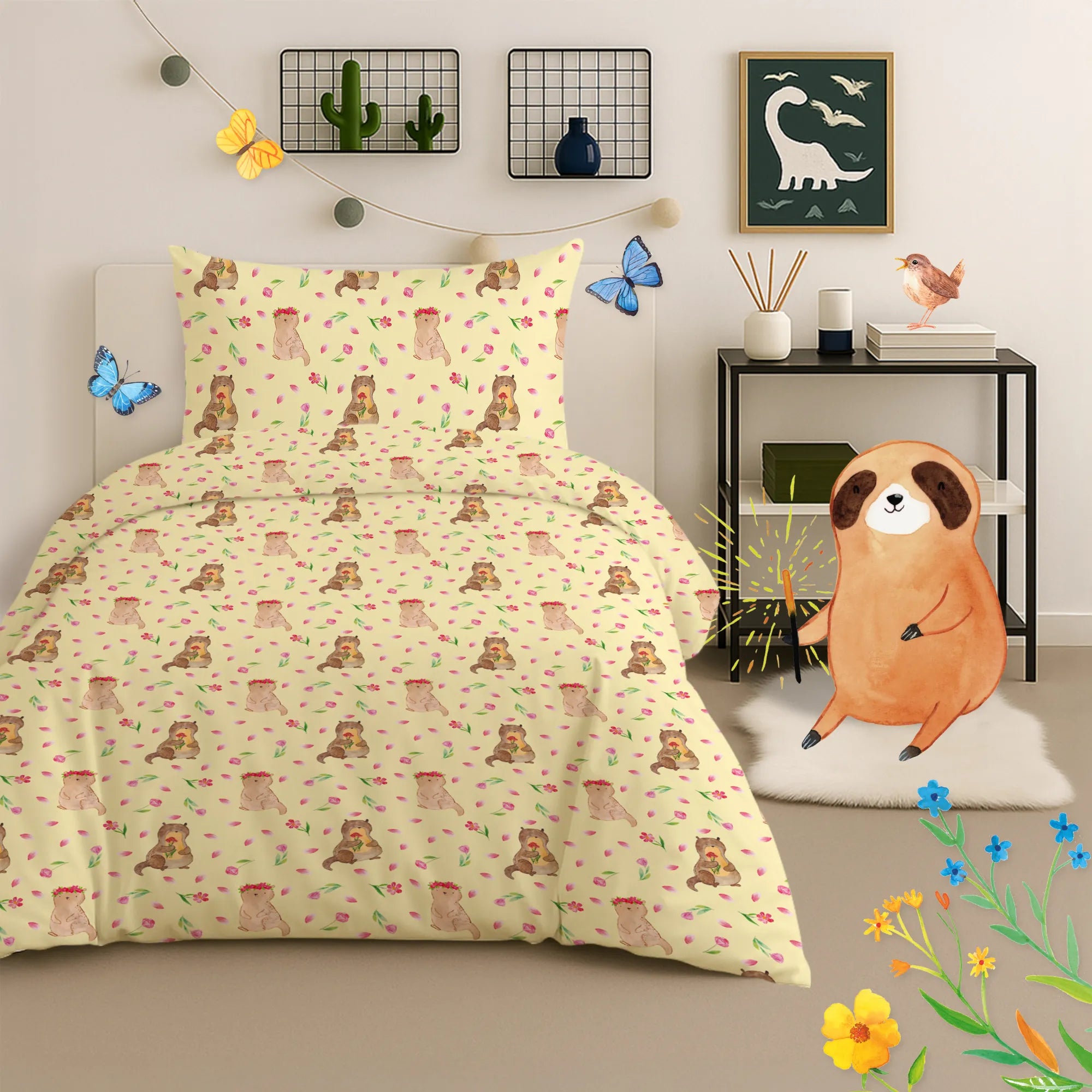 Unsere kuschelige Kinderbettwäsche „Otter Blumenstrauß“ bringt sonnige Stimmung direkt in das Kinderzimmer. Auf einem warmen Gelb sitzt ein niedlicher Seeotter mit einem bunten Blumenstrauß und lädt zum Träumen ein. Mrs. Panda hat das Motiv mit Aquarell liebevoll gestaltet, sodass jede Nacht ein bisschen wie ein kleines Abenteuer wirkt.
