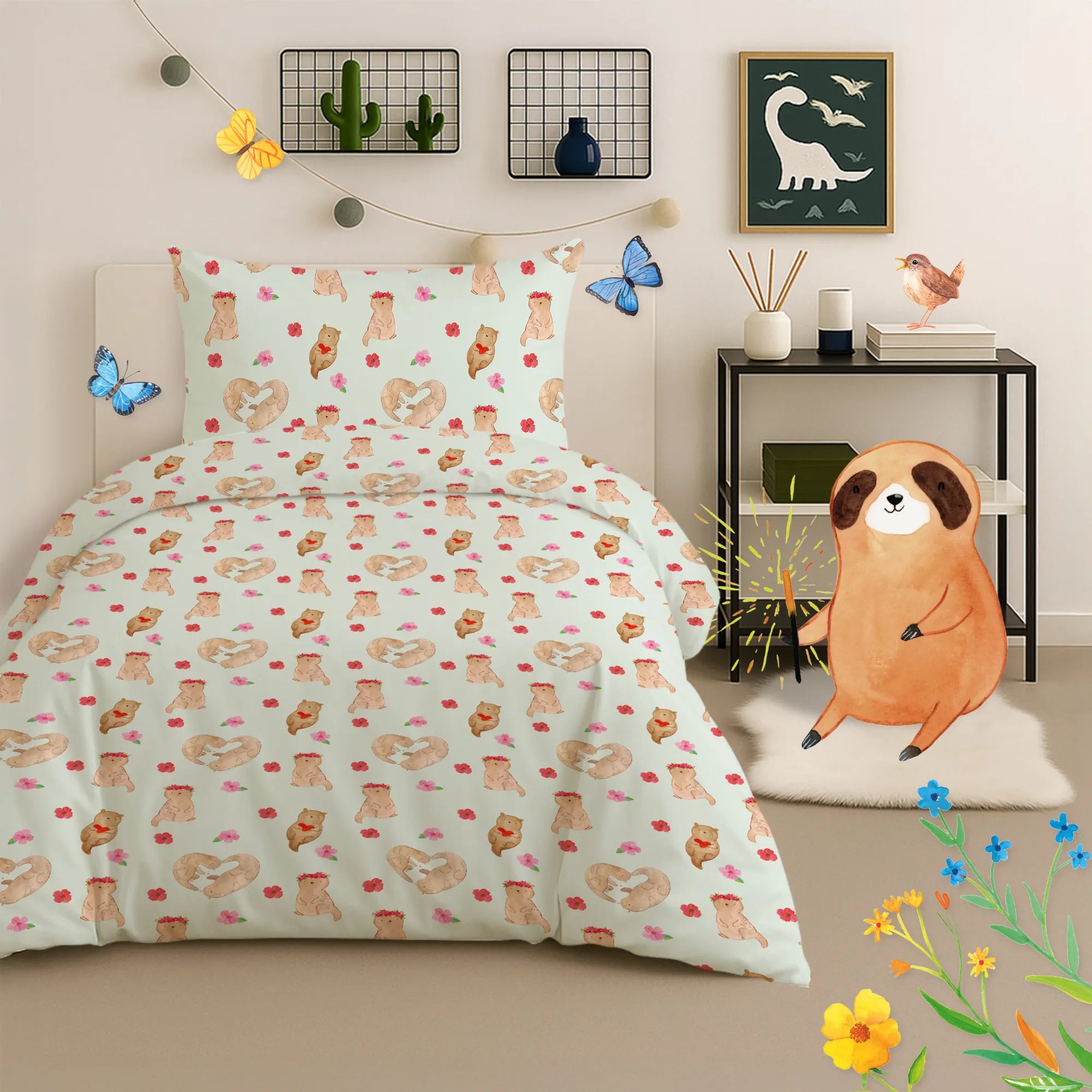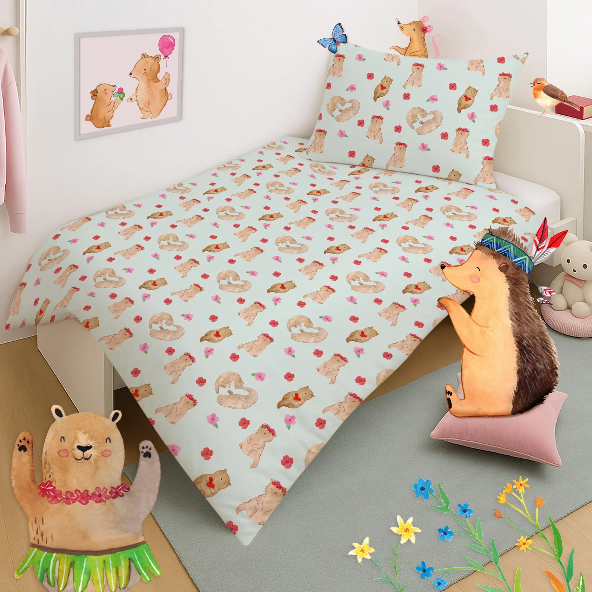 Die Otter - Kollektion von Mr. & Mrs. Panda steht für liebevolle Illustrationen und fröhliche Sprüche. Diese Kinderbettwäsche ist nicht personalisierbar, dafür aber besonders liebevoll gefertigt: speziell auf Bestellung angefertigt und von Hand genäht.