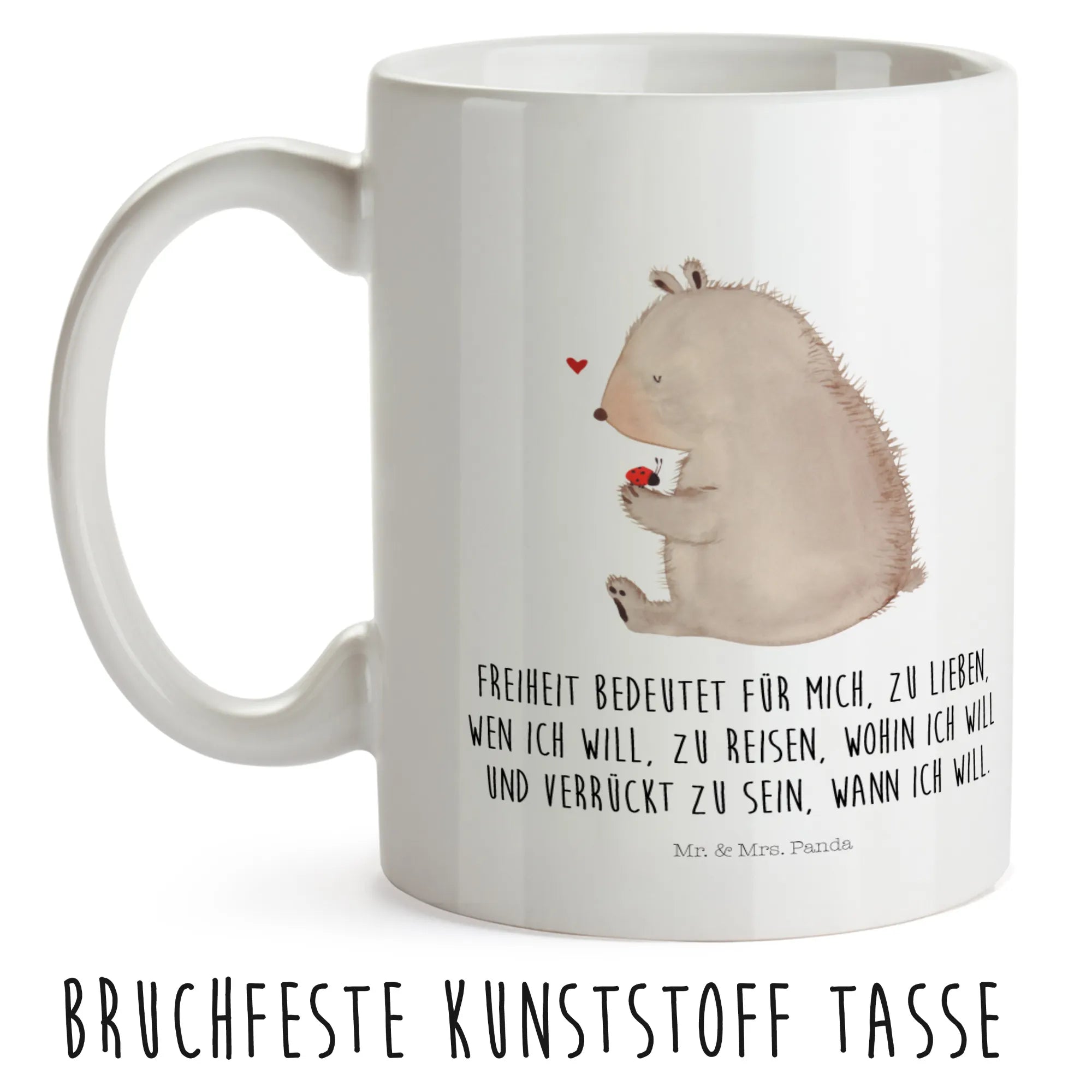 Die farbenfrohe Kindertasse mit dem süßen Bär und Marienkäfer Motiv von Mr. & Mrs. Panda ist der perfekte Begleiter für die kleinen Abenteurer in deinem Leben. Diese Kindertasse bringt nicht nur Freude, sondern auch ein Stück Freiheit auf jeden Tisch. Der slogan "Freiheit bedeutet für mich, zu lieben, wen ich will, zu reisen, wohin ich will und verrückt zu sein, wann ich will" inspiriert Kinder, ihrer Fantasie freien Lauf zu lassen.