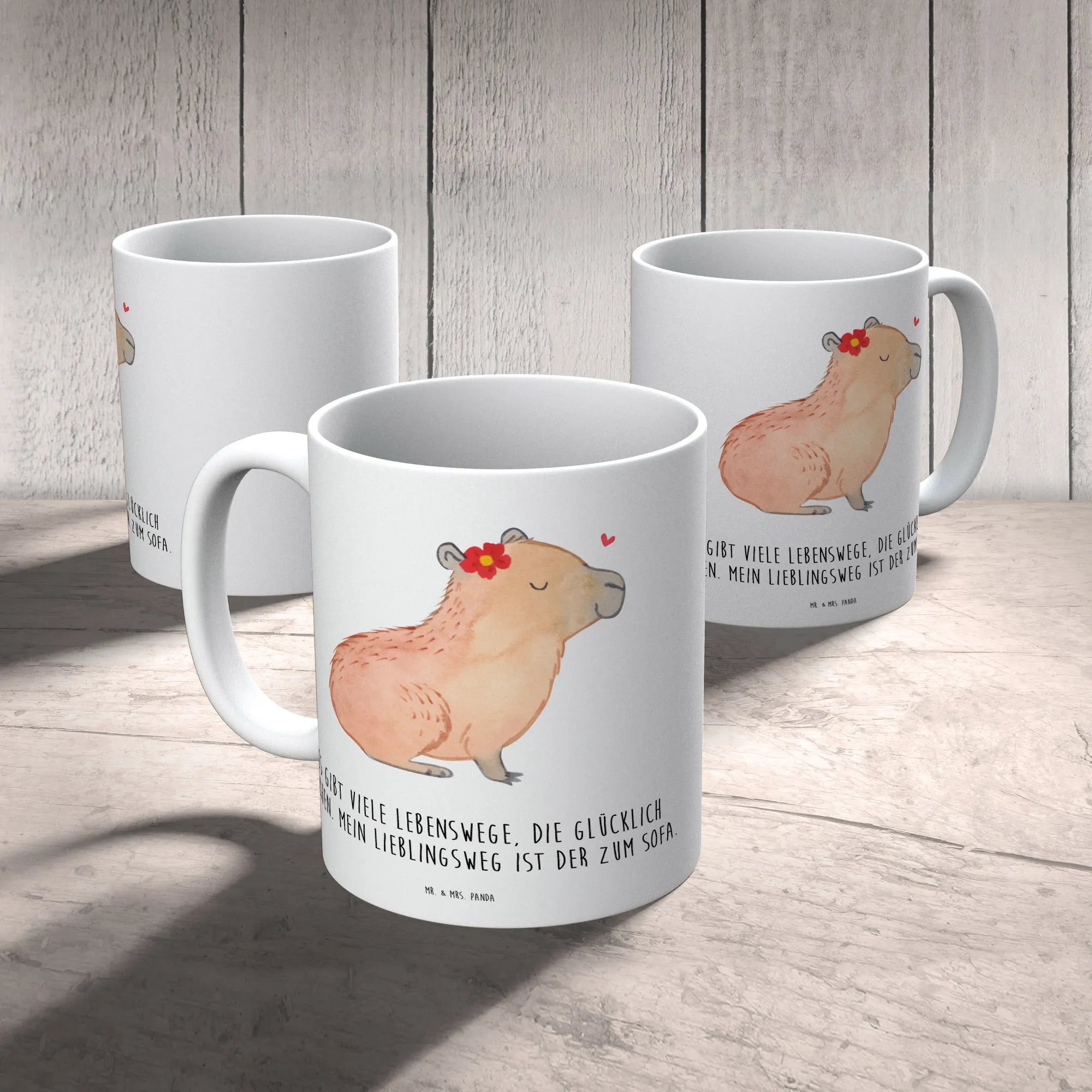 In der gemütlichen Welt von Mr. & Mrs. Panda gibt es viele kleine Momente des Glücks zu entdecken. Auf diesem liebevollen Motiv findest du ein friedvolles Capybara, das mit geschlossenen Augen und einem sanften Lächeln pure Entspannung ausstrahlt. Das Highlight ist die verspielte rote Blume mit gelber Mitte, die frech auf seinem Kopf thront und dem Tier einen zauberhaften Ausdruck verleiht. Ein kleines Herz über dem Capybara rundet die liebevolle Szenerie ab und bringt die besondere Wärme des Moments zur Geltung. Die Illustration ist warm und sanft coloriert, was die beruhigende Ausstrahlung noch verstärkt. Der Spruch 'Es gibt viele Lebenswege, die glücklich machen. Mein Lieblingsweg ist der zum Sofa.' passt perfekt zu der friedlichen Atmosphäre und entführt dich auf einen entspannten Weg voller einfach zu findendem Glück.