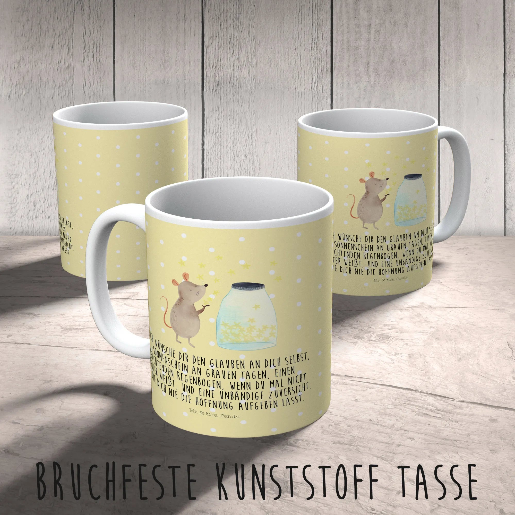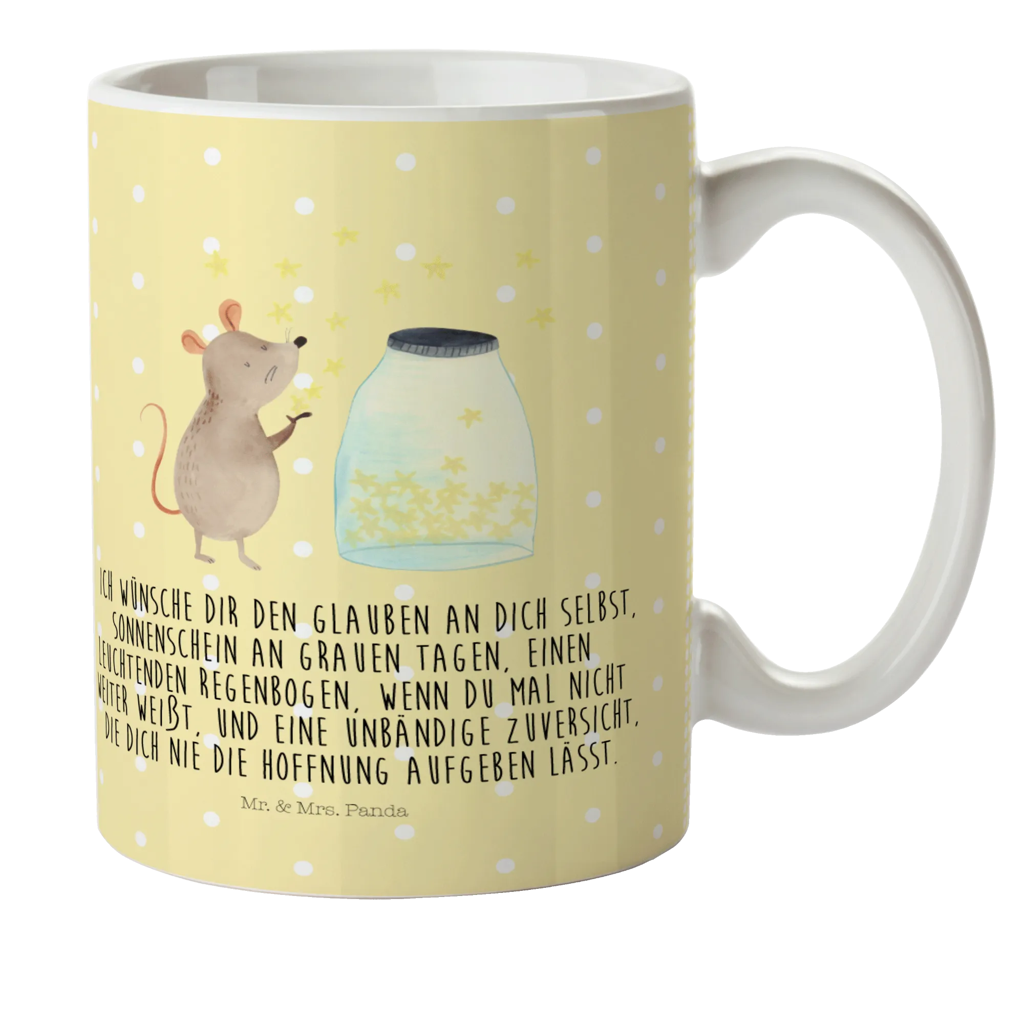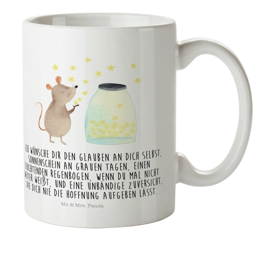 Die kleine Maus träumt vor einem Glas funkelnder Sterne und entführt dich in eine magische Welt voller Hoffnung und Träume. Mit ihrem strahlenden Design und dem aufmunternden Slogan "Ich wünsche dir den Glauben an dich selbst..." bringt die Tasse gute Laune in jeden Frühstücks- und Kaffeetisch.