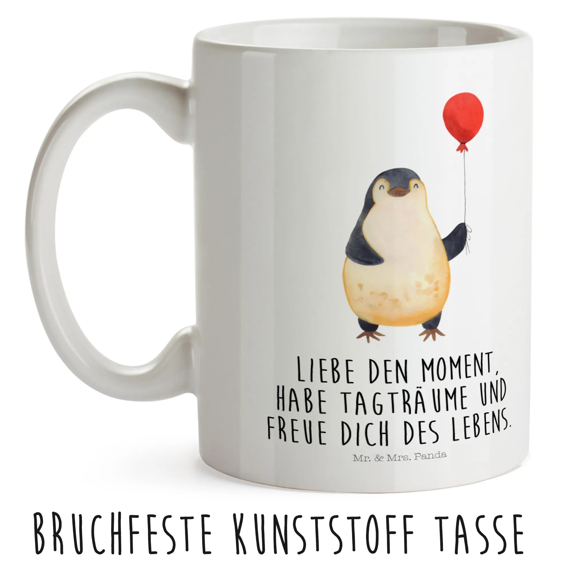 Du suchst das perfekte Geschenk für dein Kind oder die beste Freundin? Dann ist die Kindertasse mit dem niedlichen Pinguin Luftballon von Mr. & Mrs. Panda genau das Richtige! Diese wunderbare Kunststofftasse ist nicht nur ein praktischer Begleiter im Kindergarten, sondern auch ein liebevolles und motivierendes Geschenk. Der süße Pinguin, der einen bunten Luftballon in der Hand hält, bringt jeden zum Schmunzeln und verbreitet Lebenslust und Freude. Mit dem Slogan 'Liebe den Moment, habe Tagträume und freue dich des Lebens!' wird jedes Trinken zu einem besonderen Erlebnis.