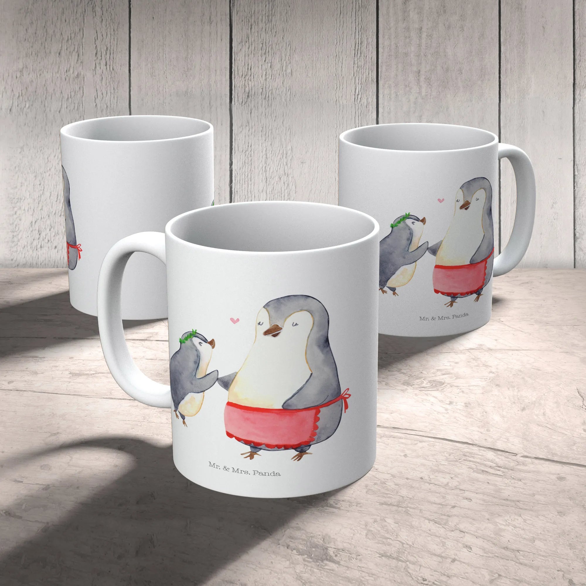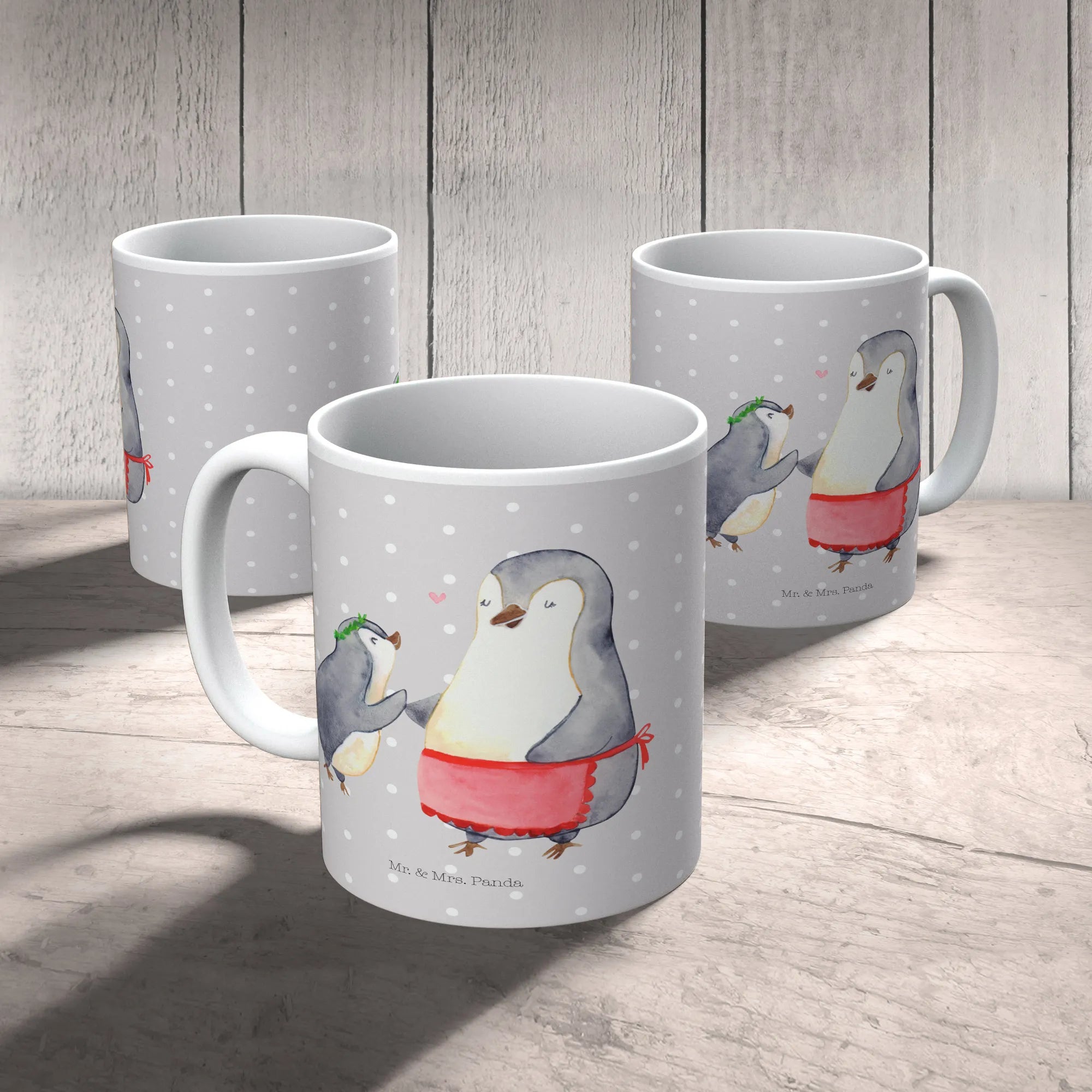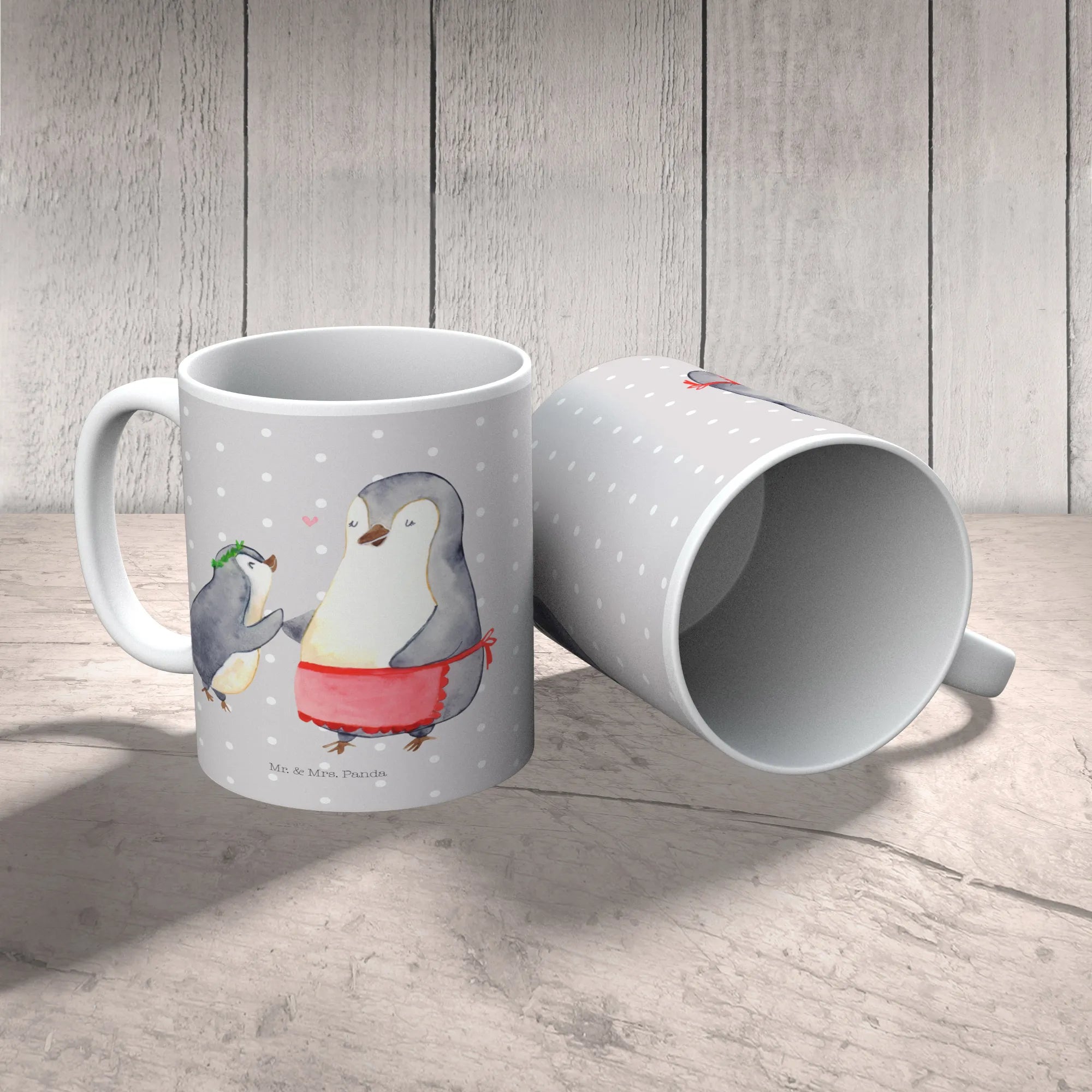 Das liebevoll gestaltete Motiv zeigt einen großen Pinguin in einer roten Schürze, der fürsorglich auf sein Kind herabblickt, und ein kleines Herz, das die besondere Verbindung zwischen ihnen symbolisiert. So eine Tasse bringt nicht nur Freude, sondern auch die Botschaft, wie wichtig Mütter für ihre Kinder sind.