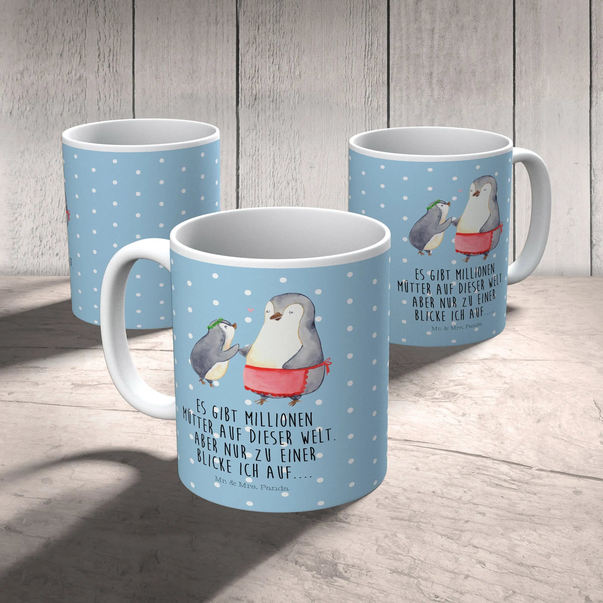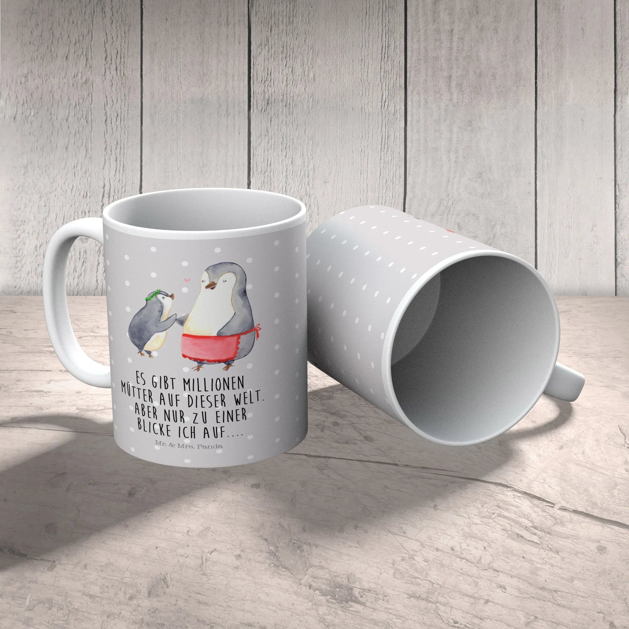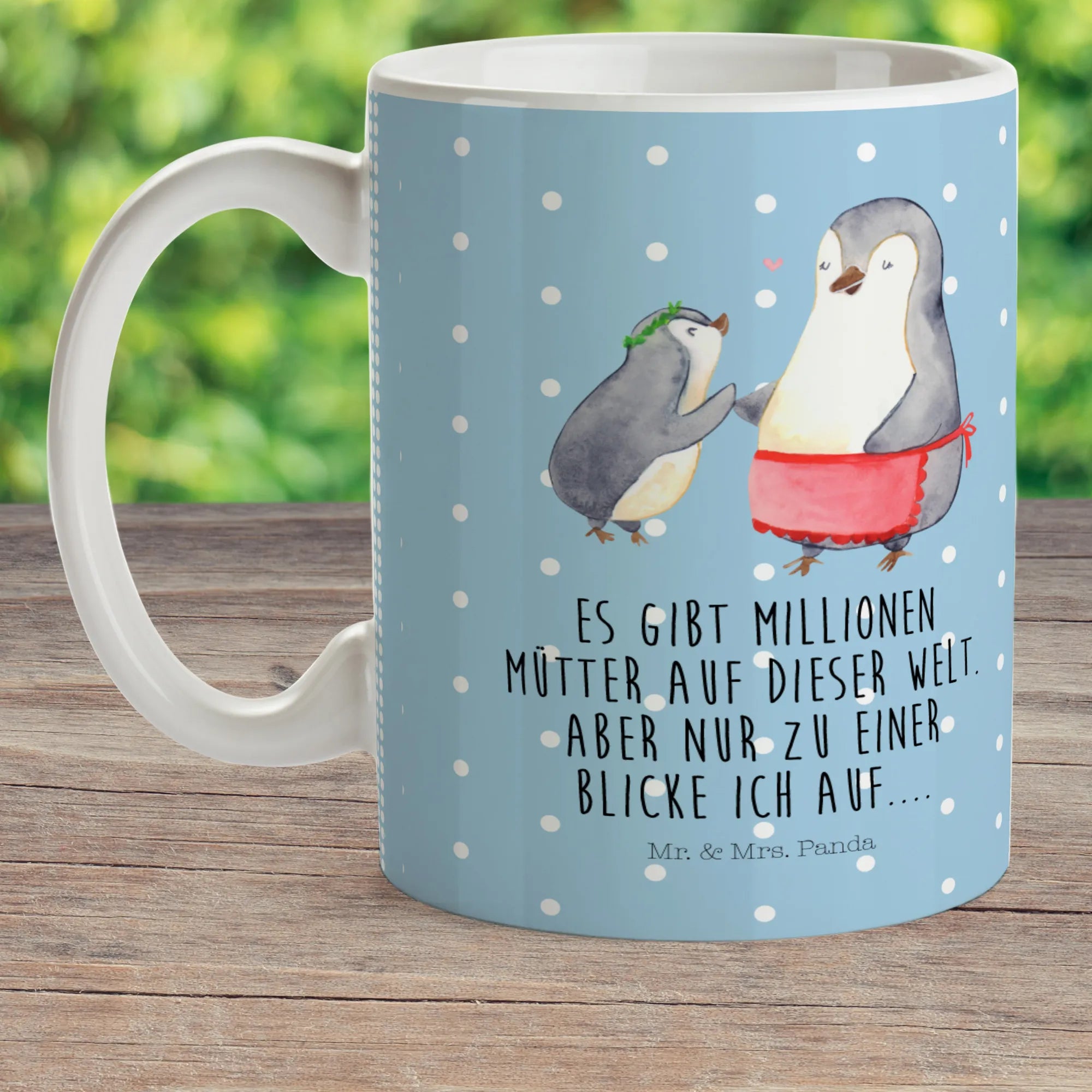 Das fröhliche Pinguin-Design zeigt einen liebevollen Pinguin in roter Schürze, der sein Kind mit einem herzlichen Blick anstrahlt. Auf der Tasse steht der liebevolle Slogan: 'Es gibt Millionen Mütter auf dieser Welt. Aber nur zu einer blicke ich auf...' und macht sie zu einer besonderen und emotionalen Geschenkidee.