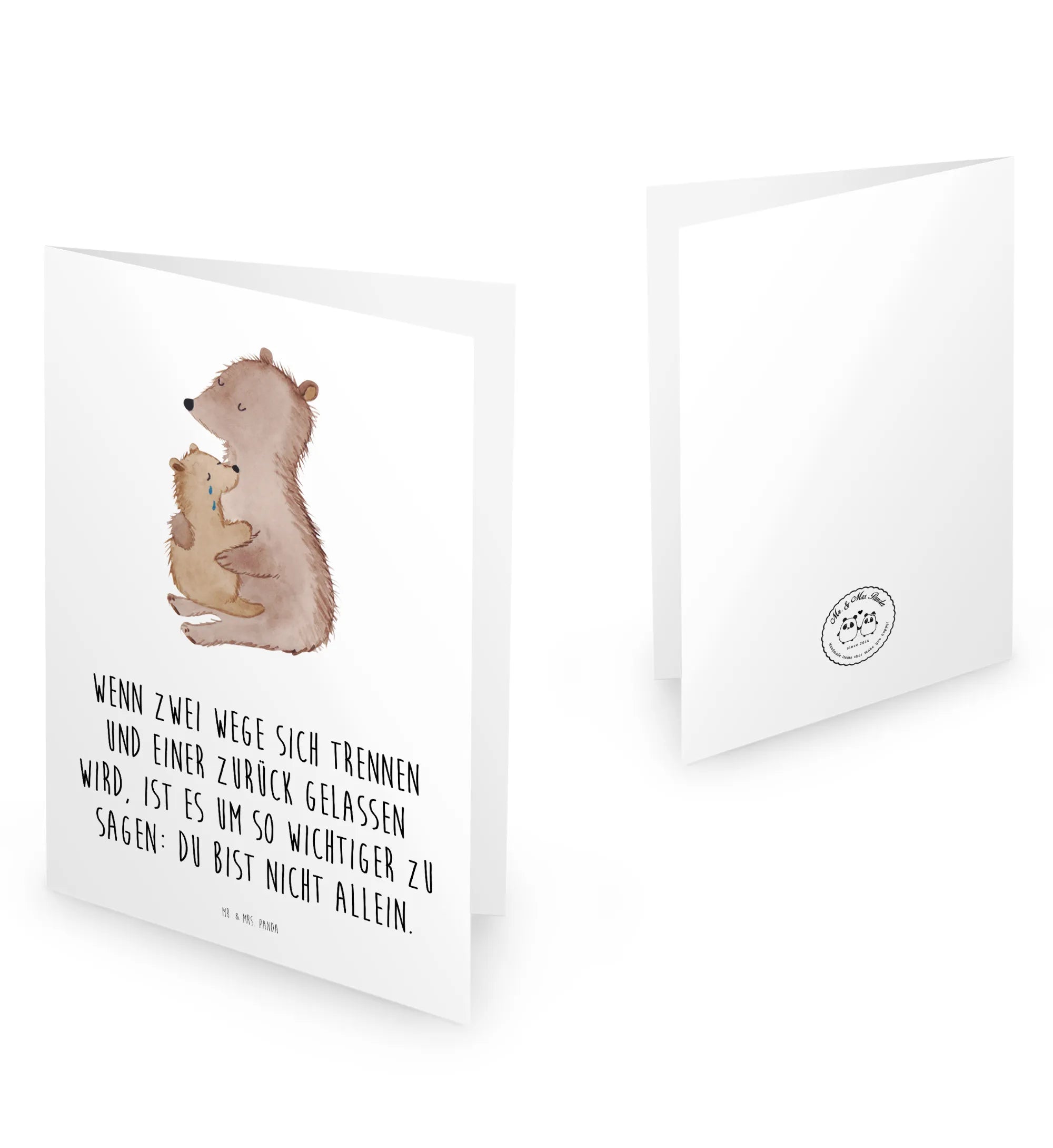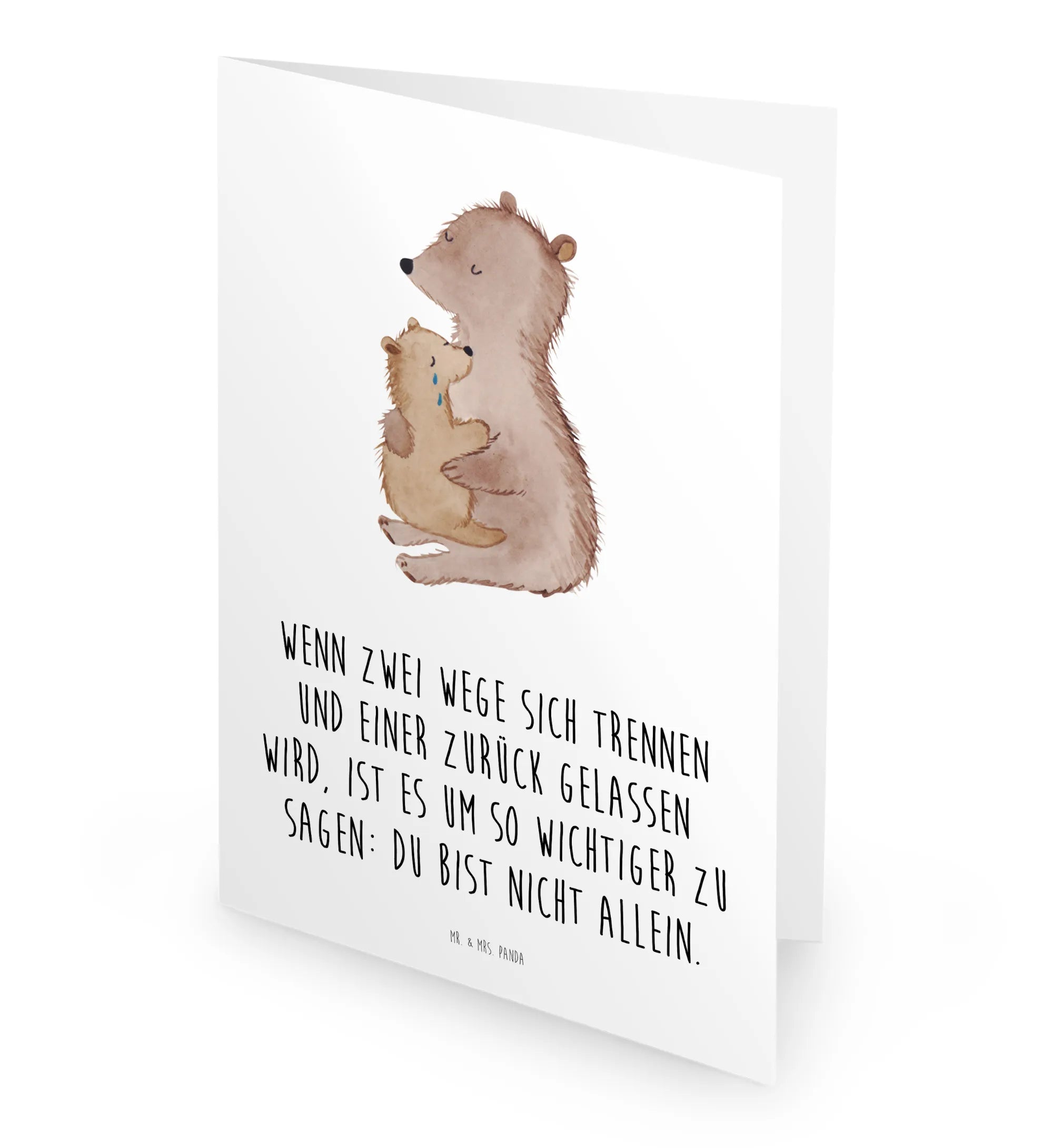 Diese Karte wurde sorgfältig entworfen und zeigt ein berührendes Motiv, das einen großen Bären zeigt, der einen kleinen Bären in seinen Armen hält, während dieser weint. Dieses Bild spricht Bände und vermittelt Trost in einer Zeit, in der Worte oft nicht genug sind.